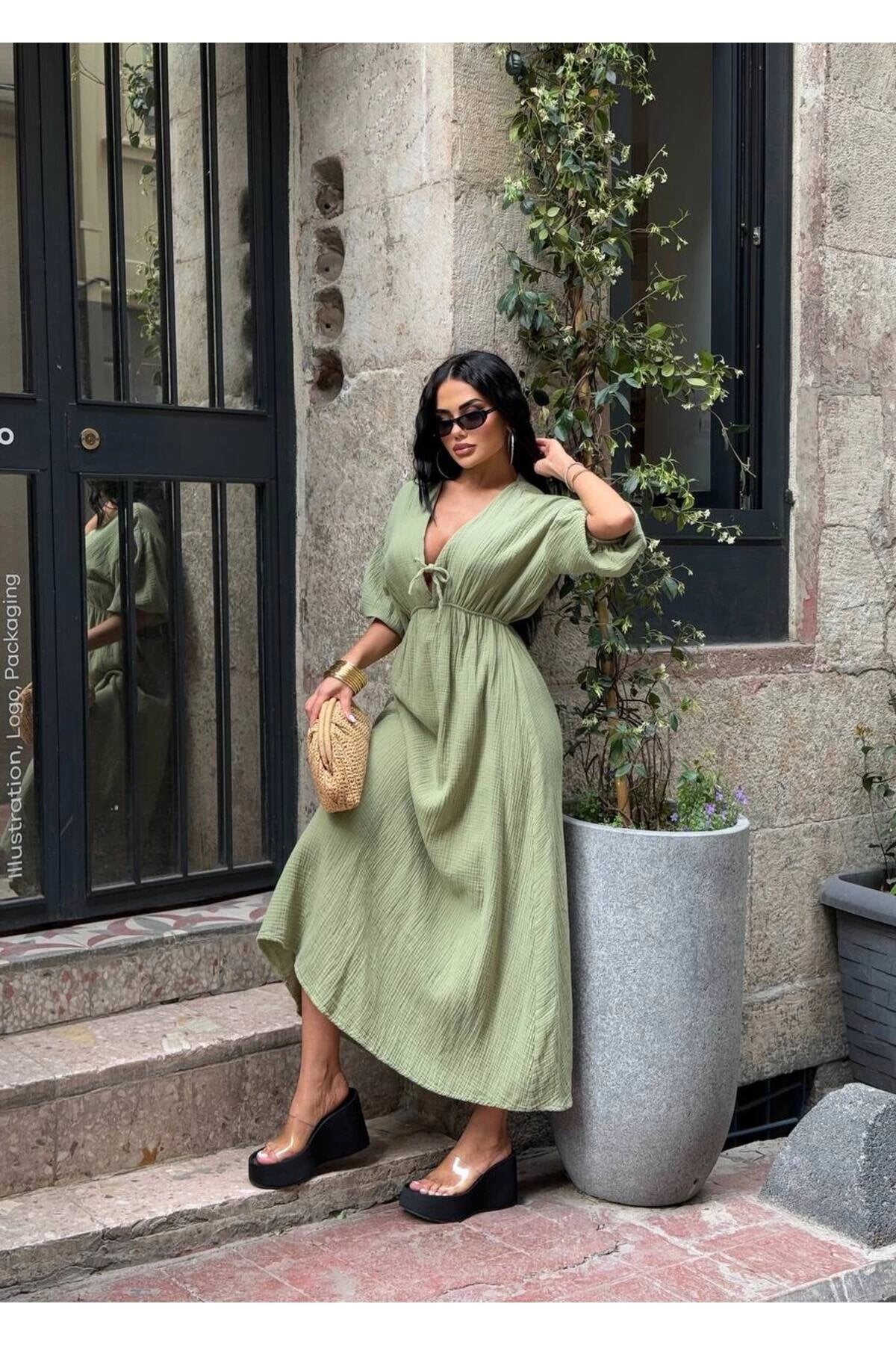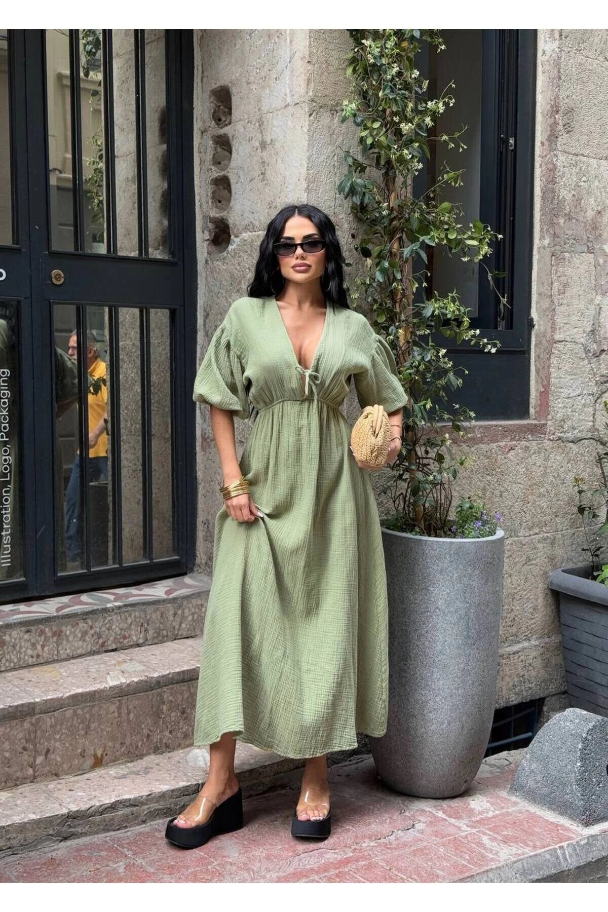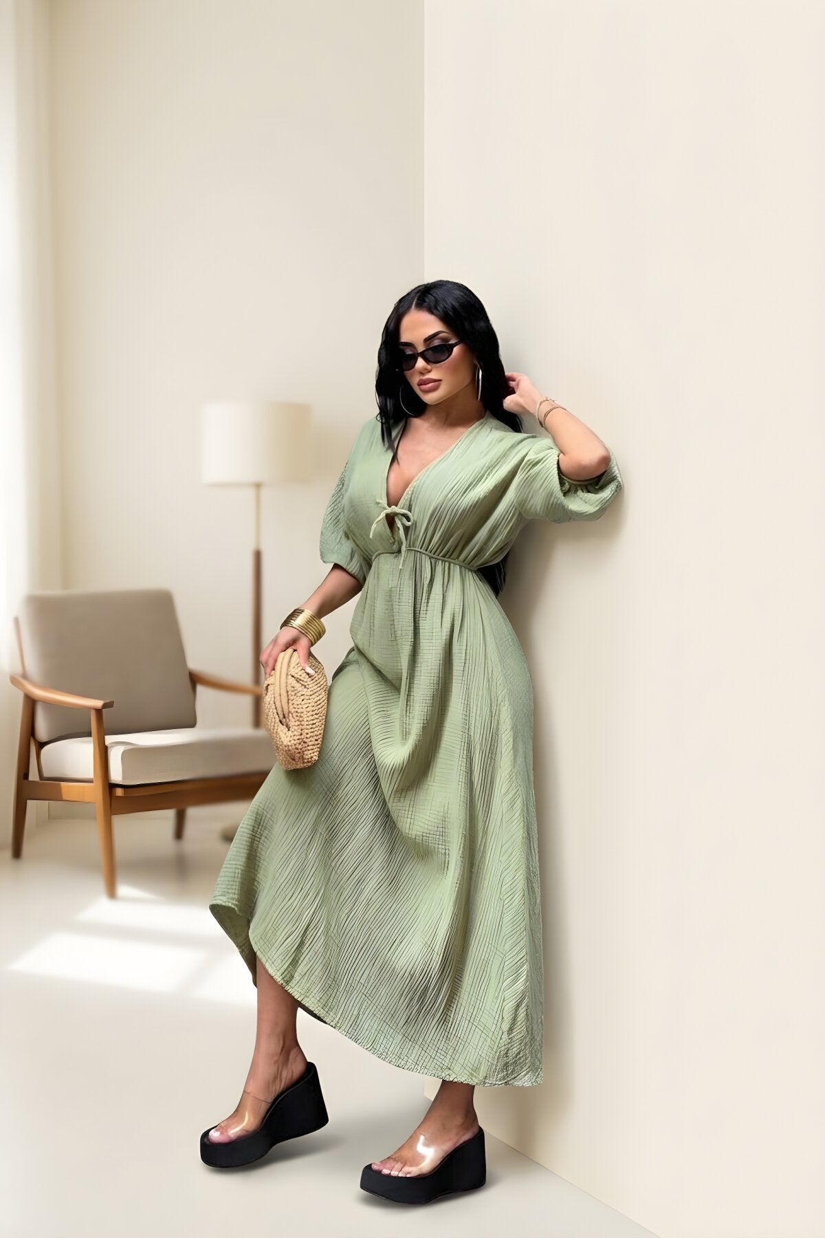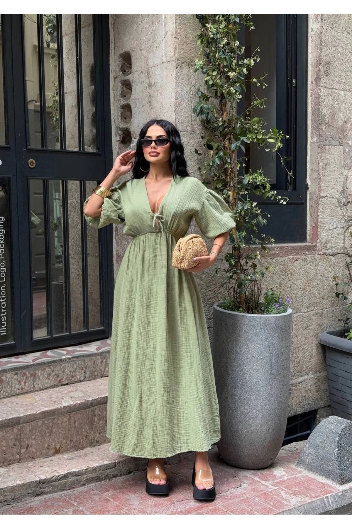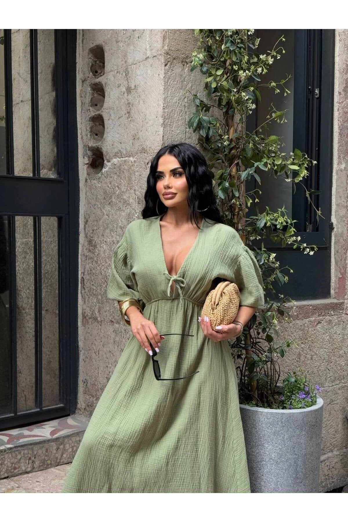 Long Muslin Linen V-Neck Gathered Waist Dress - Khaki