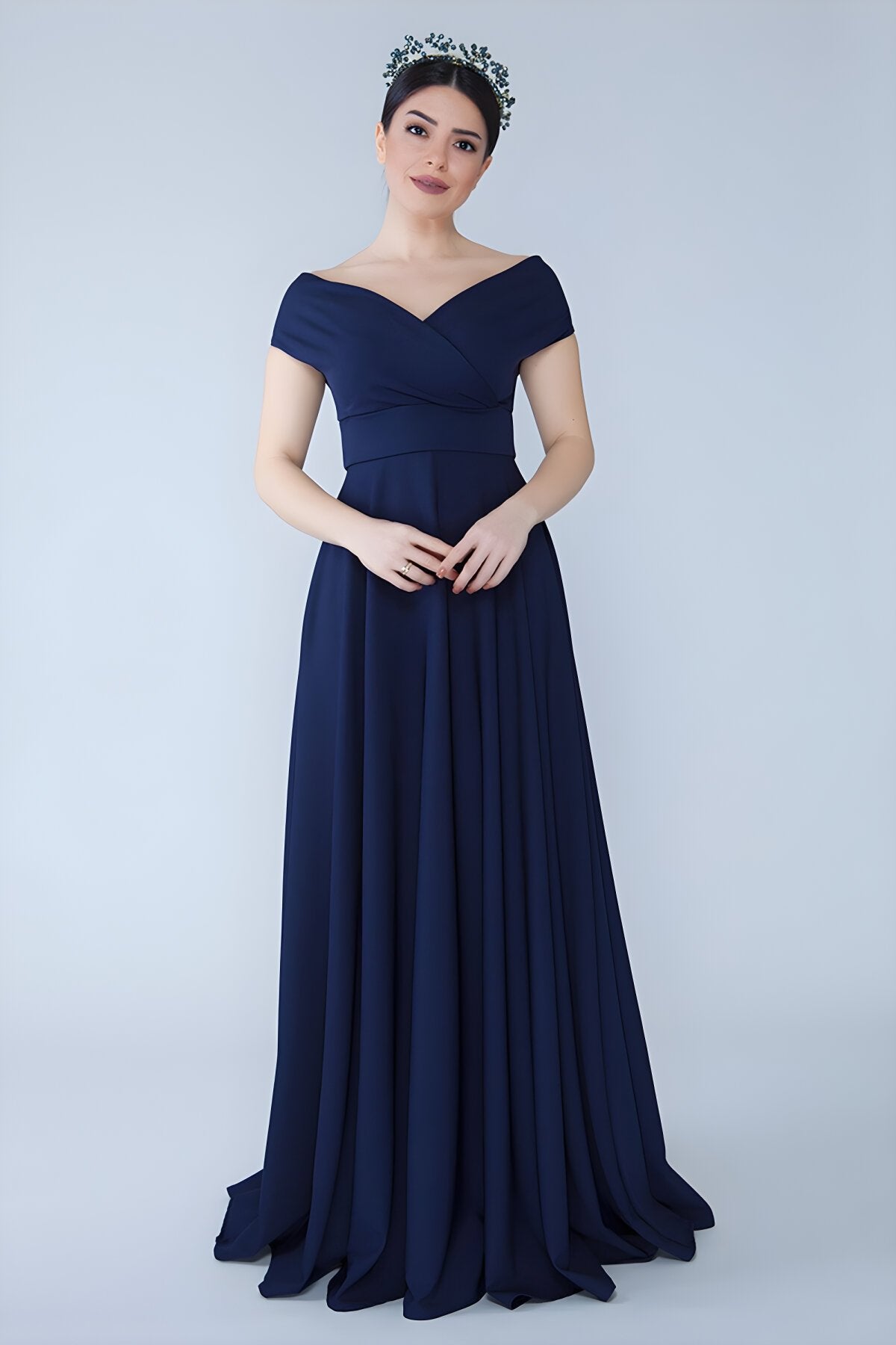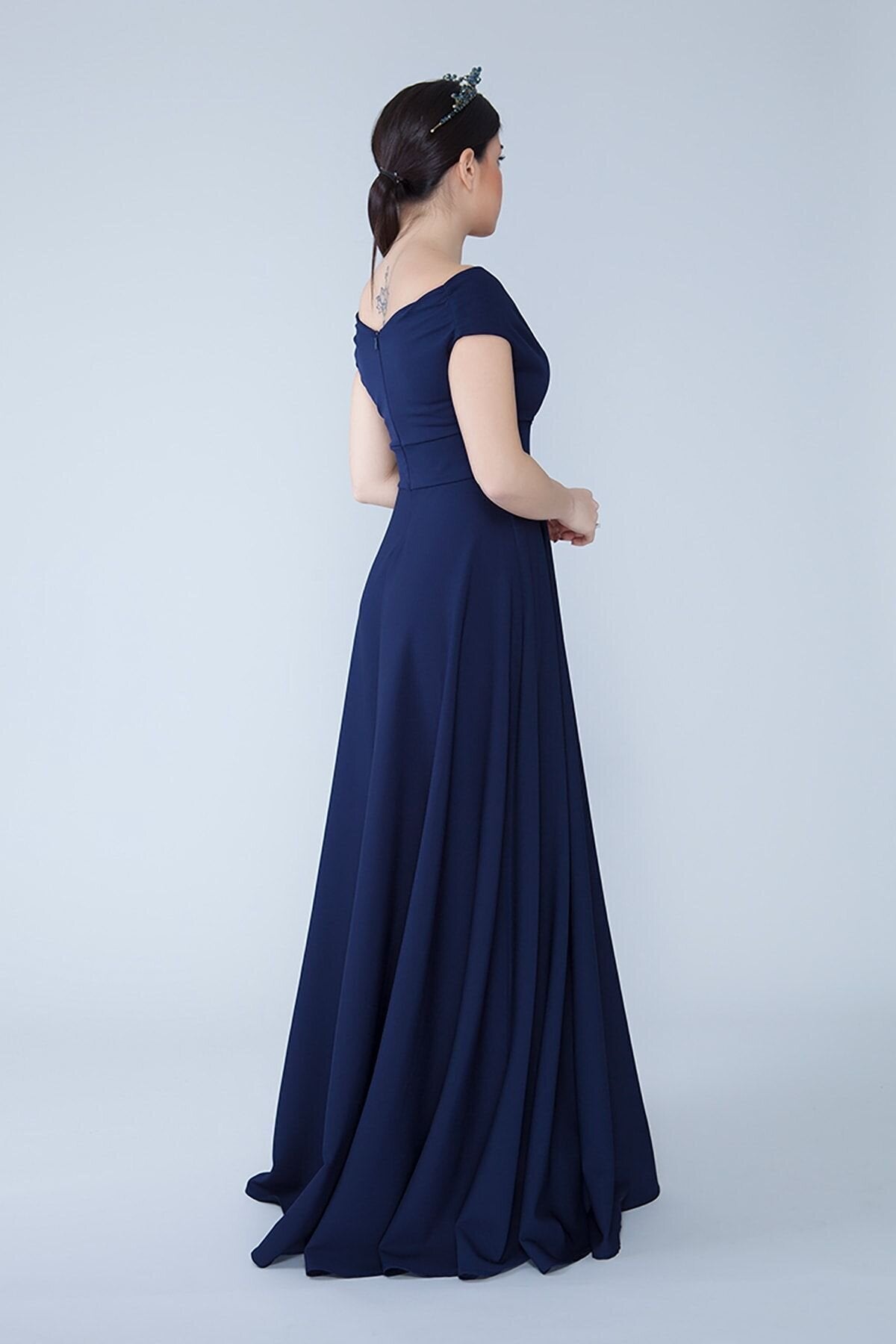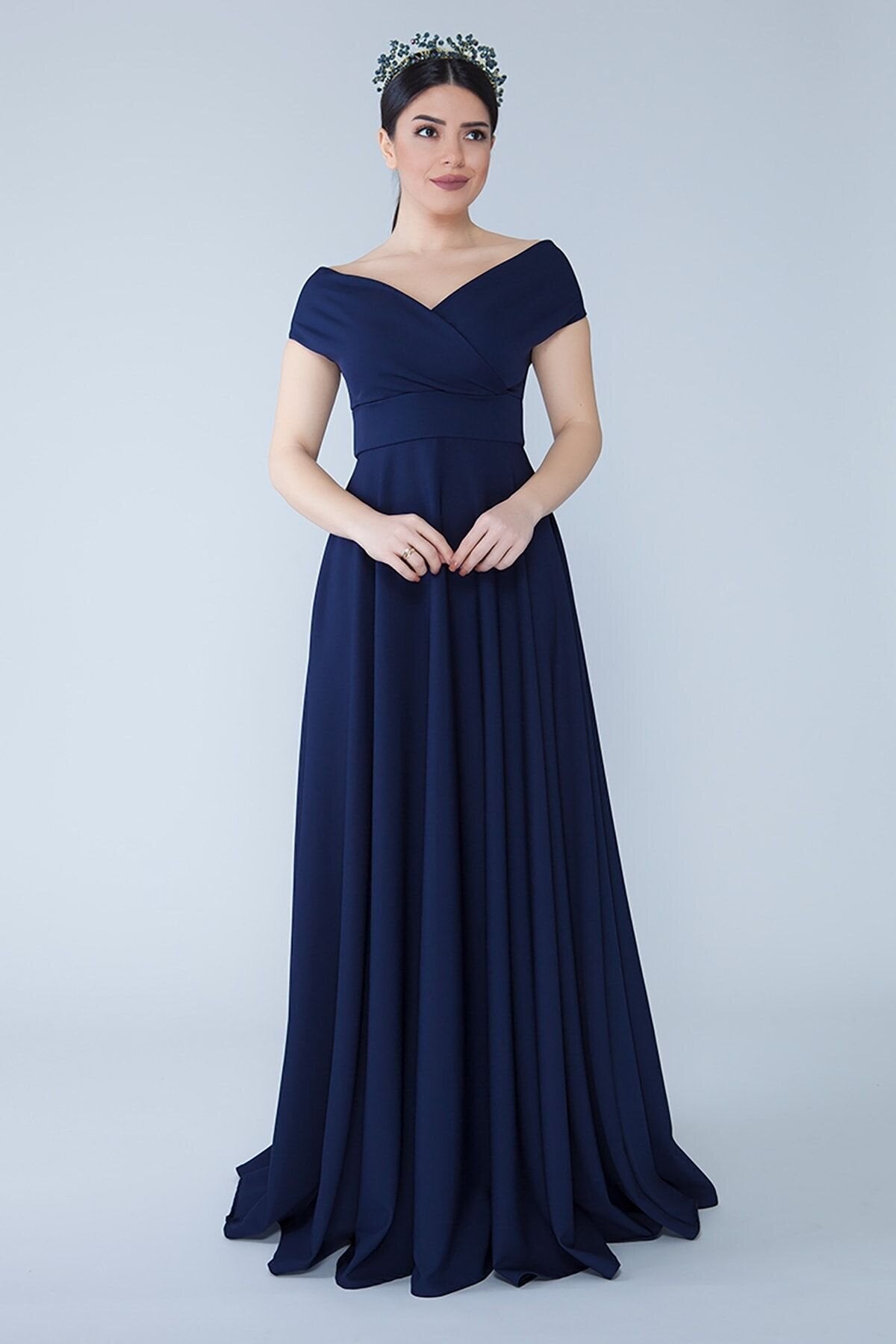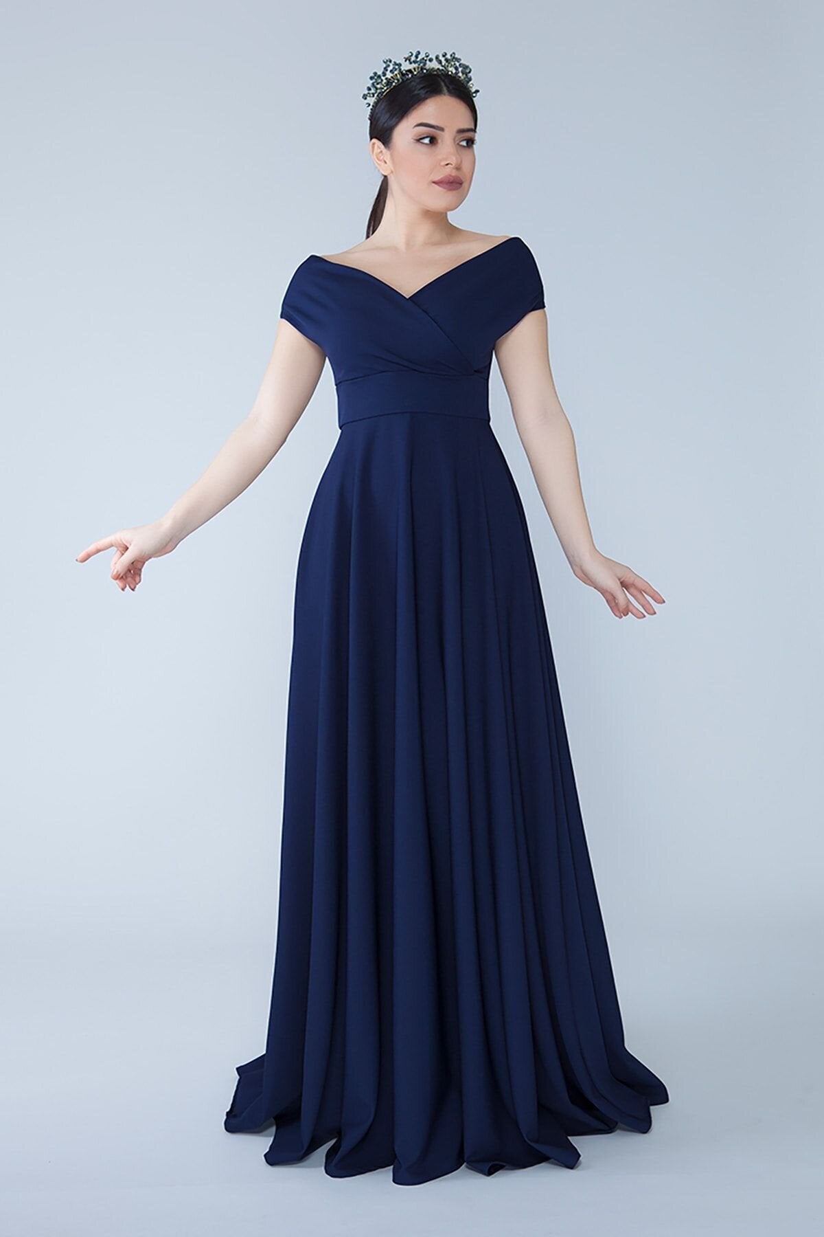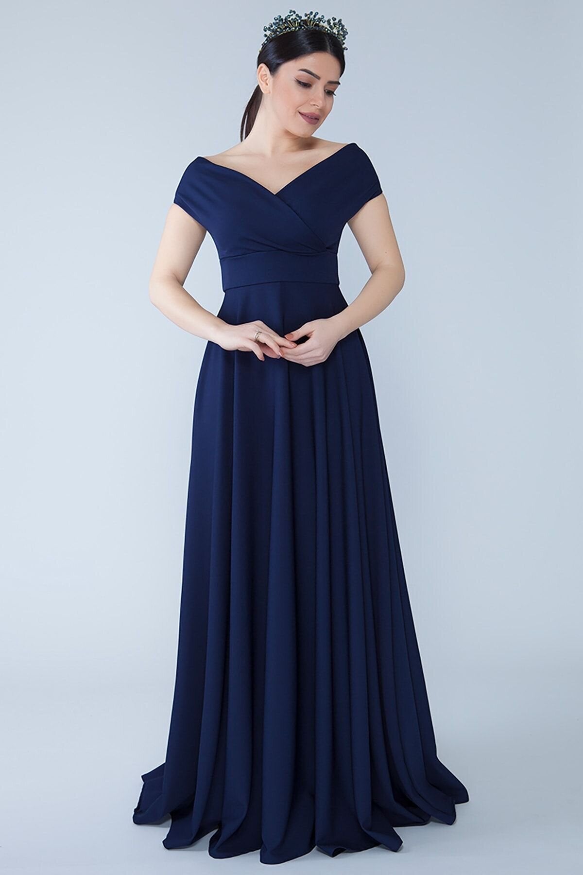 Long Off-the-Shoulder Wrap Boat Neck Evening Dress - Navy