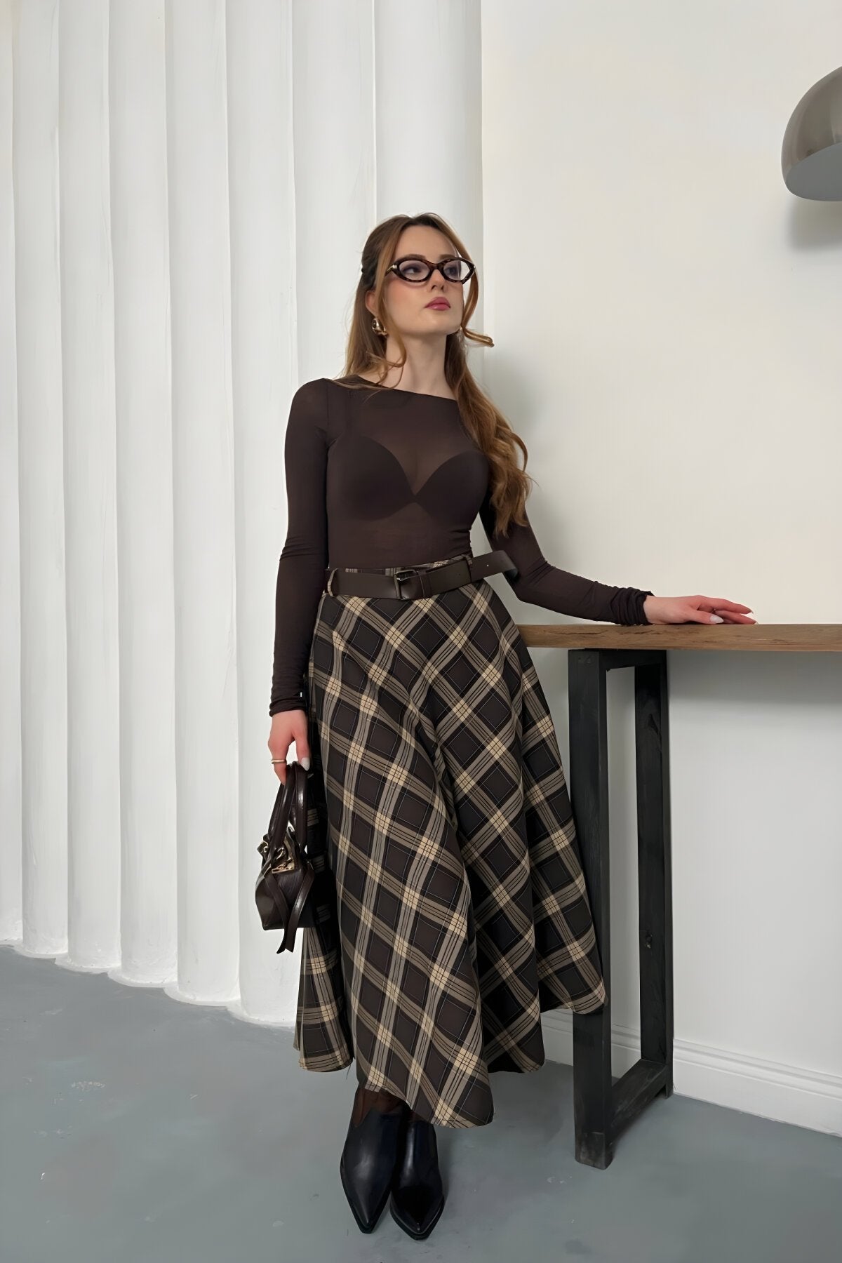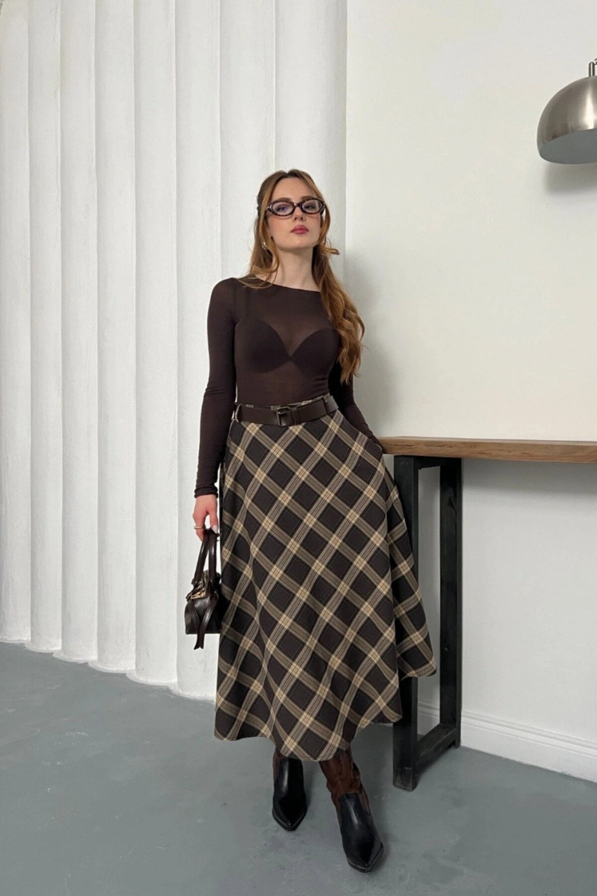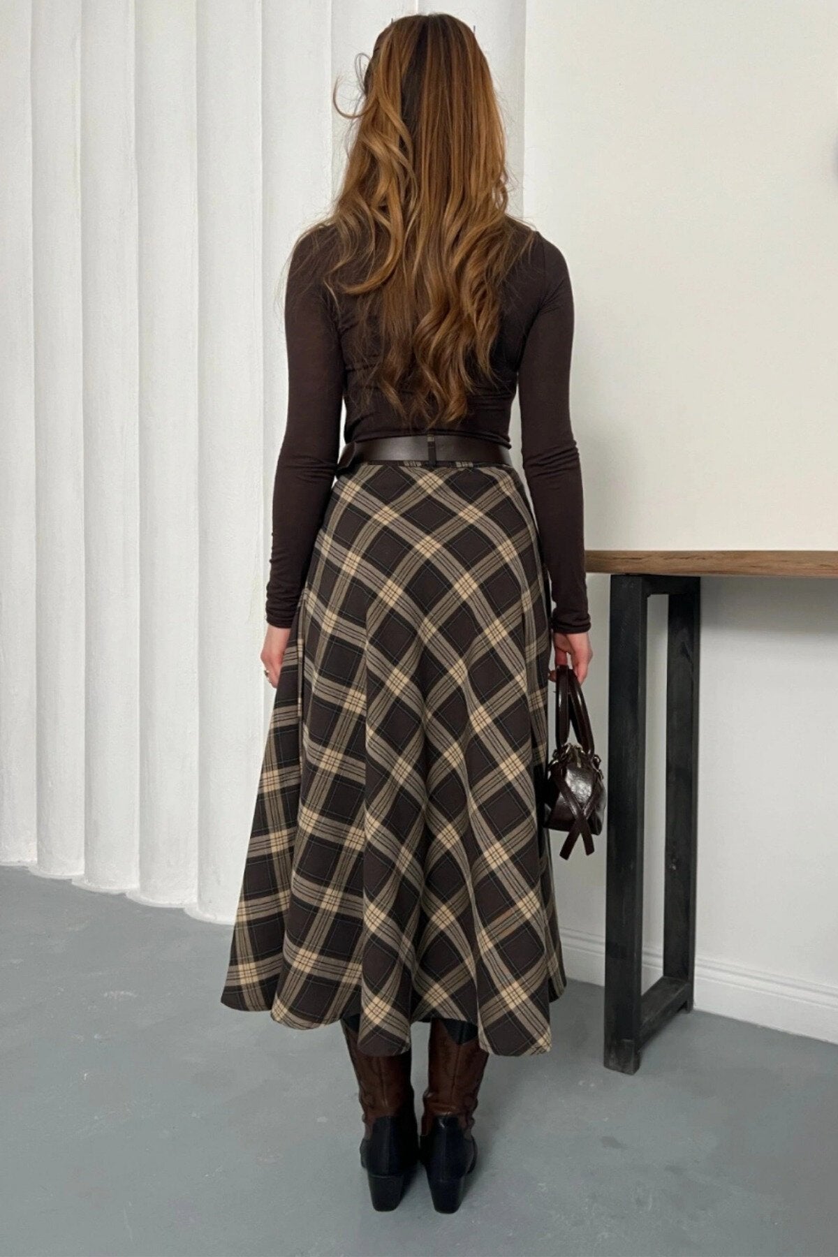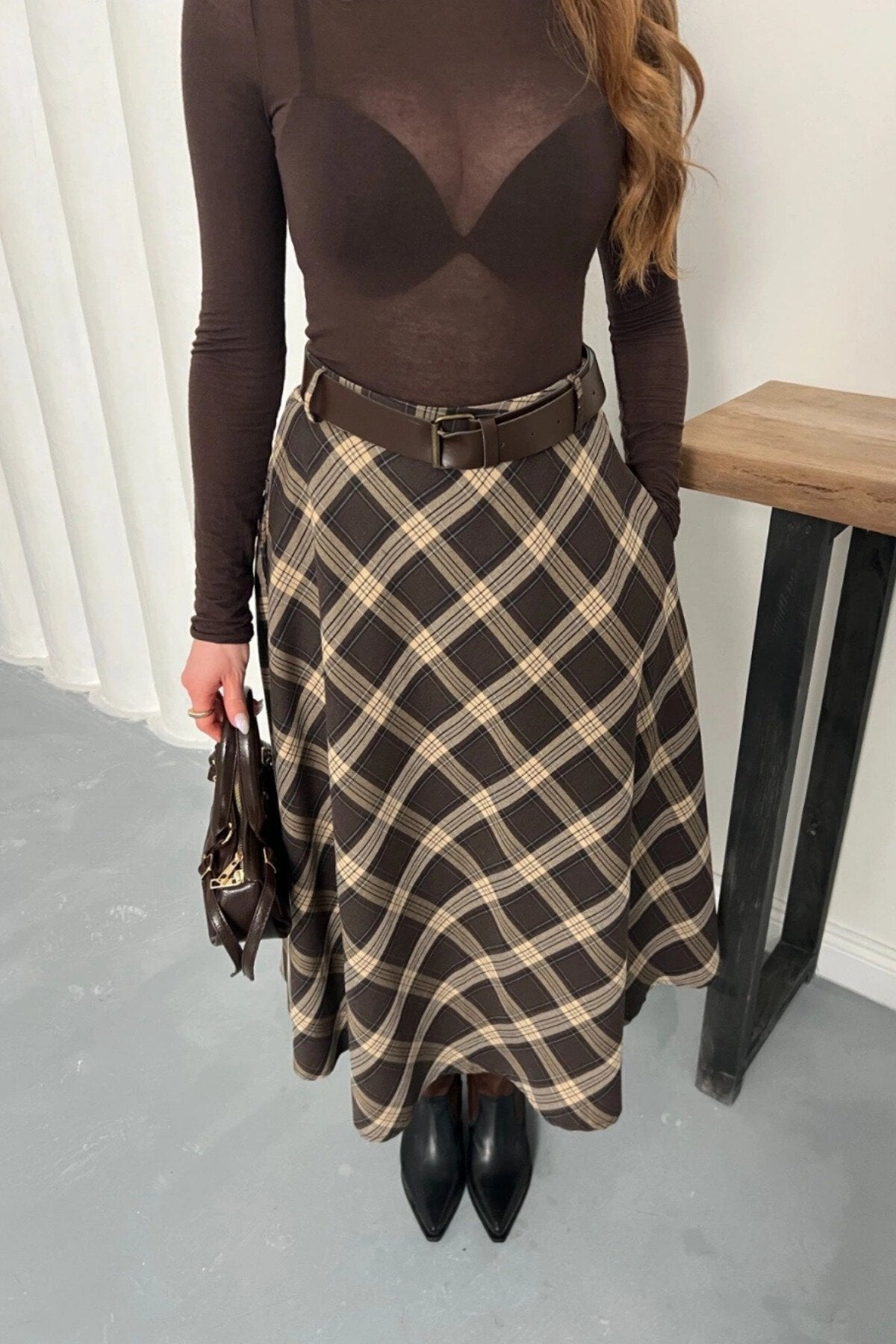 Long Plaid Belt Detail Skirt - Brown