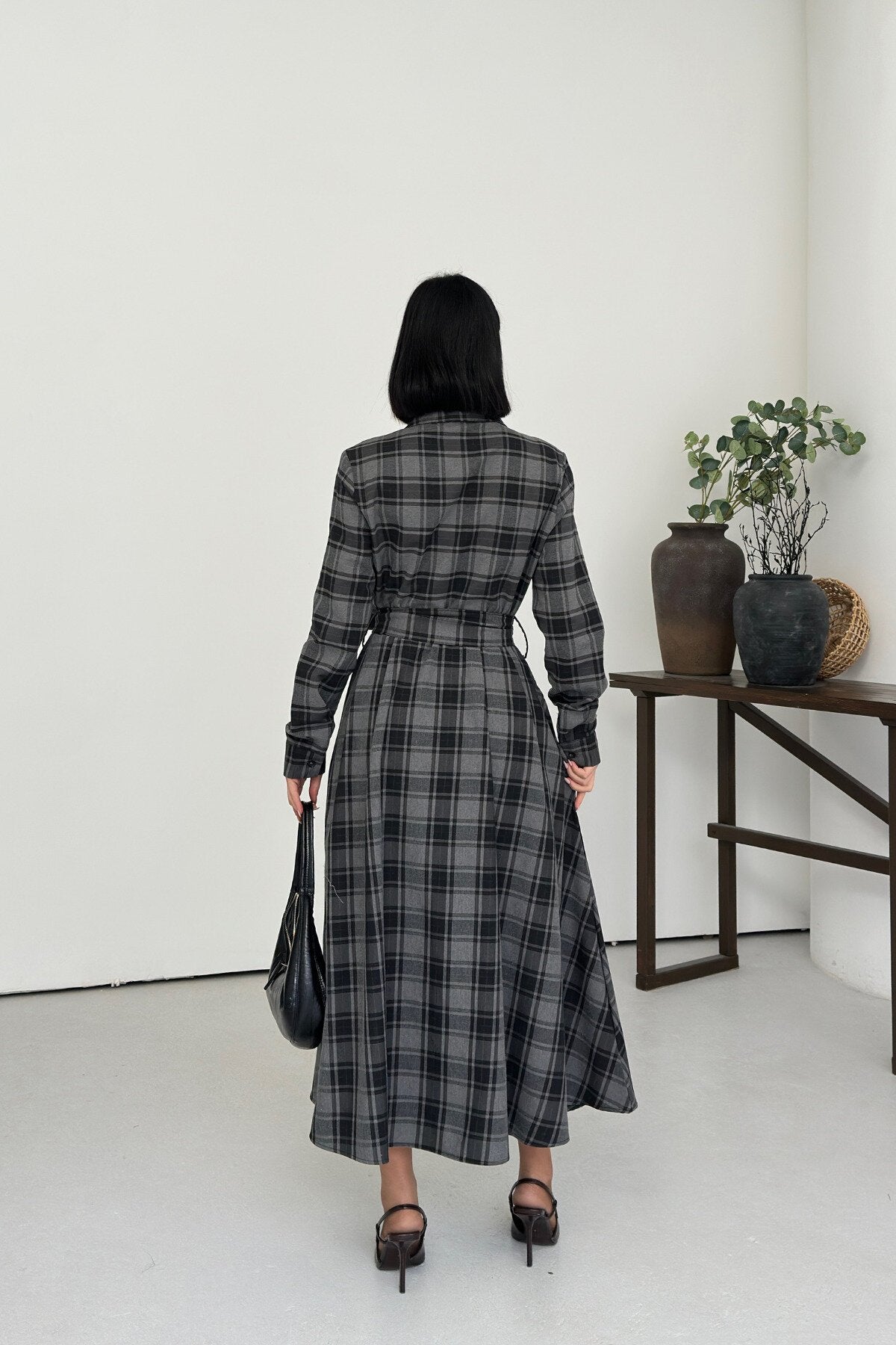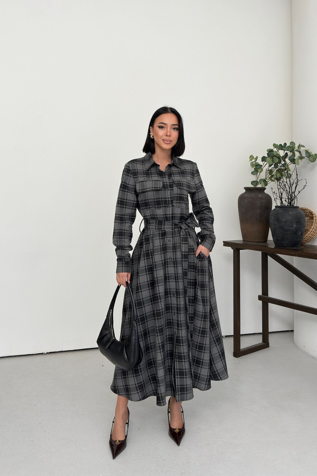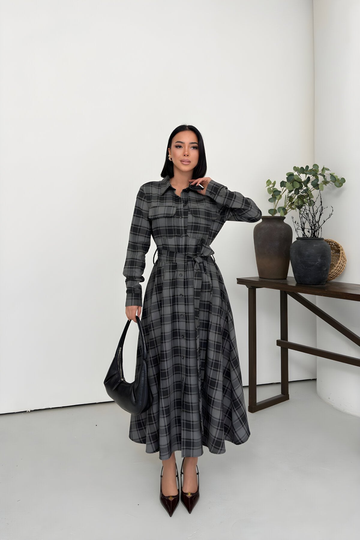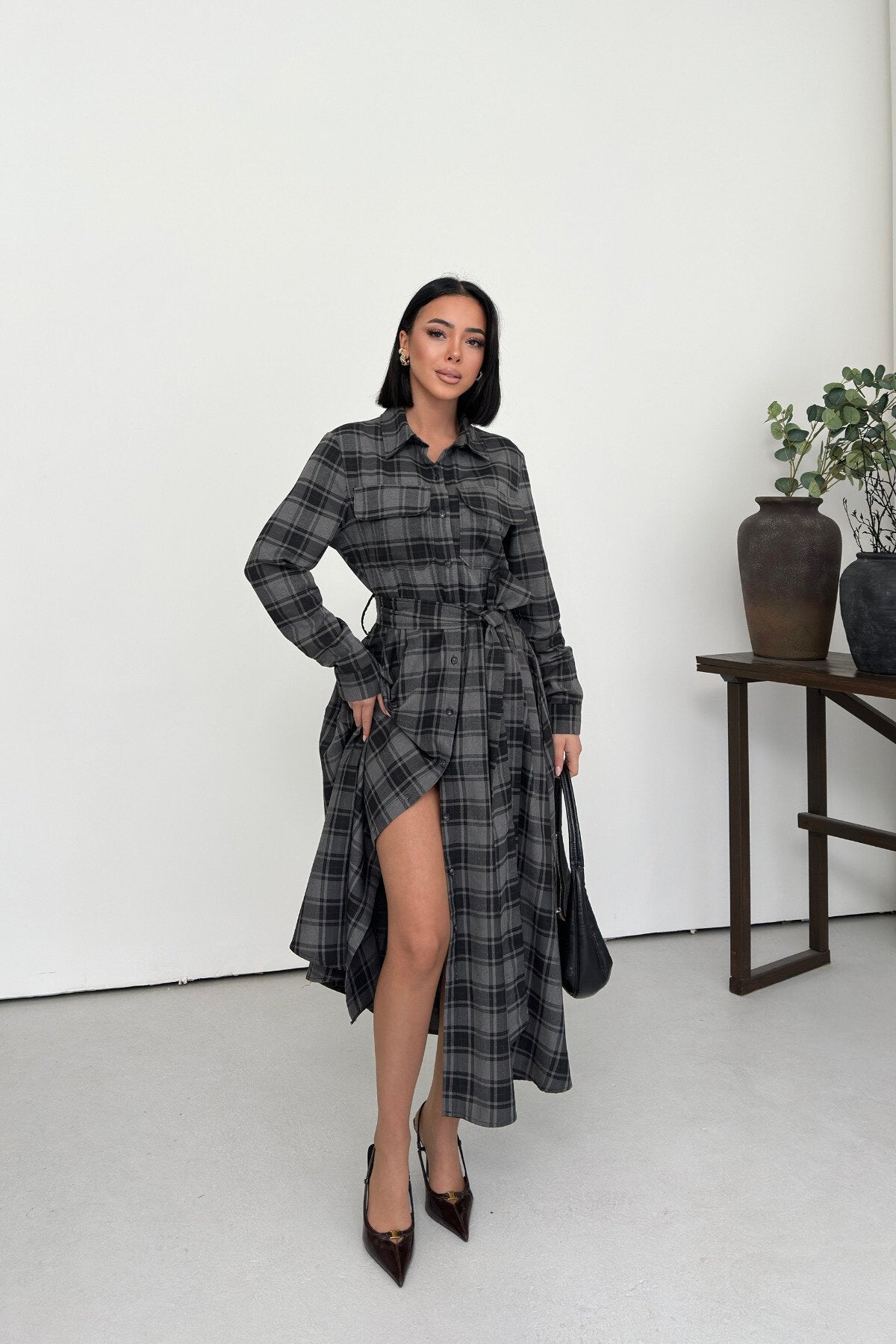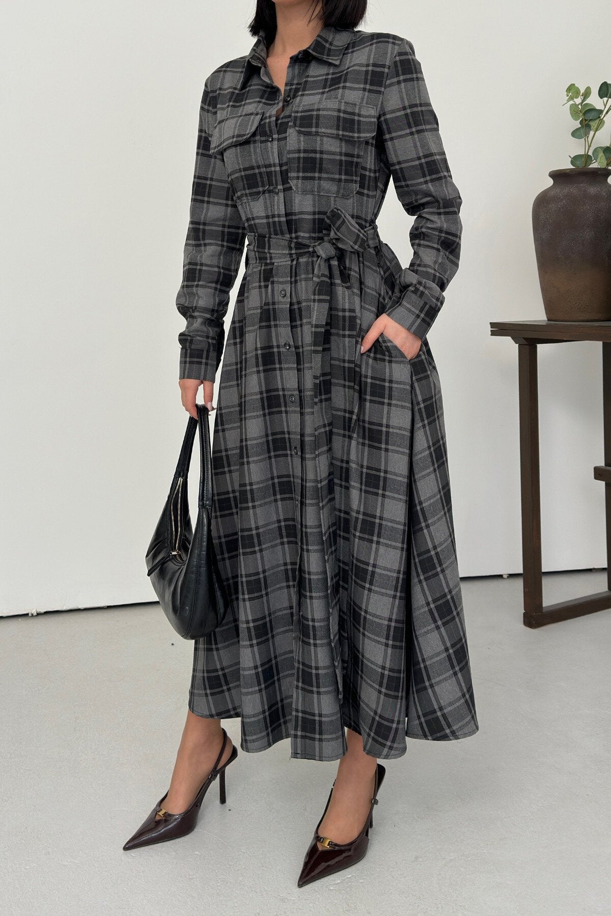 Long Plaid Belted Shirt Dress - Black