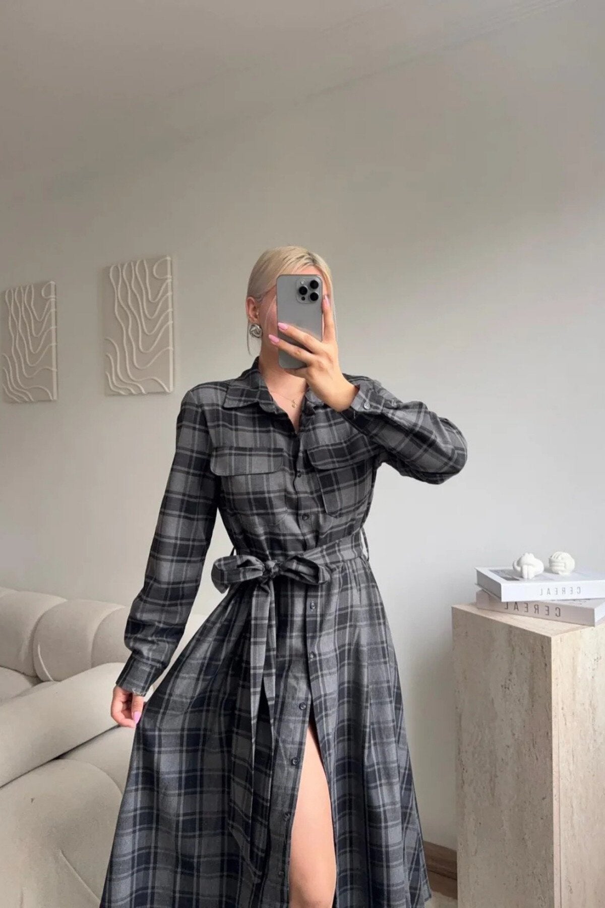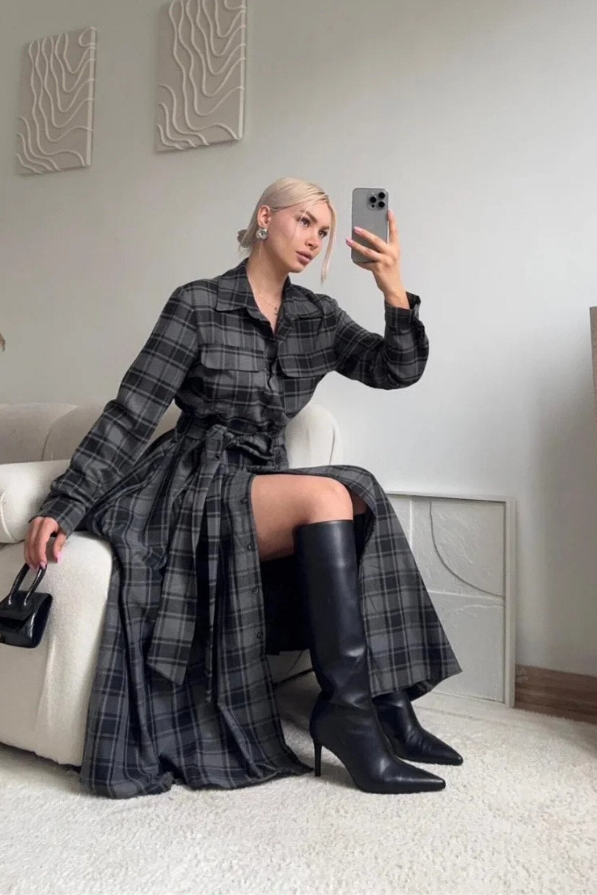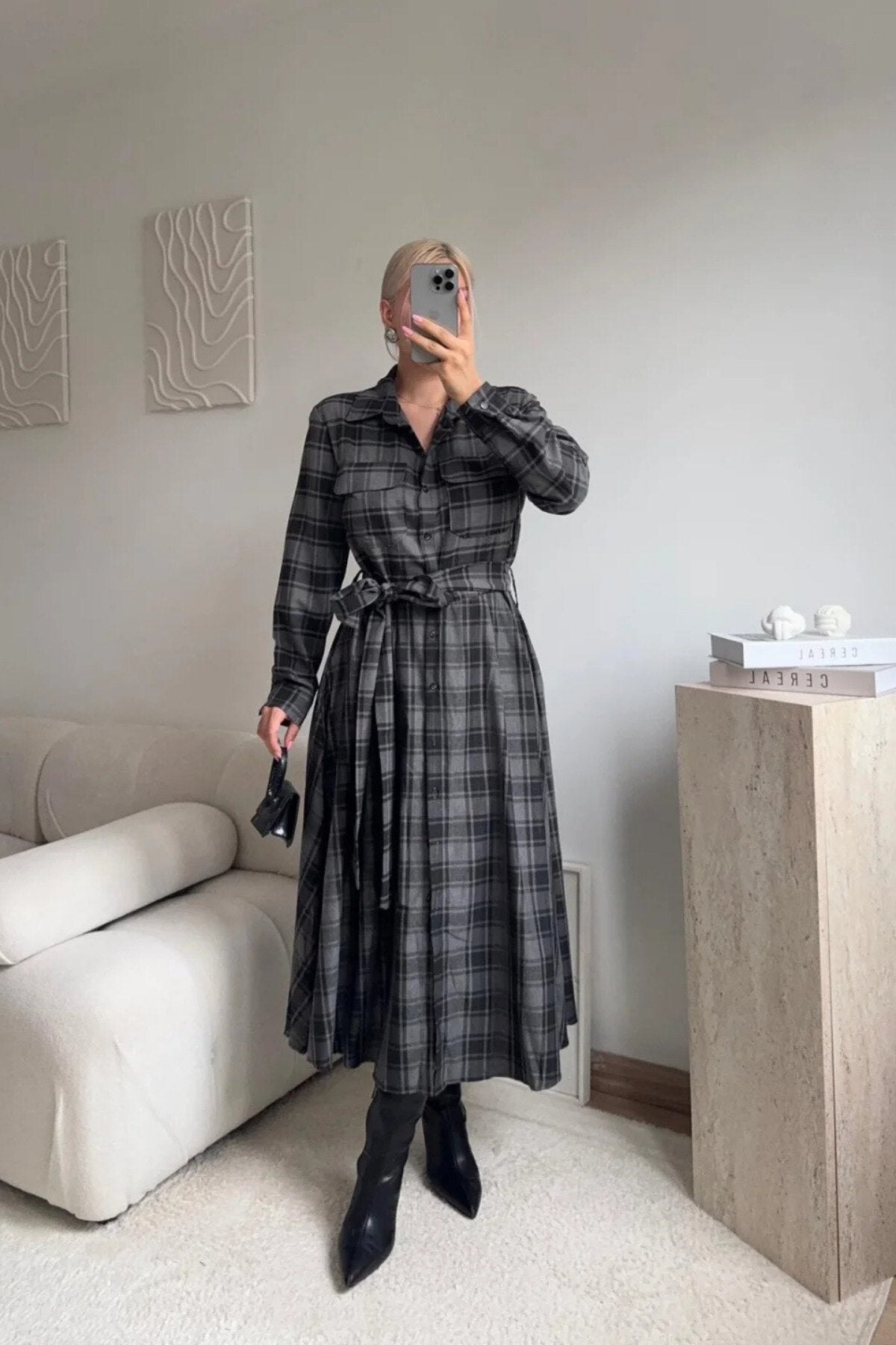 Long Plaid Belted Shirt Dress - Black