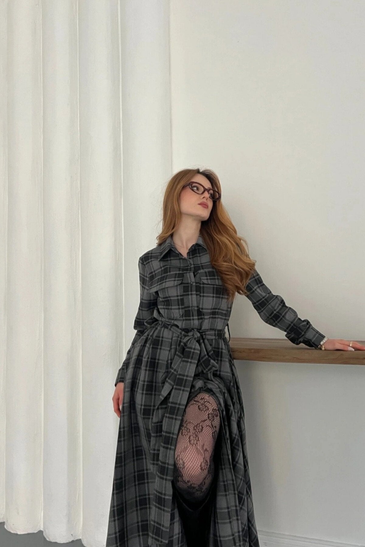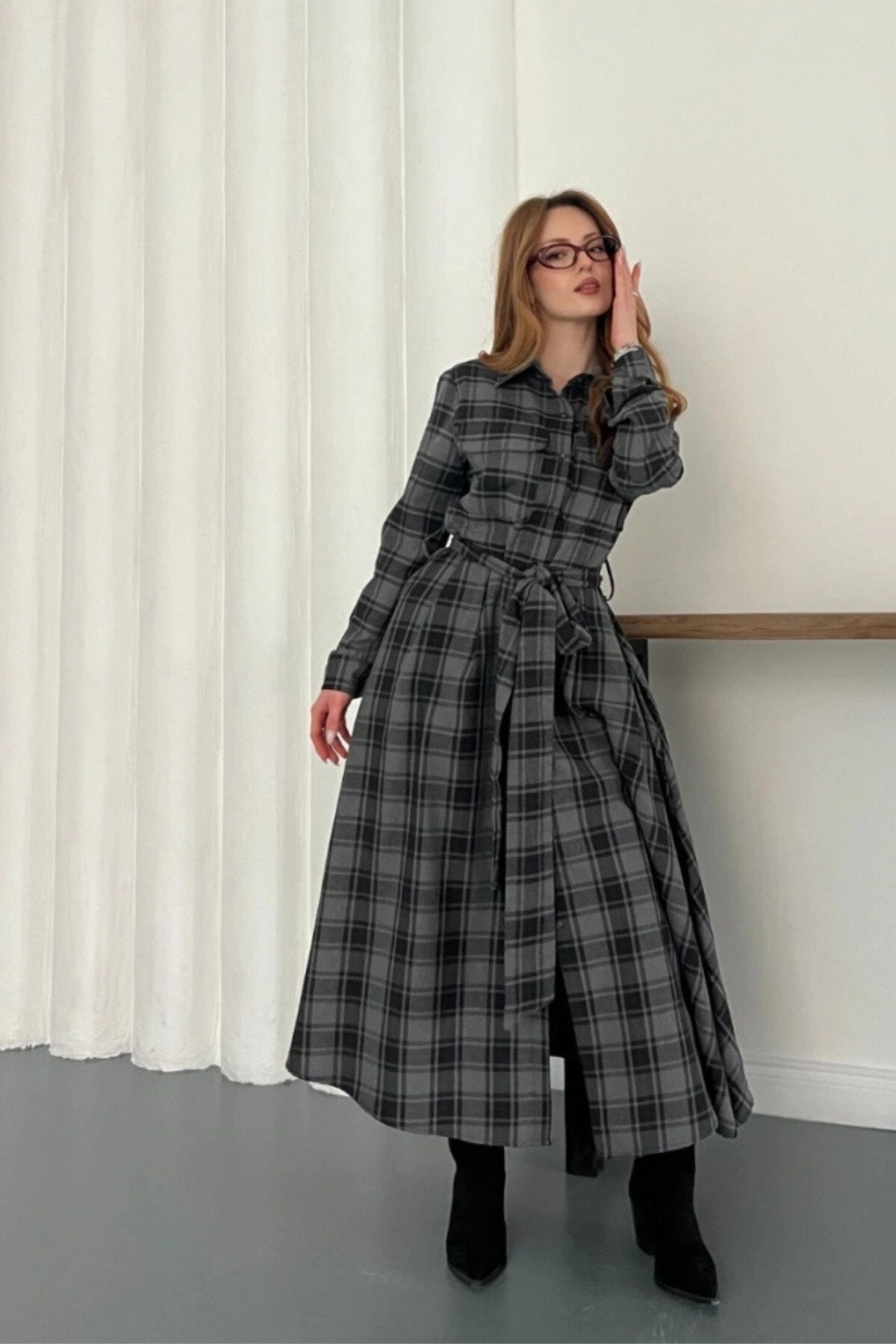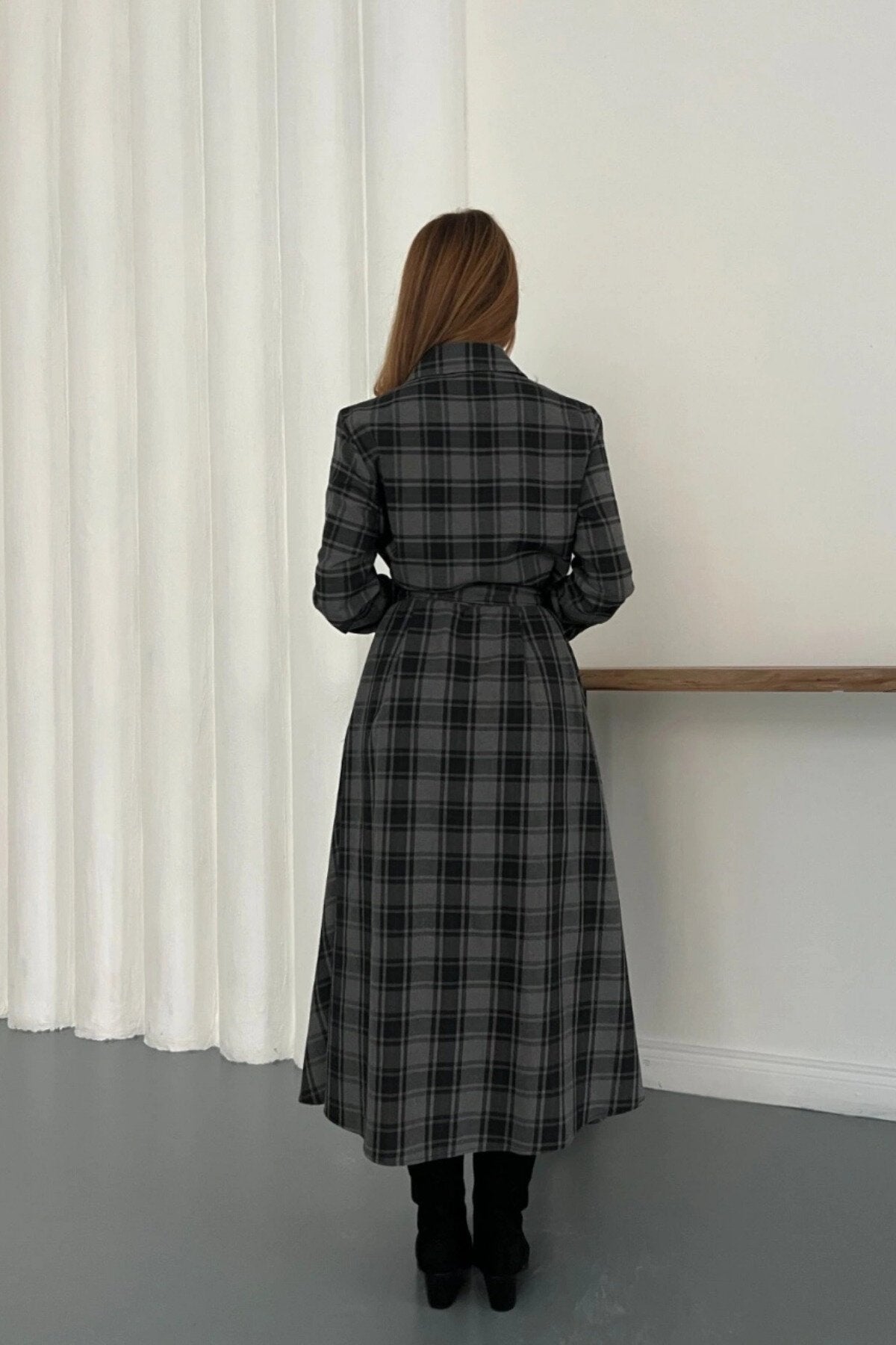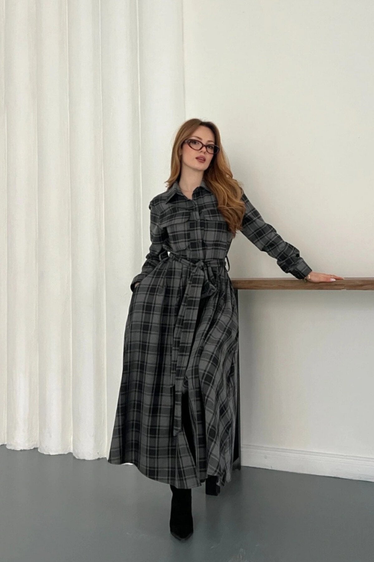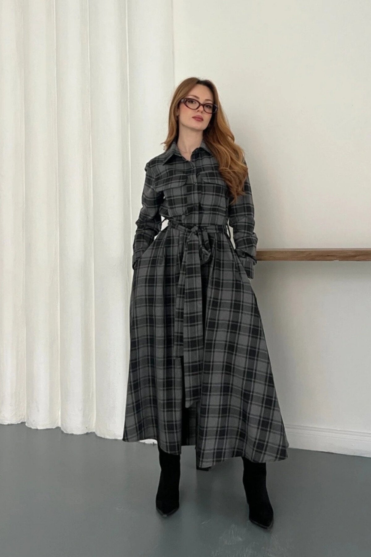 Long Plaid Tie-Waist Shirt Dress - Black