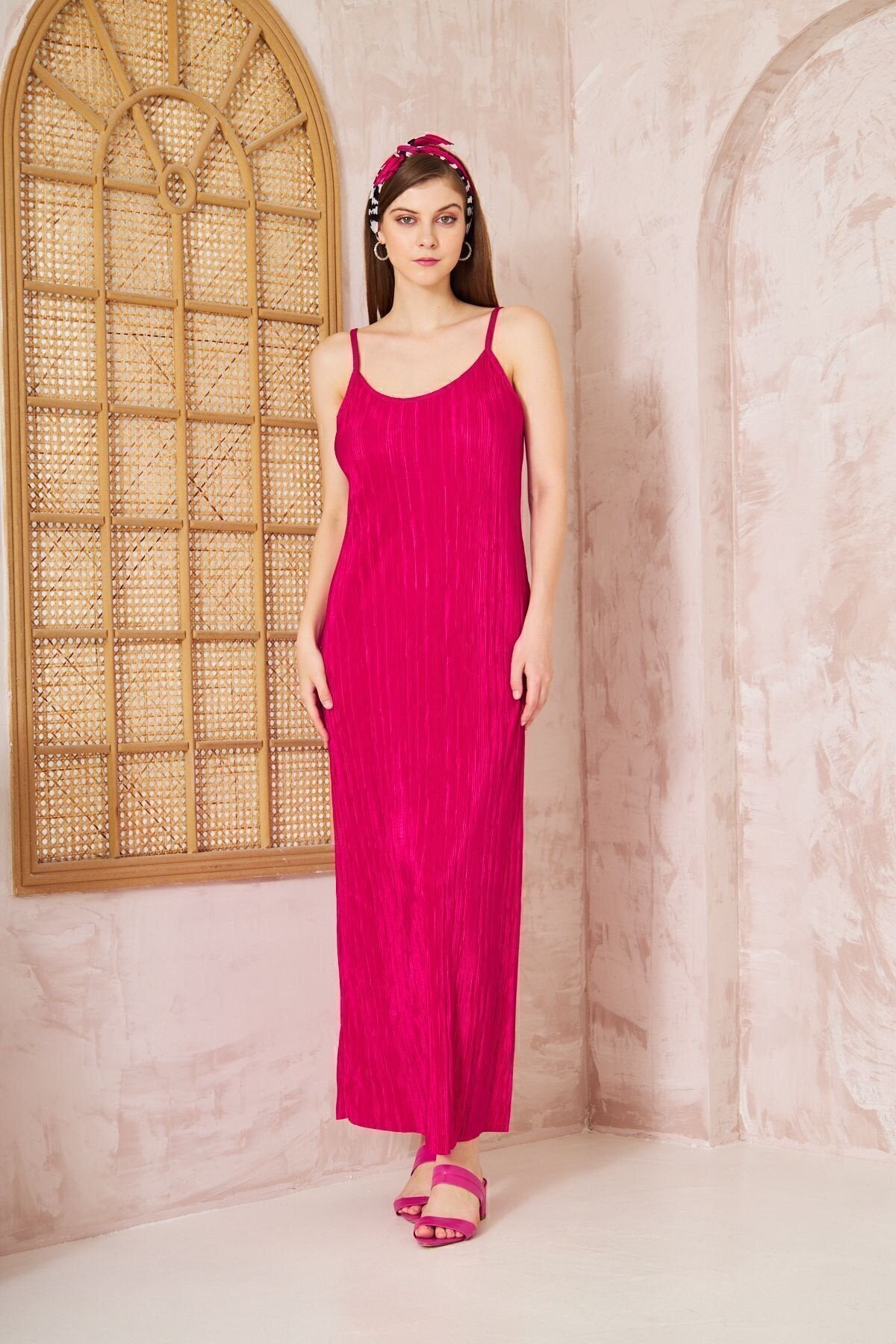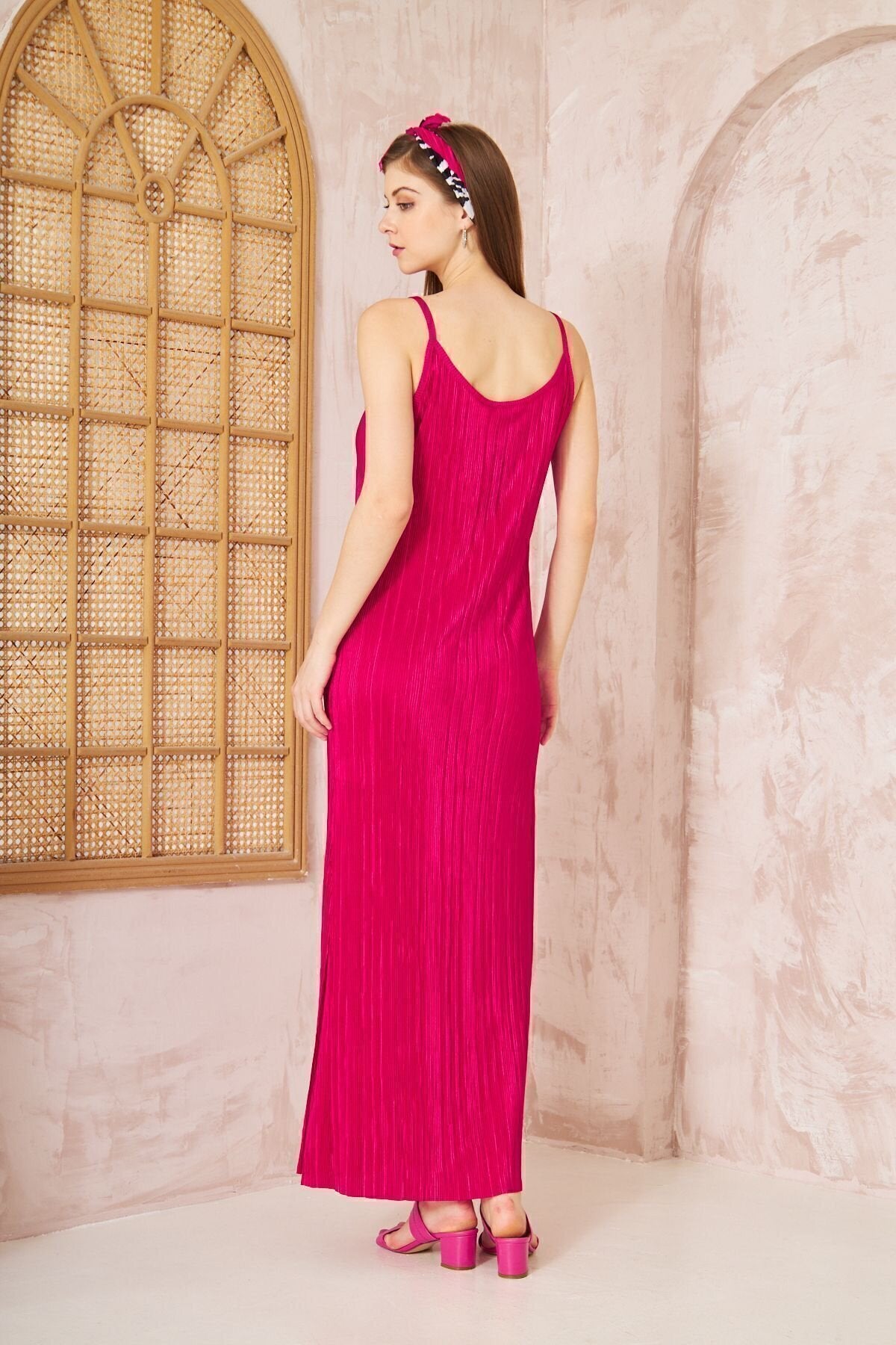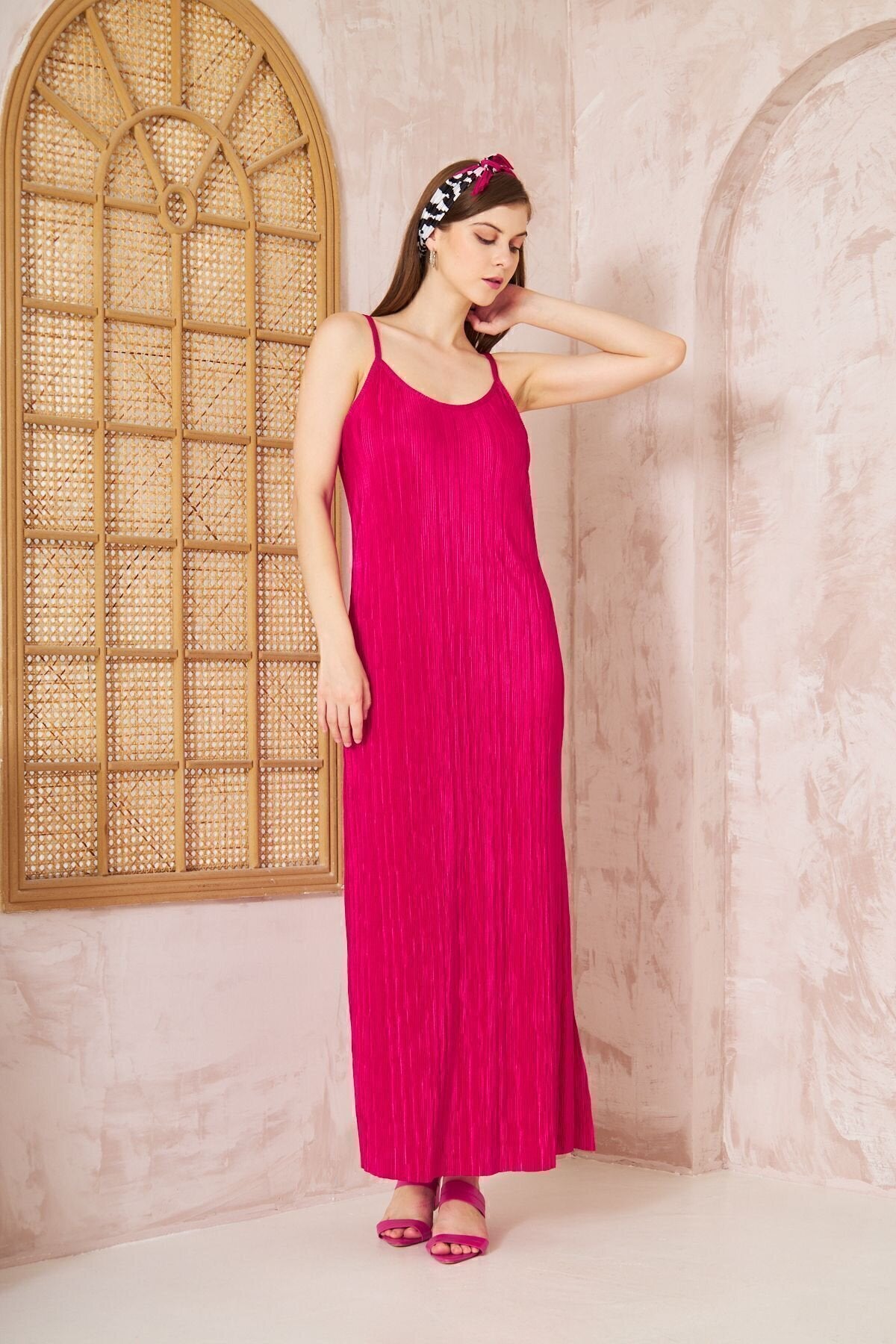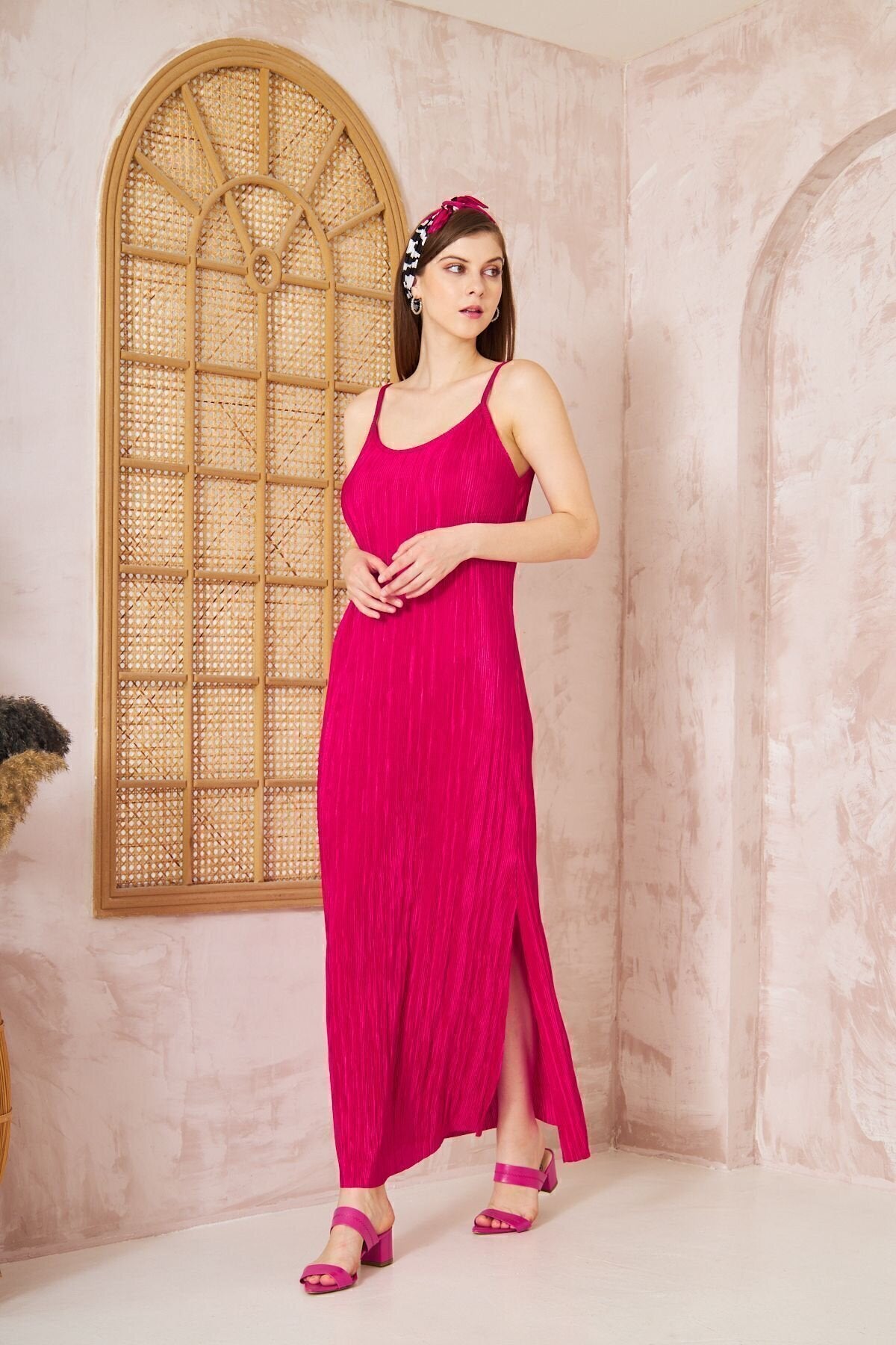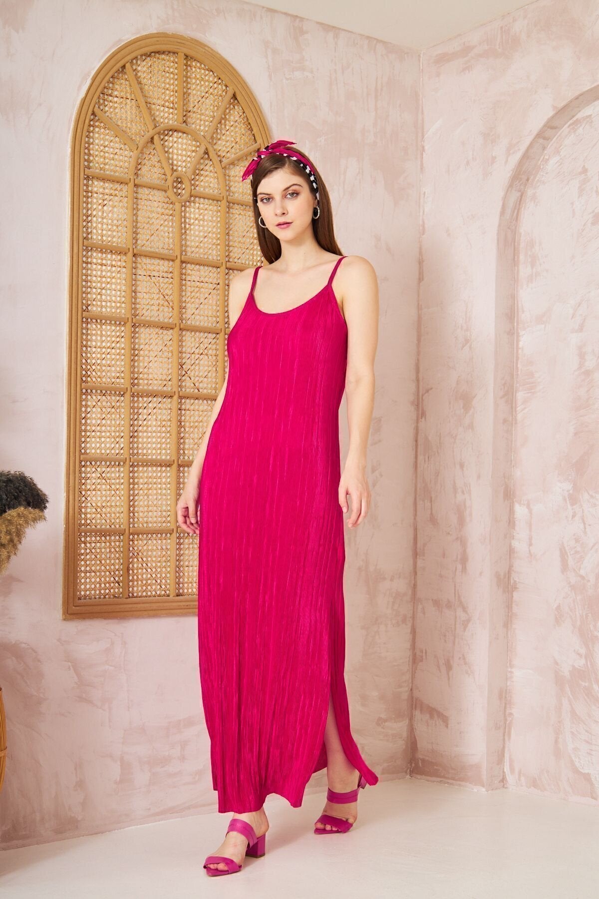 Long Pleated Thin Strapped Slit Dress - Fuchsia