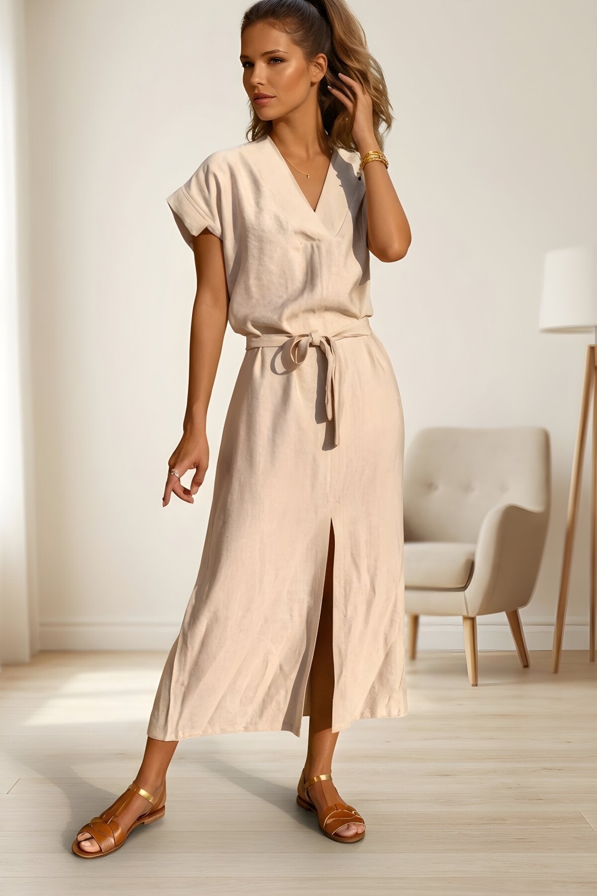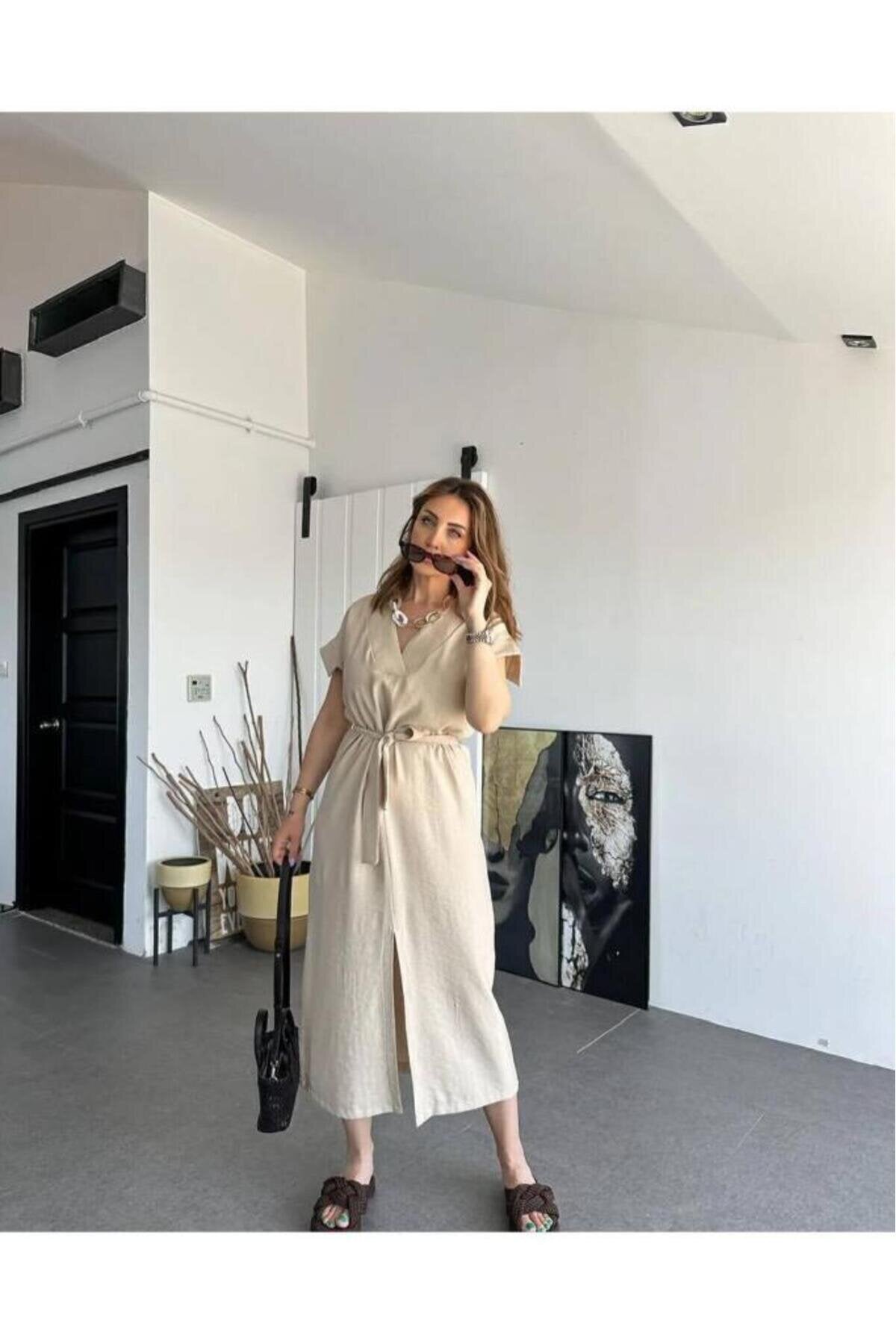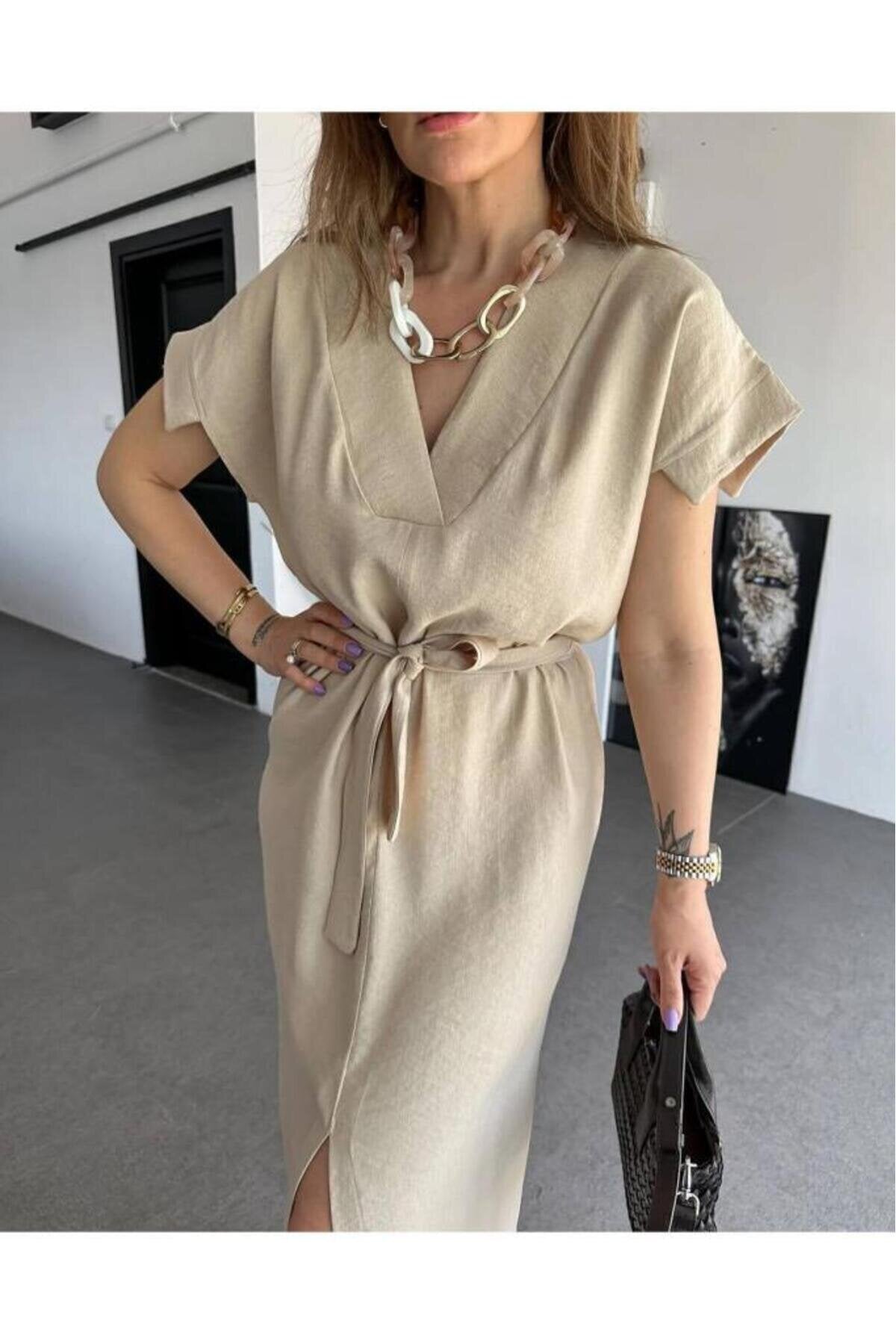 Long Short-Sleeved Linen Belted Dress - Stone Beige