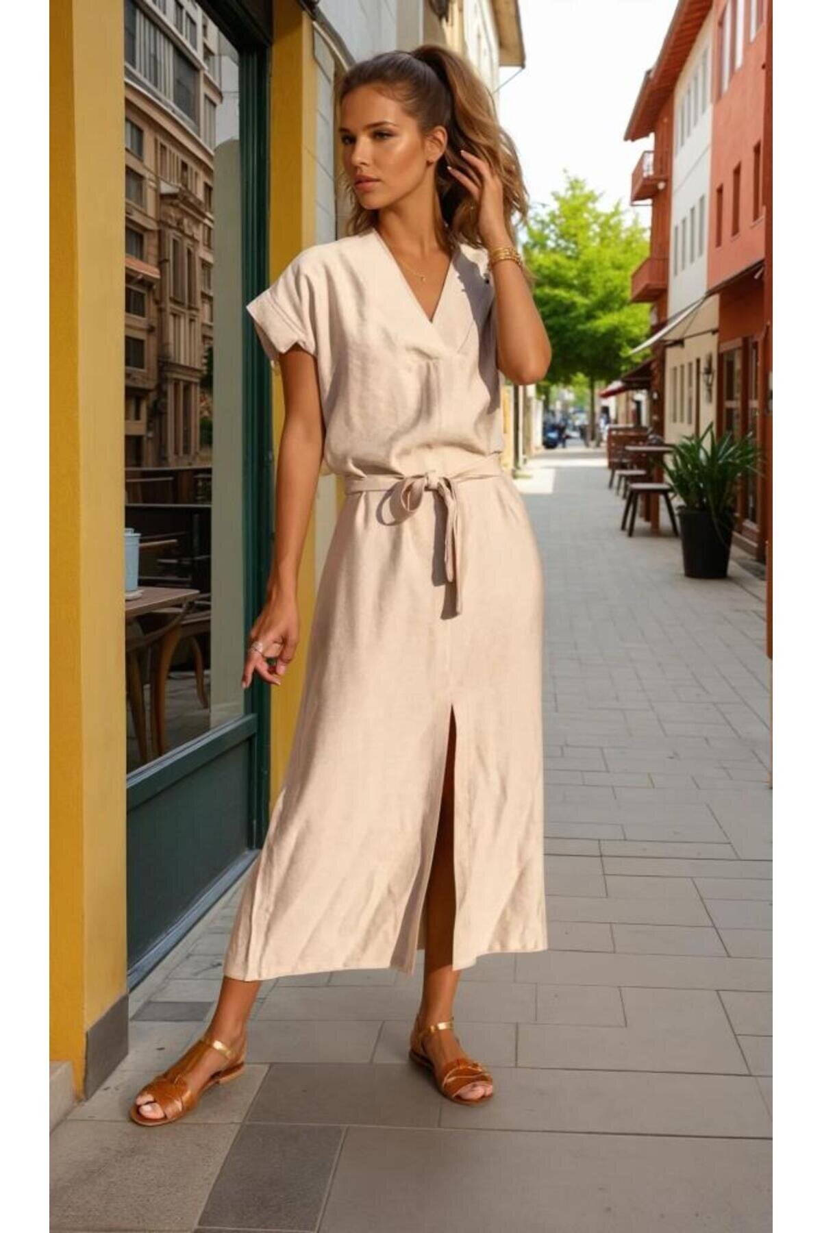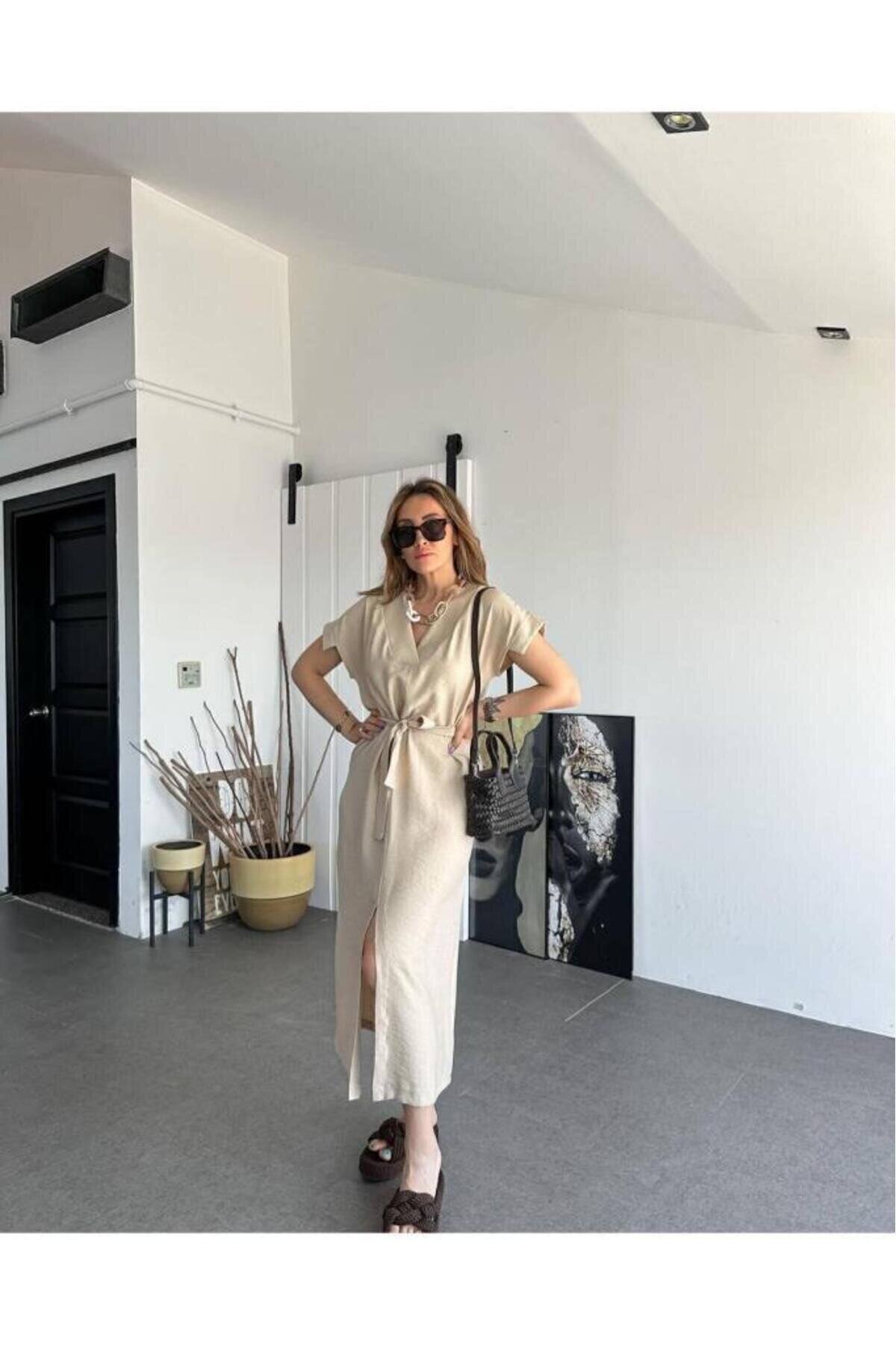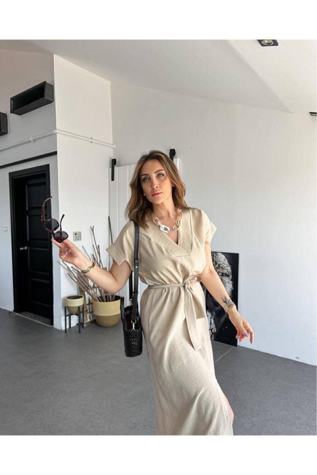 Long Short-Sleeved Linen Belted Dress - Stone Beige