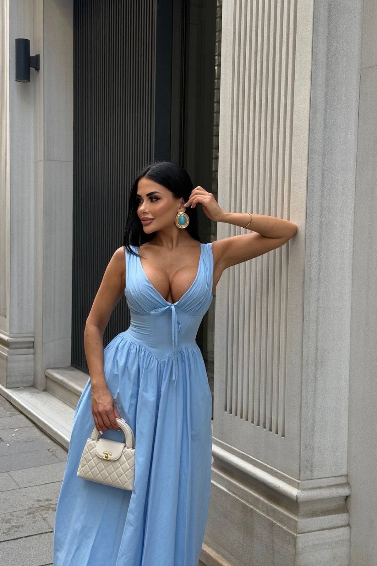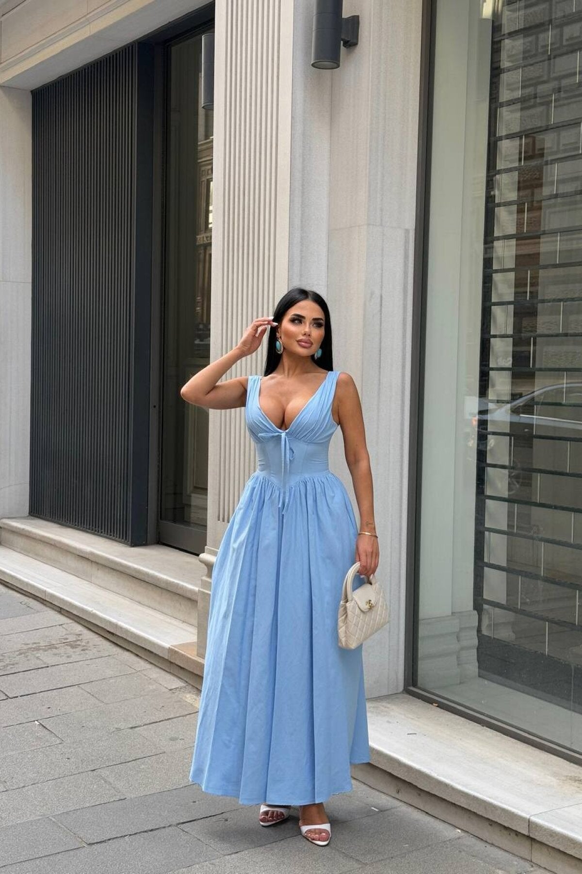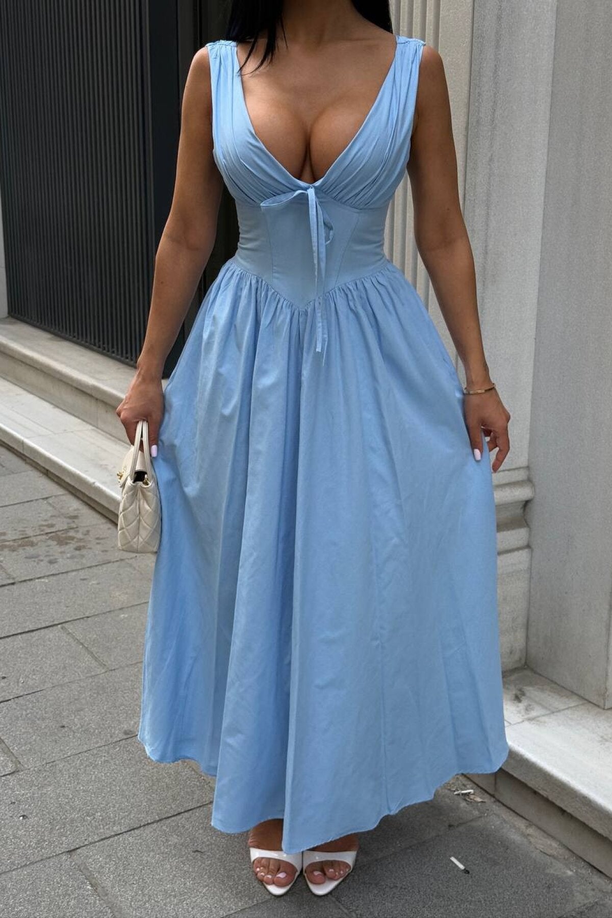 Long Simon Poplin Corset Detailed Dress - Blue