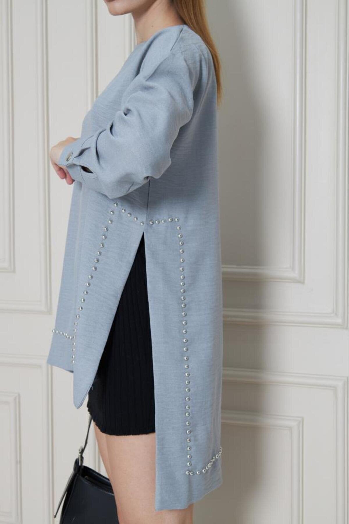 Long Sleeve Bamboo Linen Tunic Pearl-Embellished Blouse - Gray