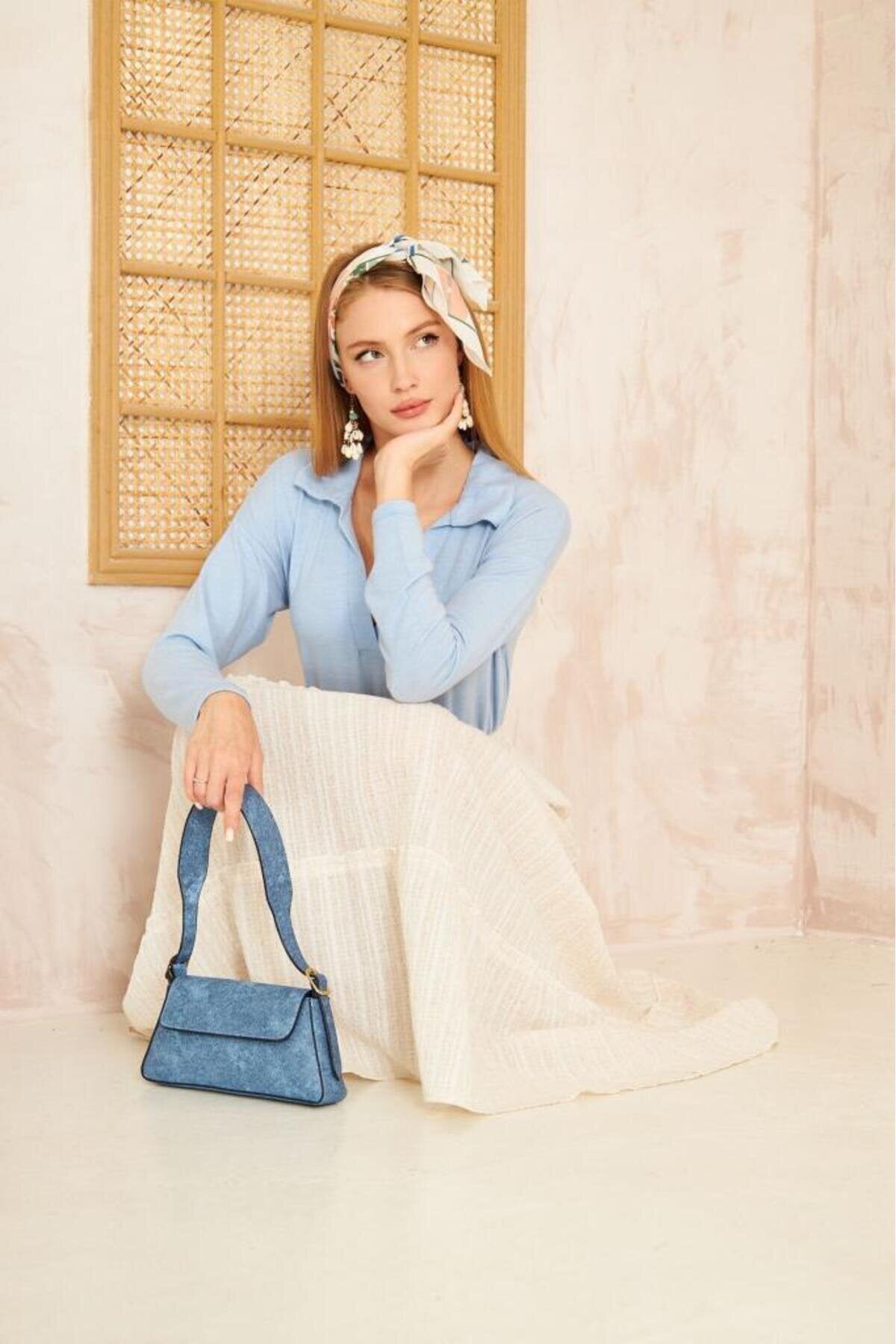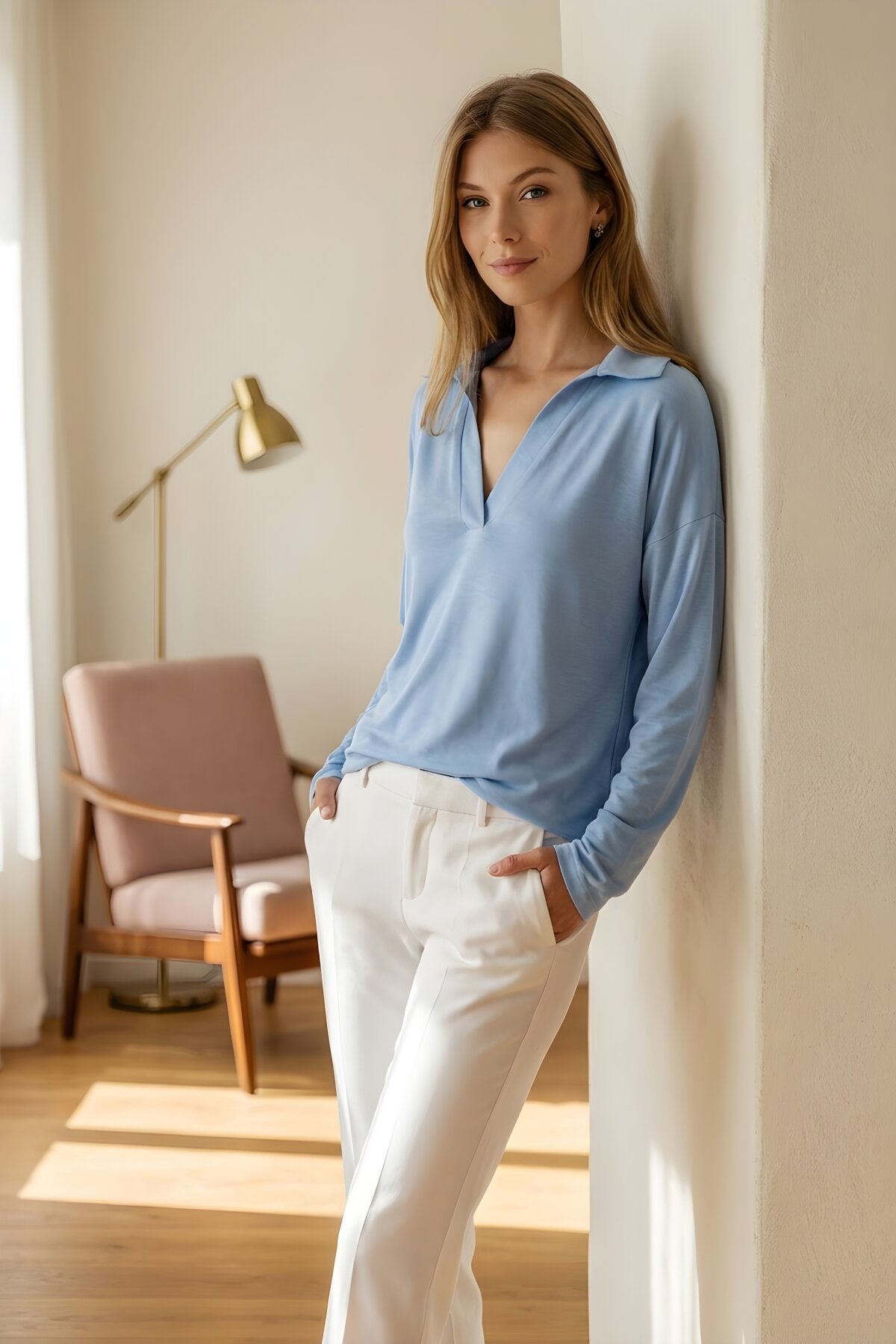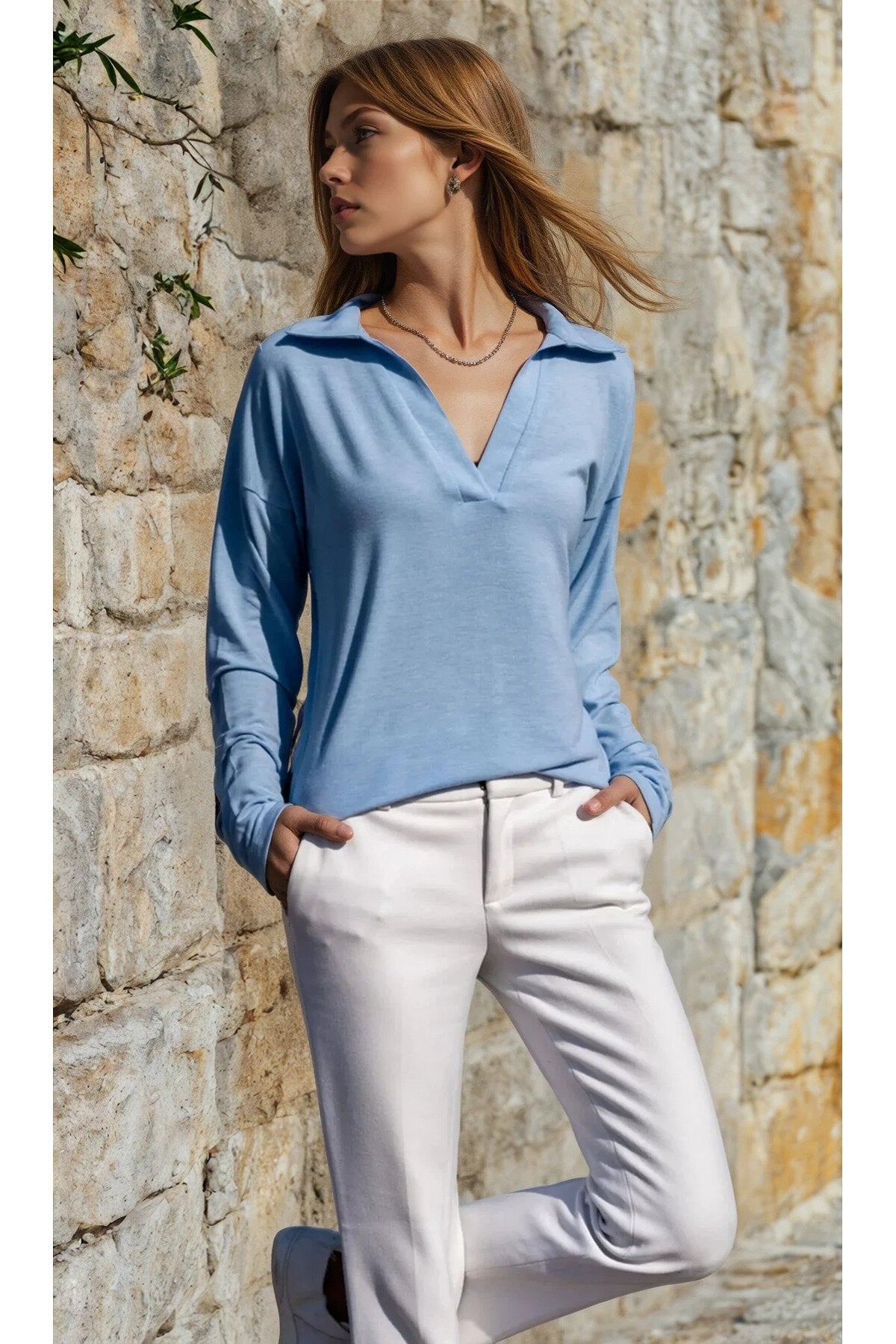 Long Sleeve Polo Neck Blouse - Baby Blue