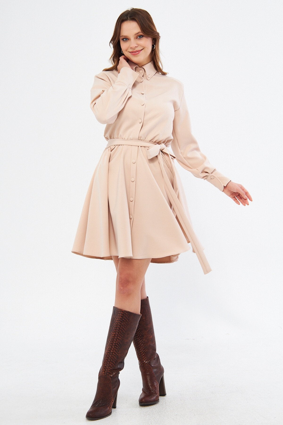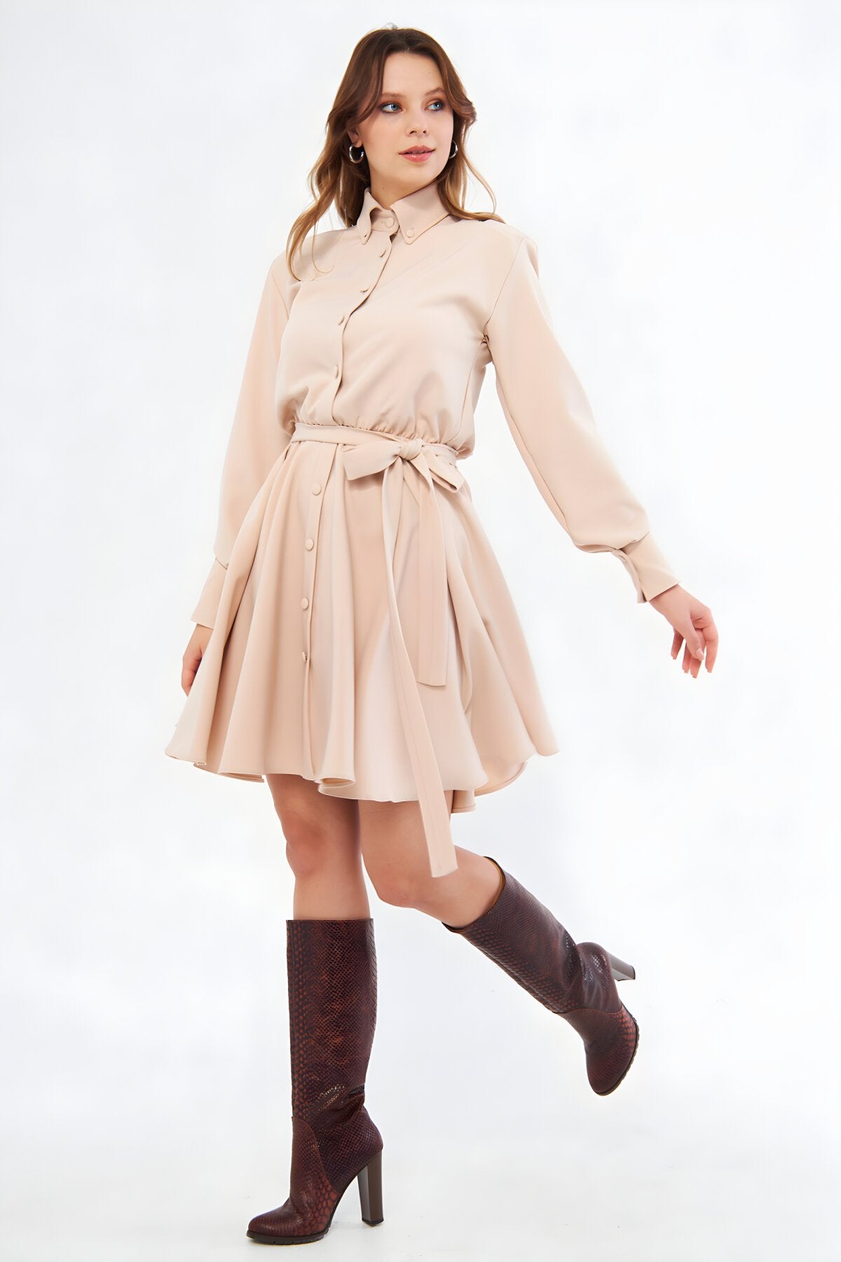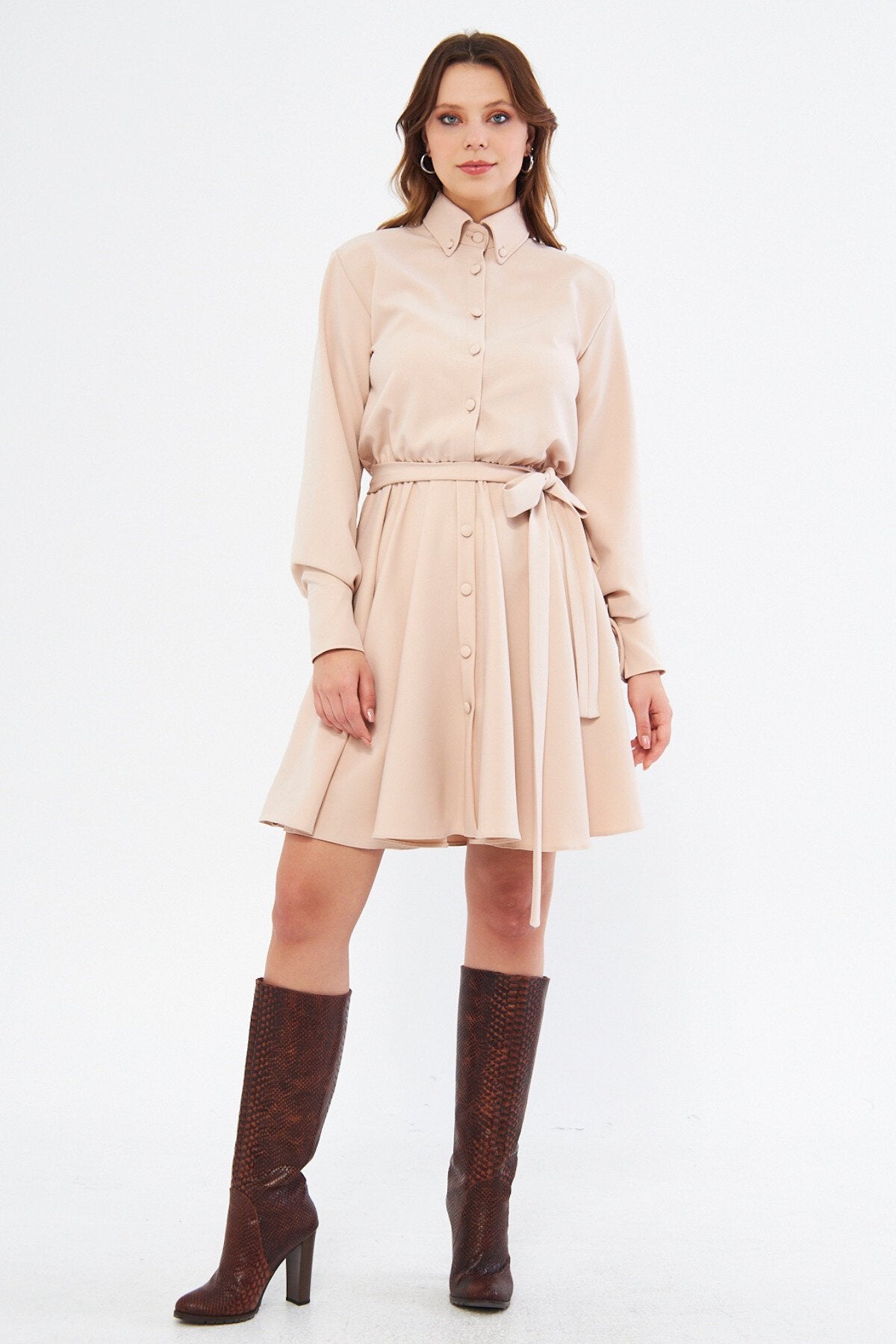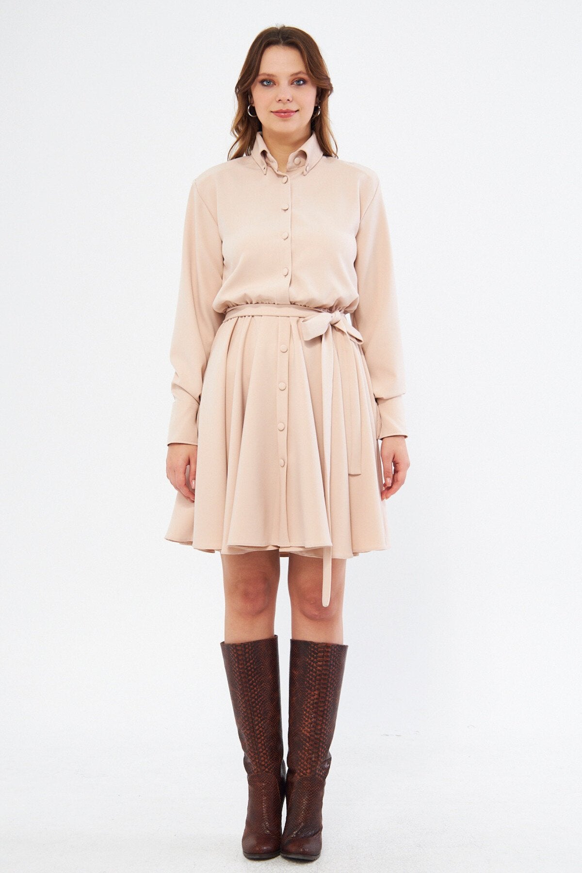 Long Sleeve Woven Elastic Waist Belted Mini Shirtdress - Cream