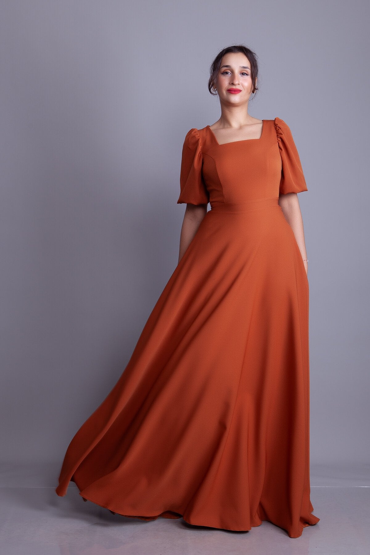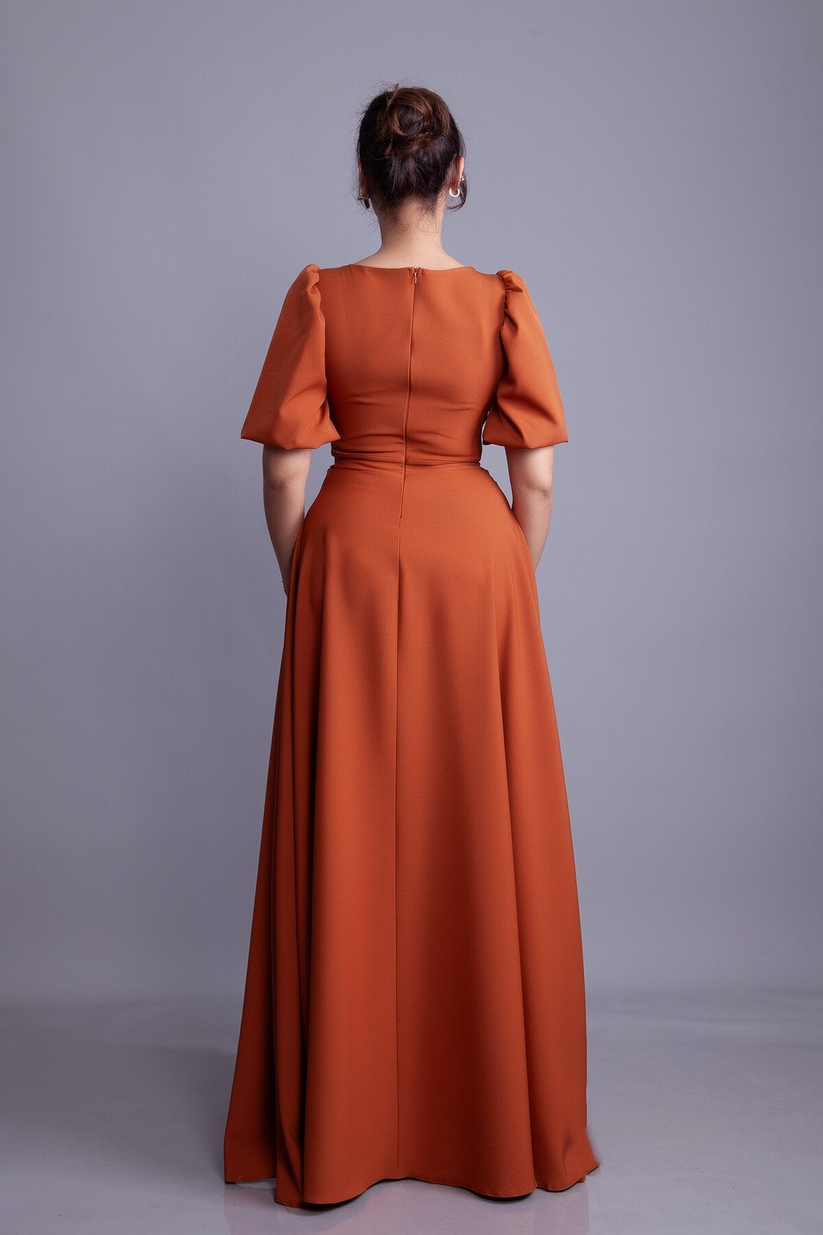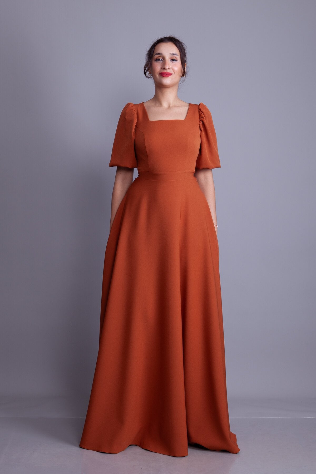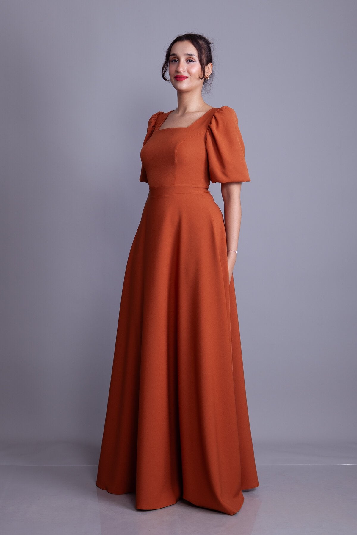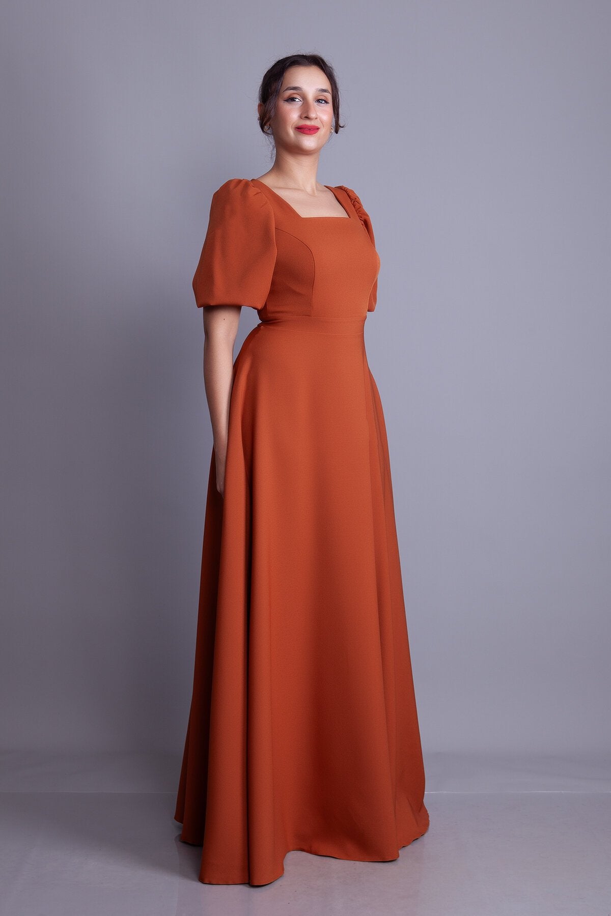 Long Square-Neck Balloon-Sleeve Evening Dress - Cinnamon