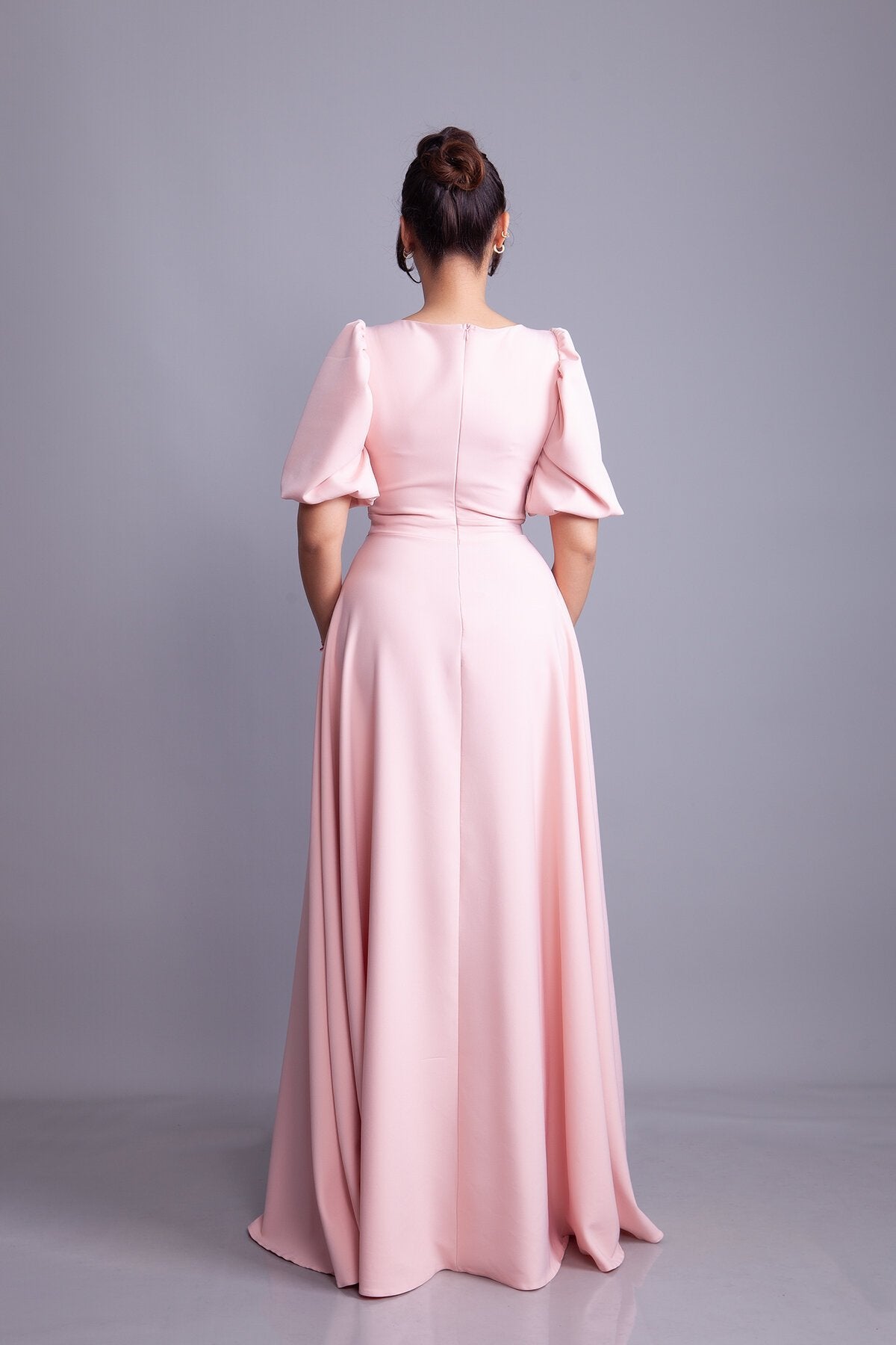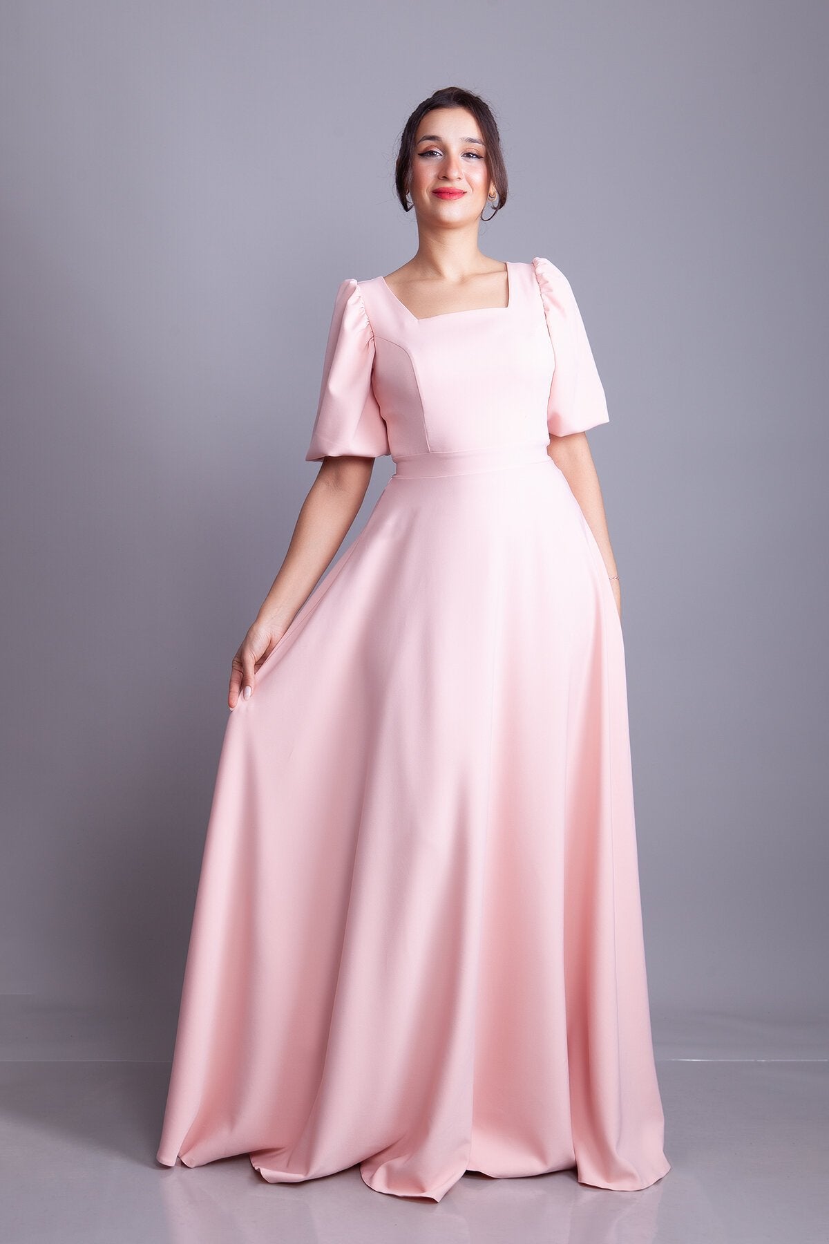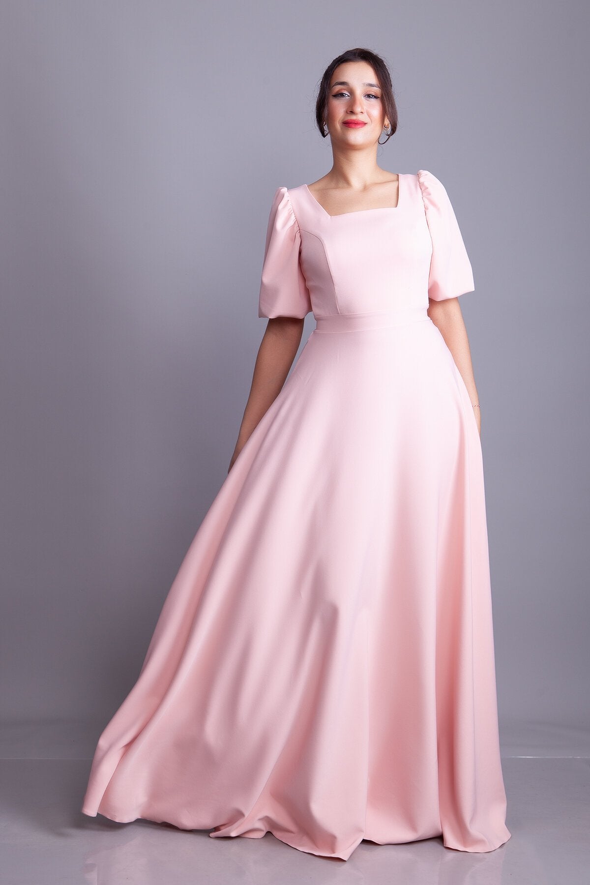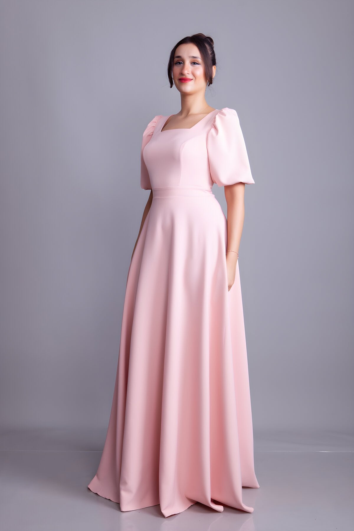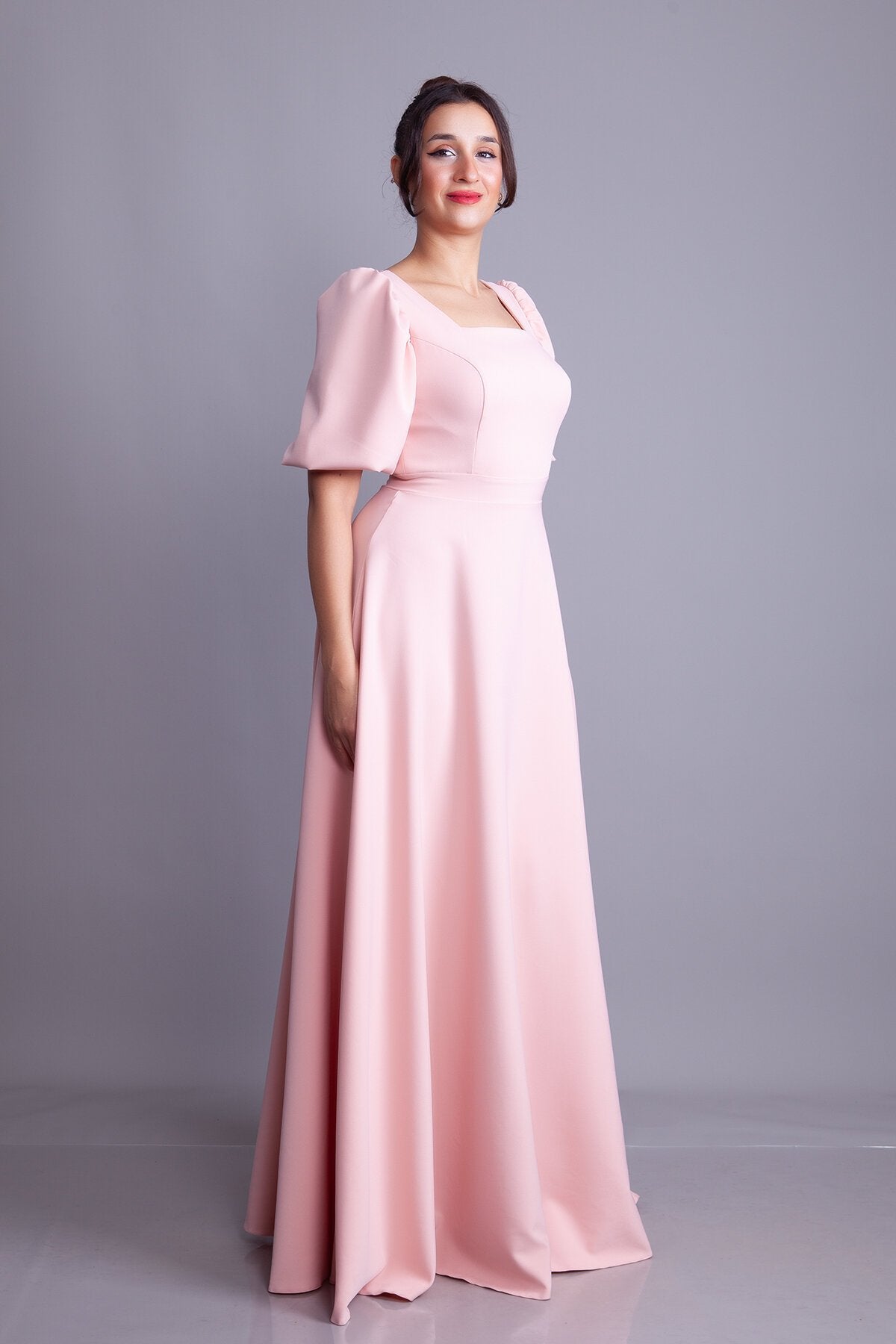 Long Square-Neck Balloon-Sleeve Evening Dress - Powder Pink