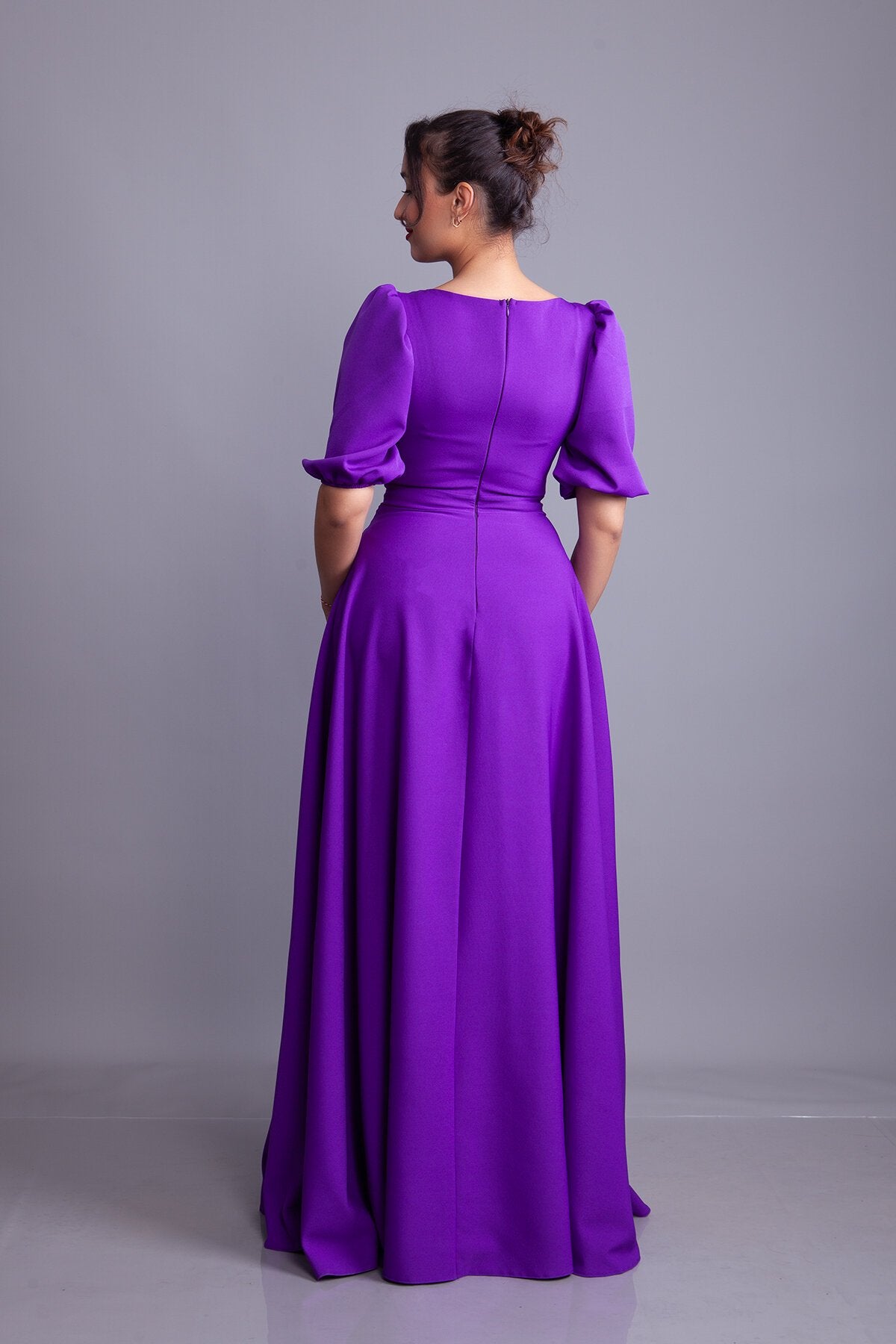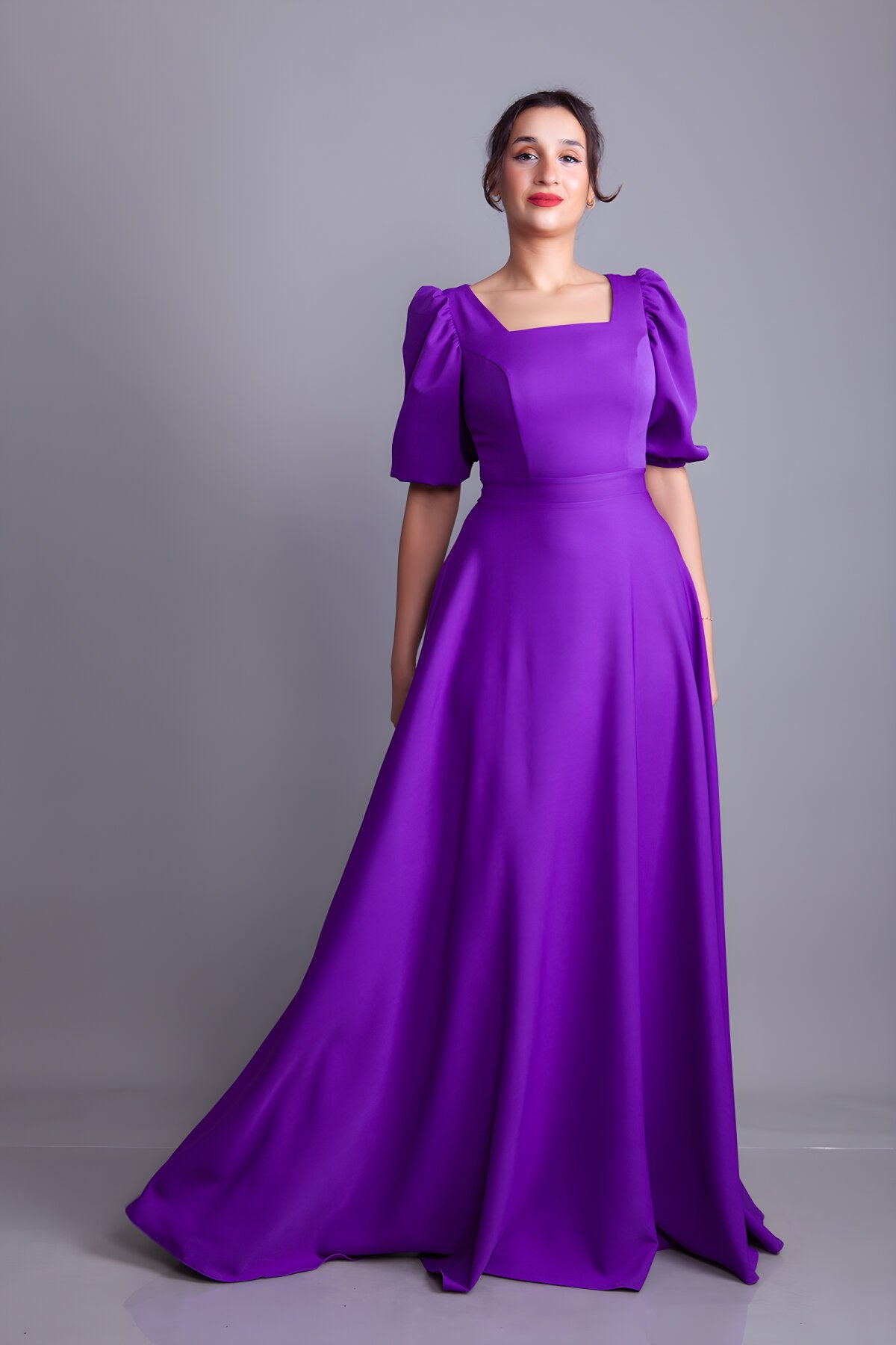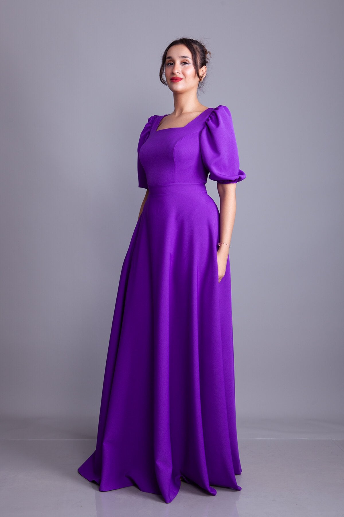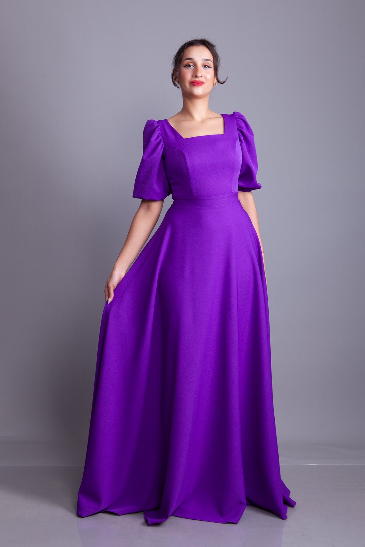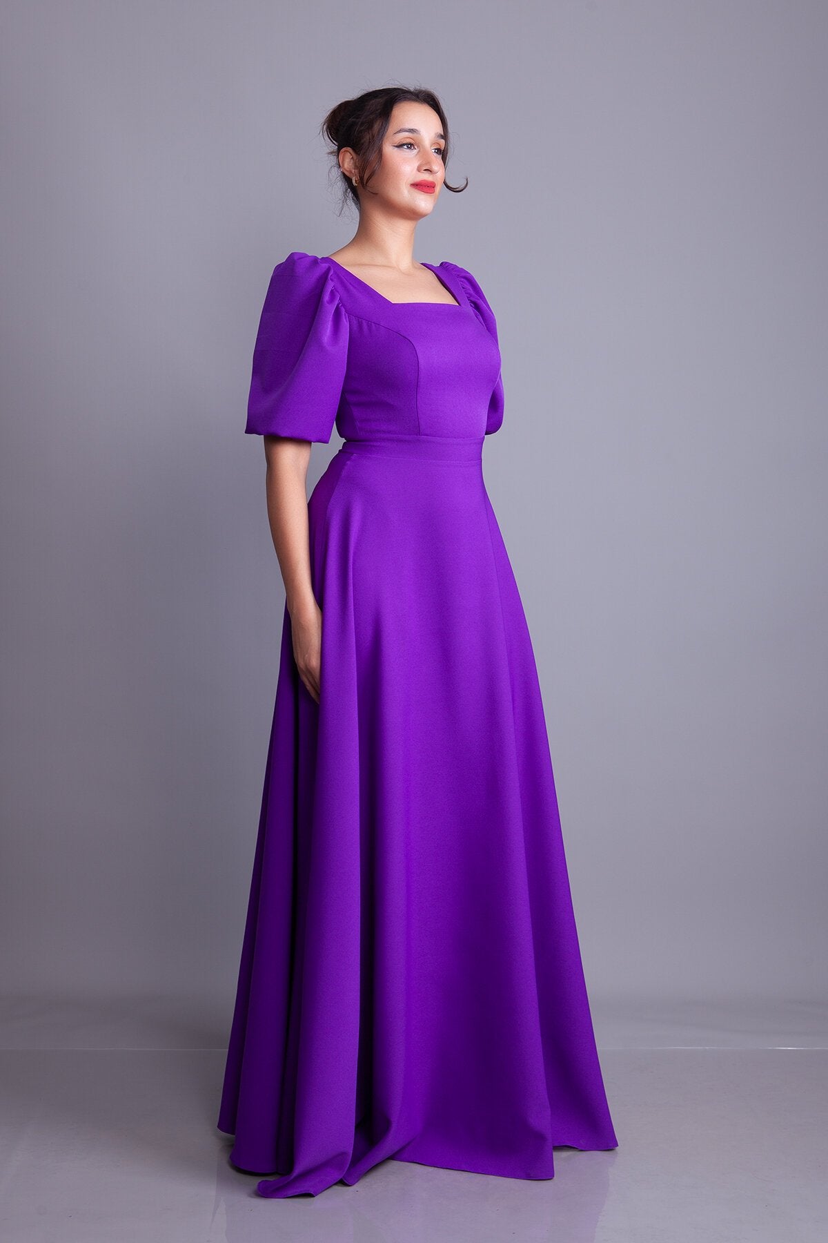 Long Square Neck Balloon Sleeve Evening Dress - Purple