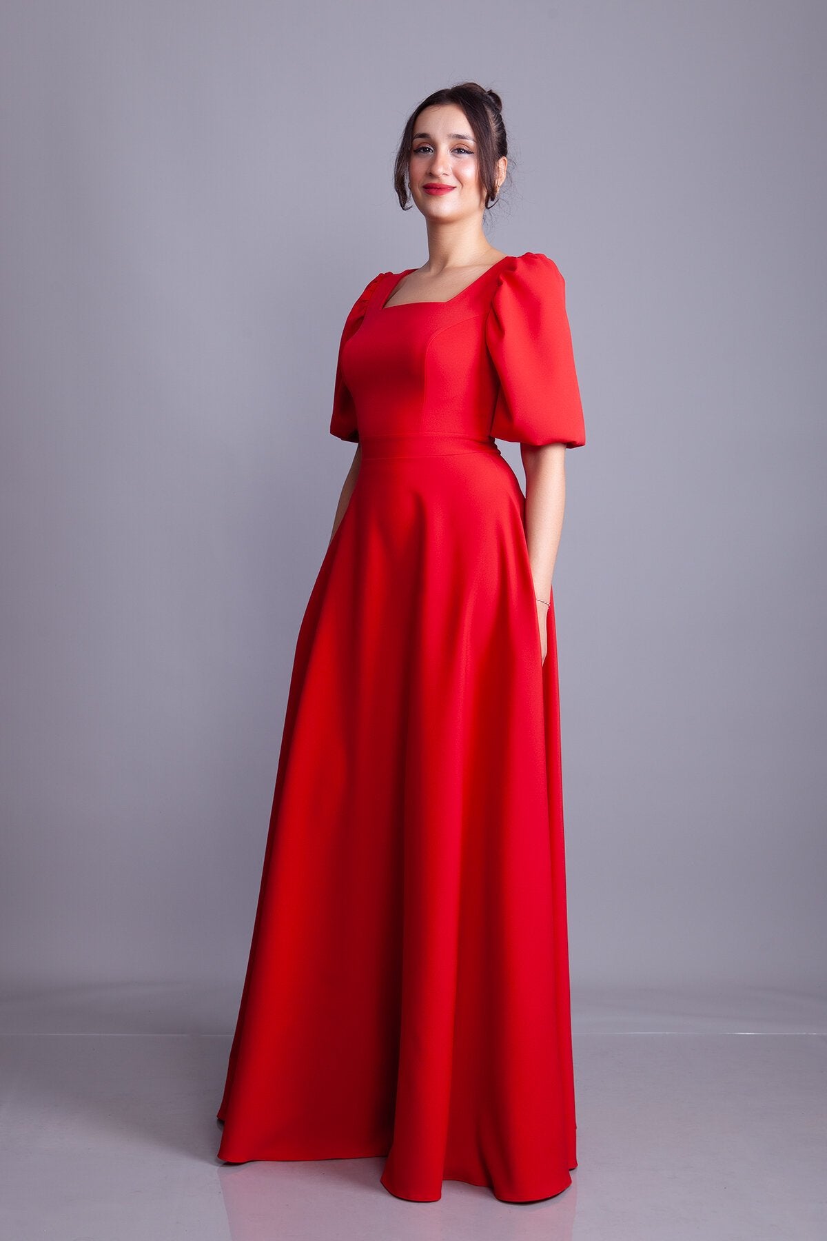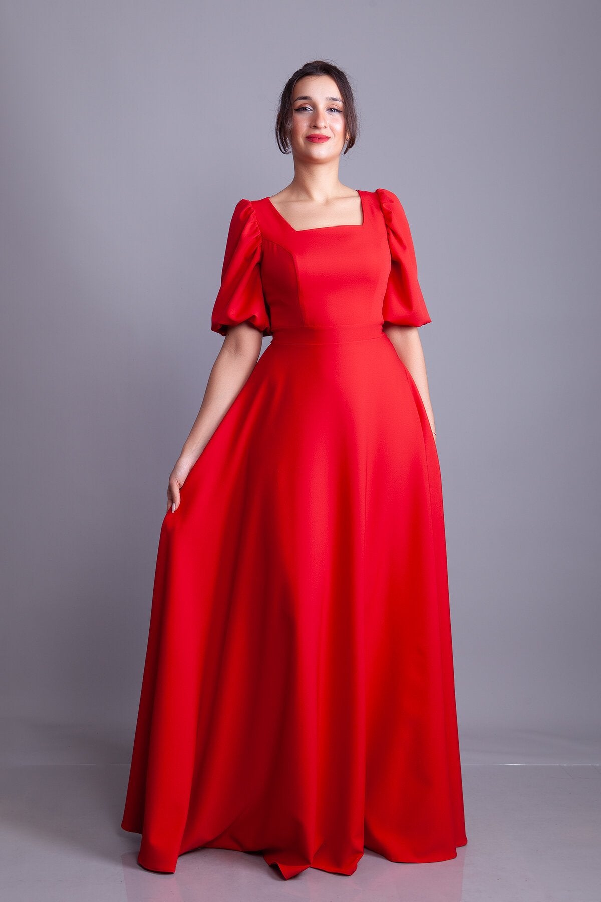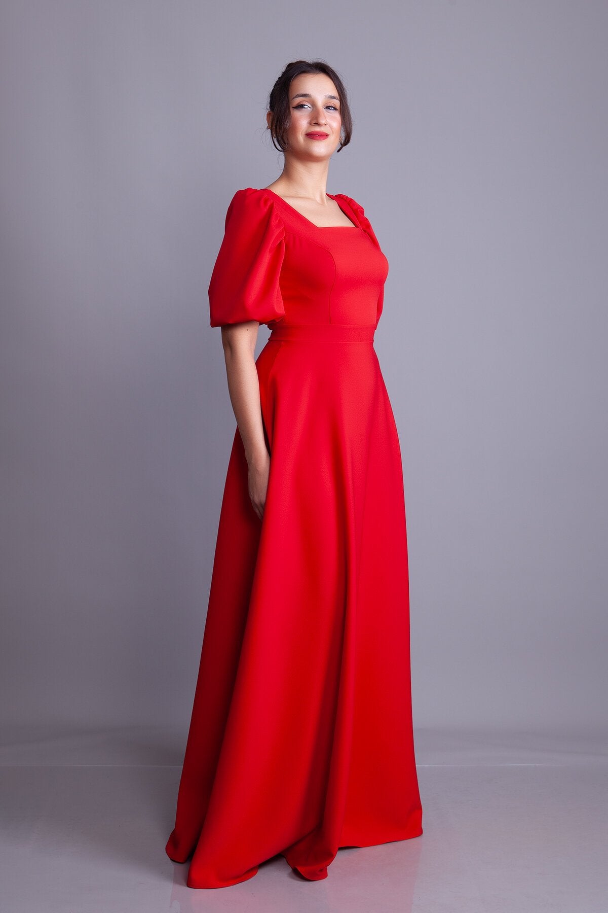 Long Square Neck Balloon Sleeve Evening Dress - Red