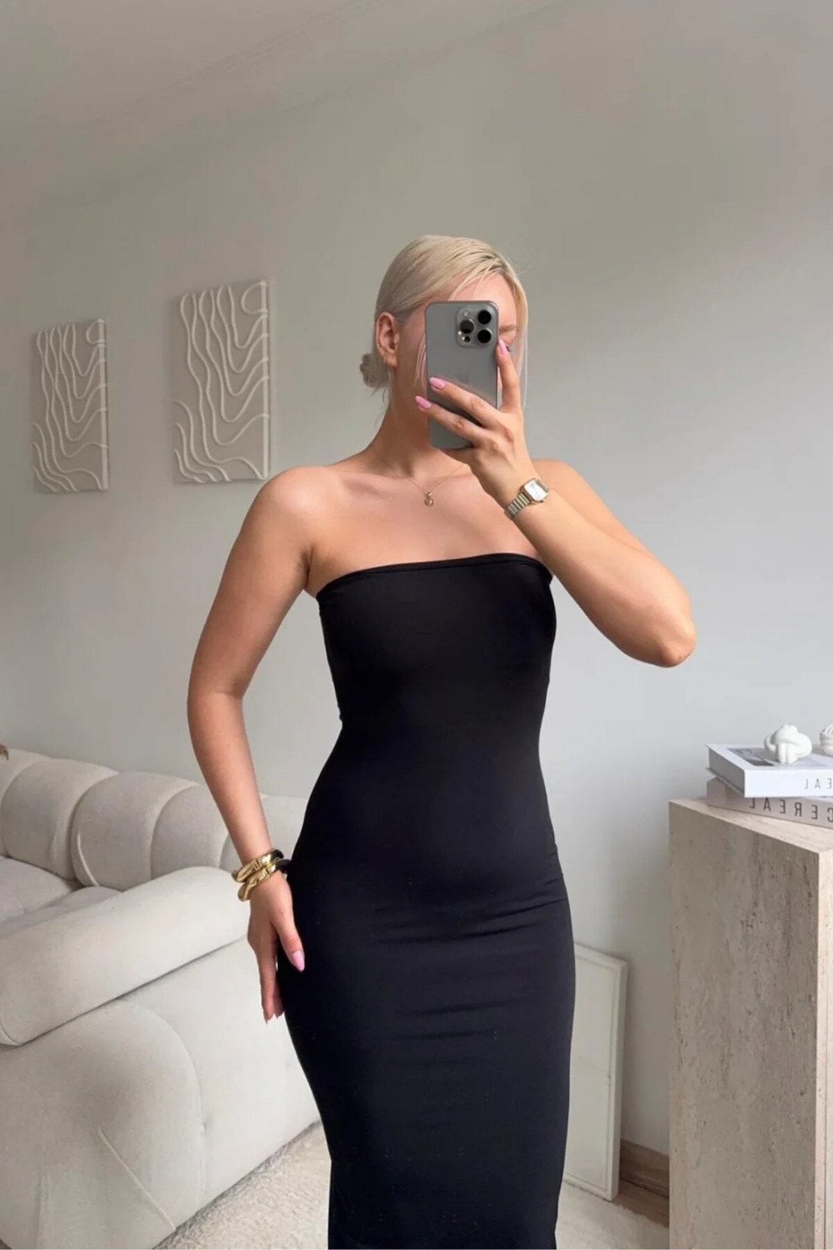 - Modern Strapless Neckline: The sleek, straight-across neckline provides a contemporary feel, creating the perfect canvas to showcase your favorite statement necklace or elegant earrings.