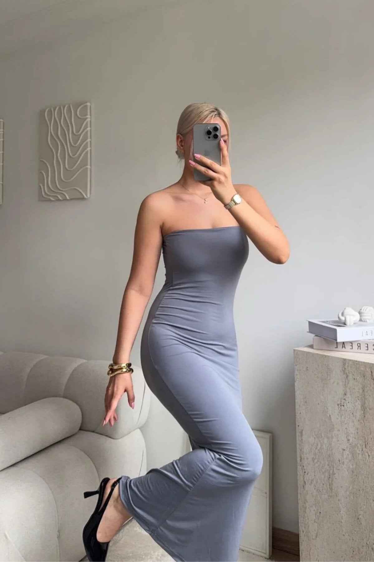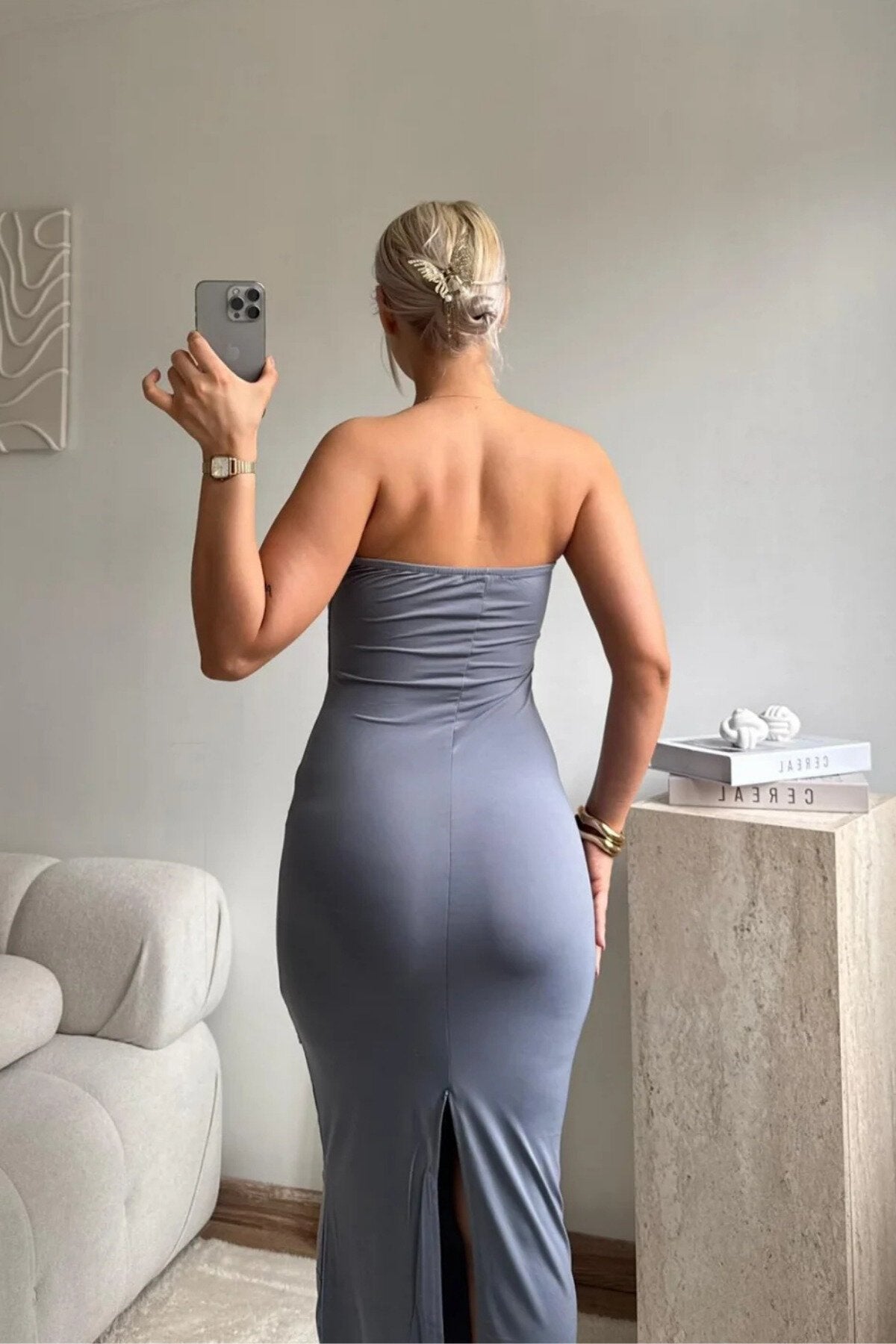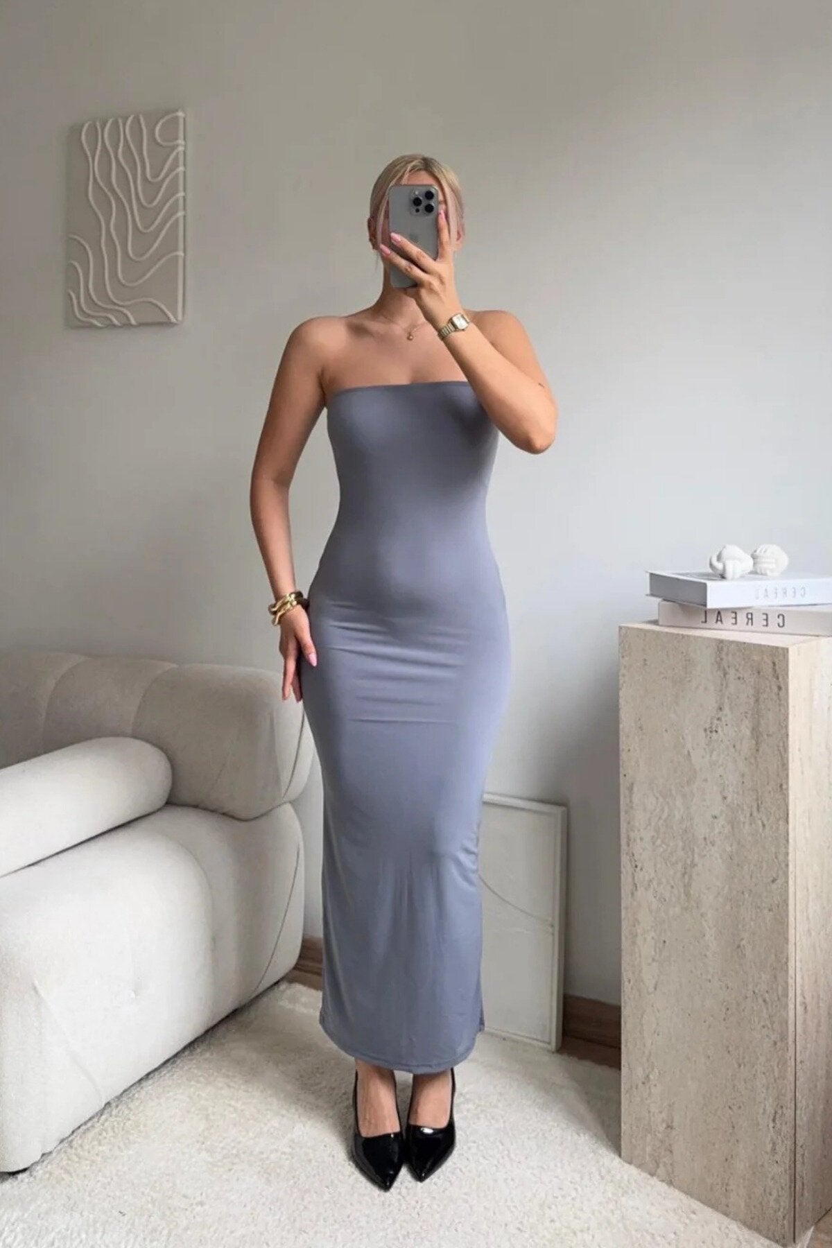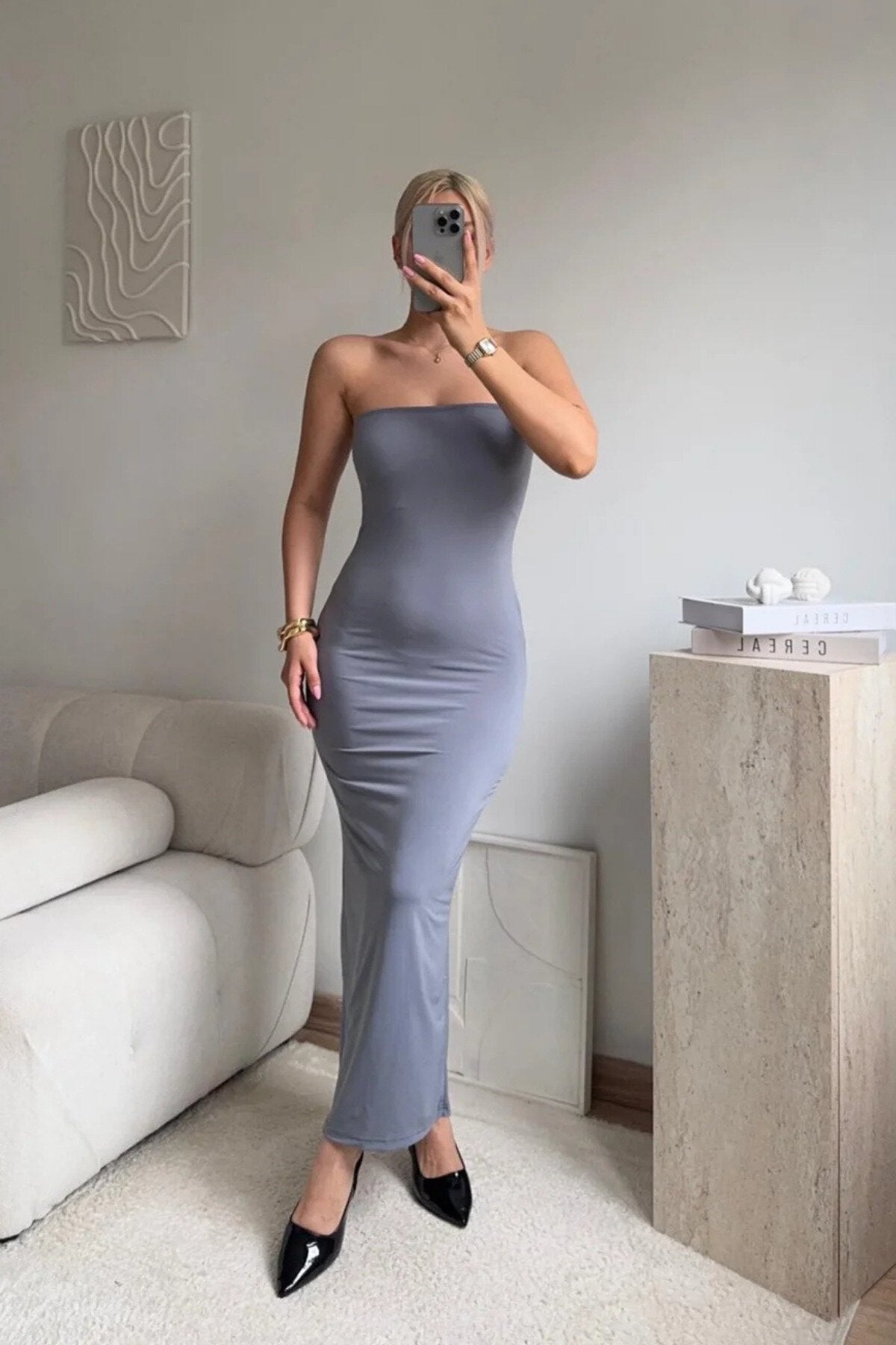Versatile and effortlessly chic, this grey strapless dress is a wardrobe staple that transitions seamlessly across various upscale settings. Its neutral tone and classic cut make it the perfect canvas for expressing your unique style through bold or understated accessories.