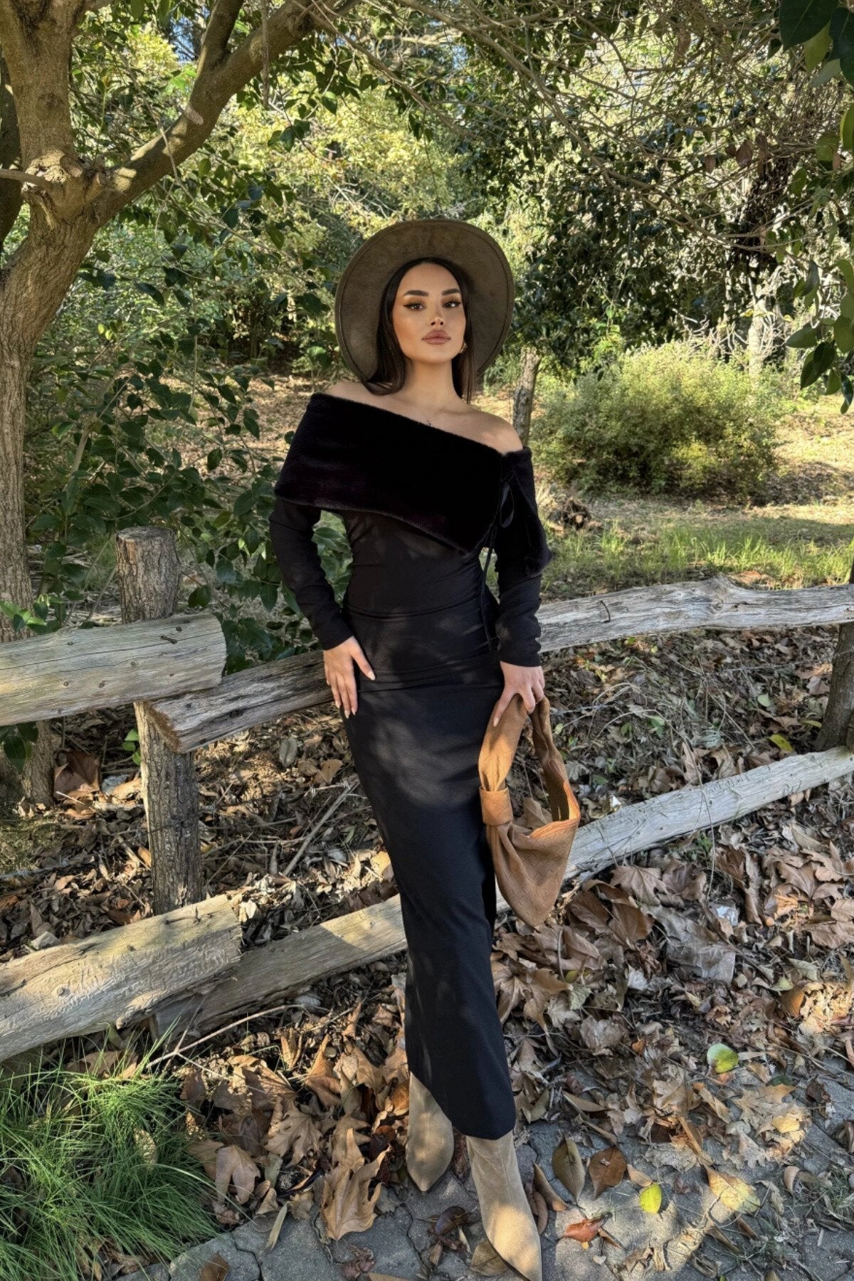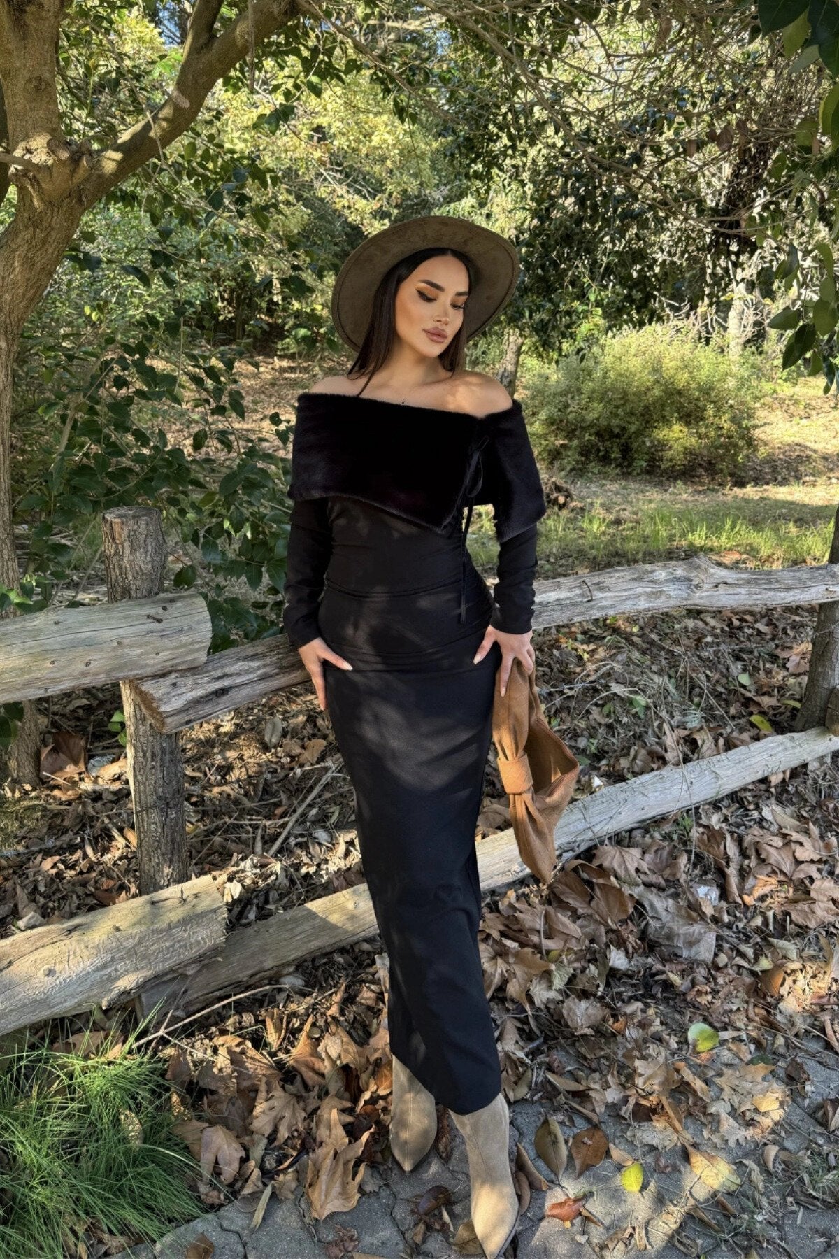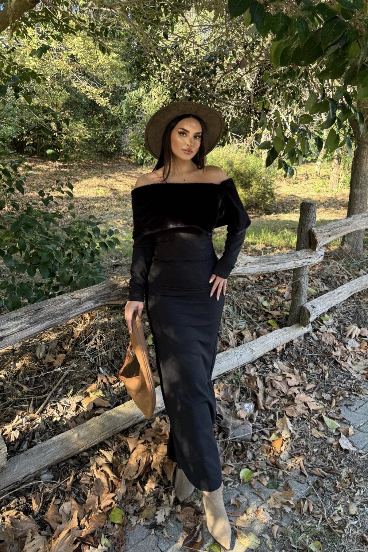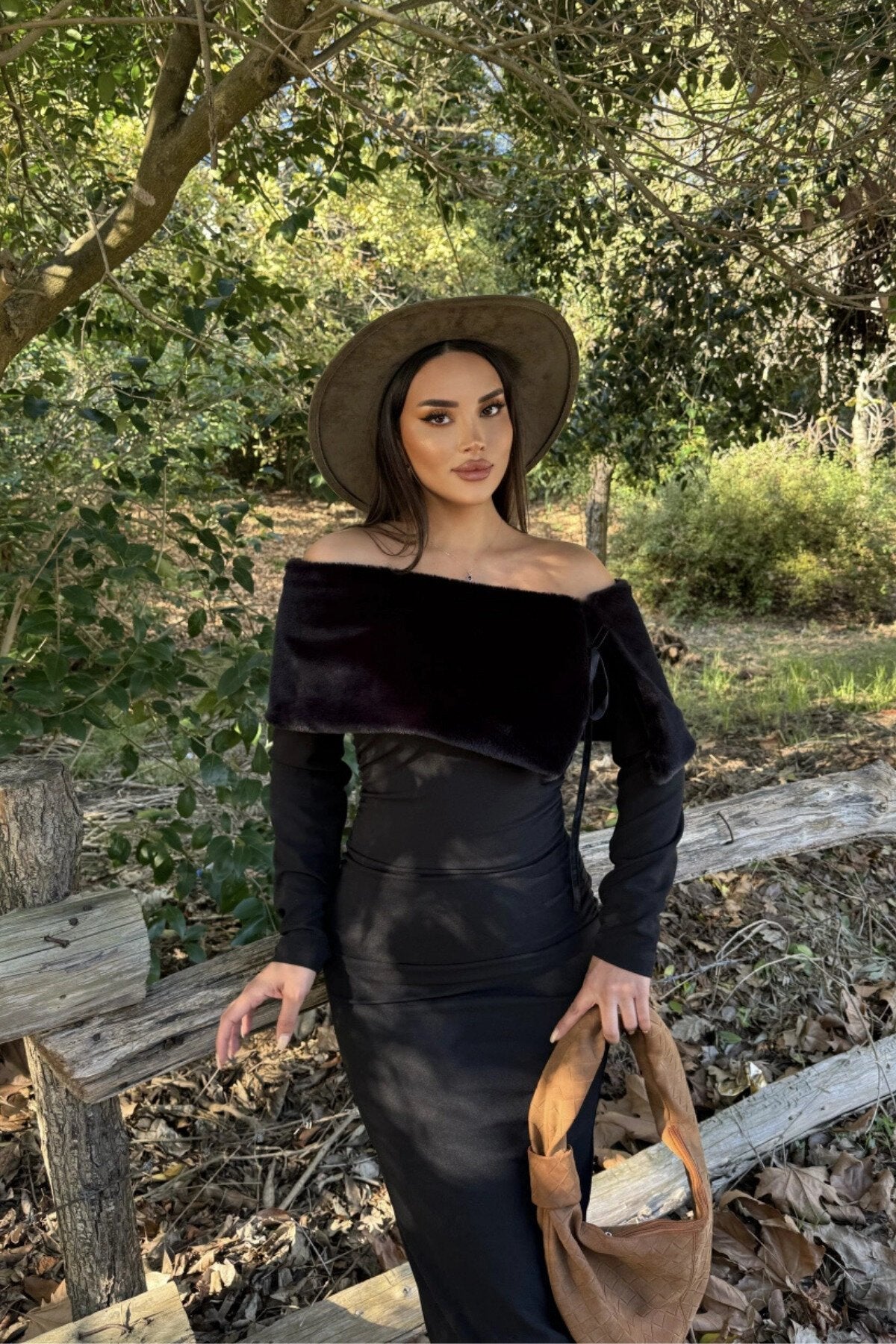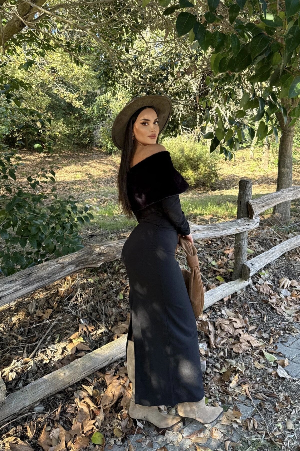Long Strapless Slit Faux Fur Detail Dress - Black