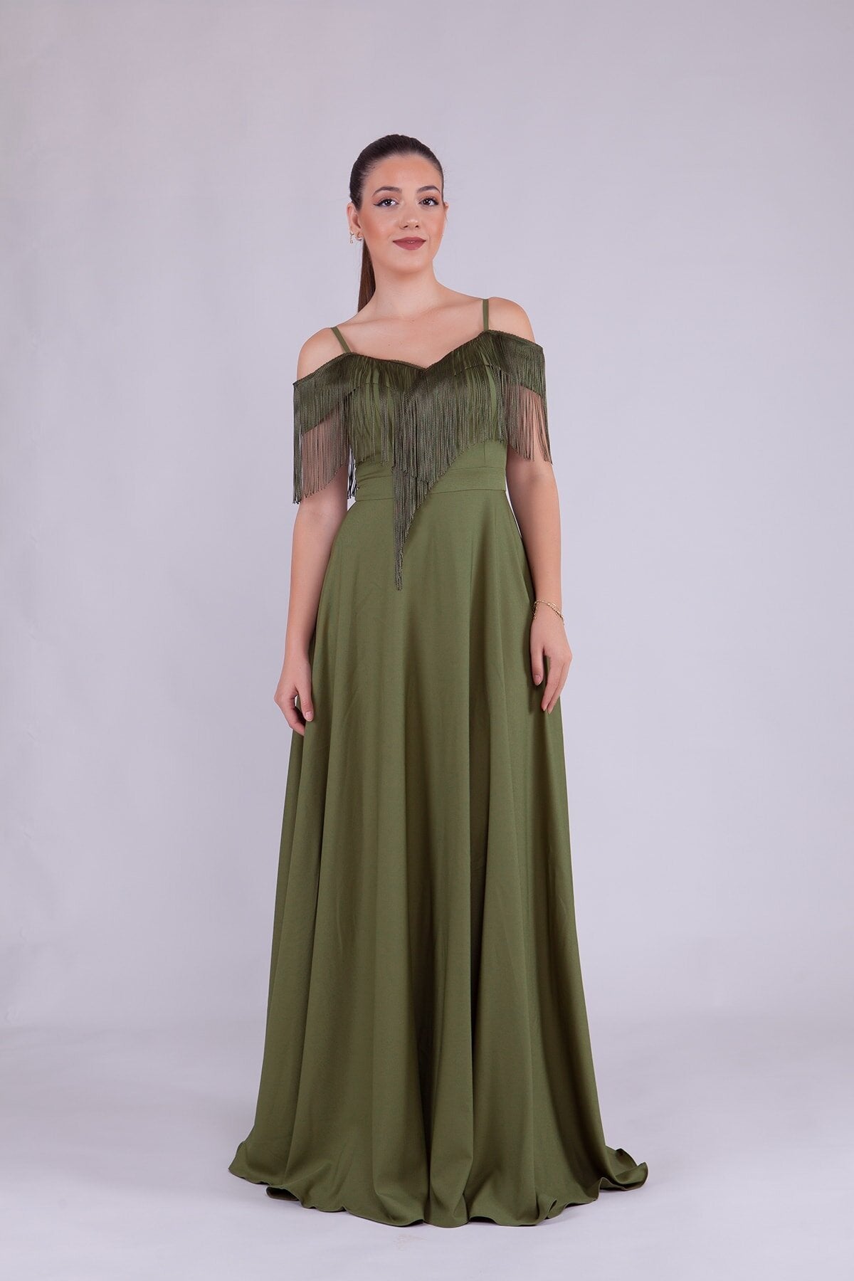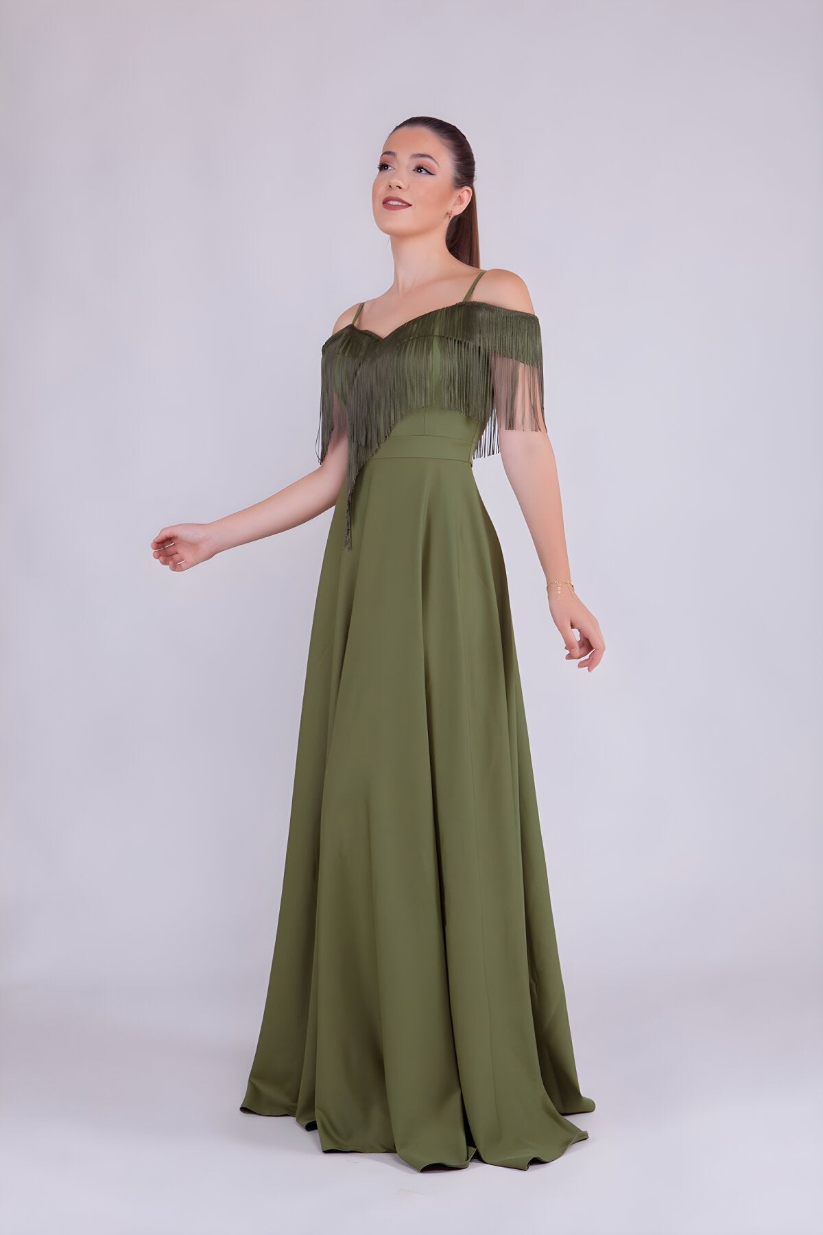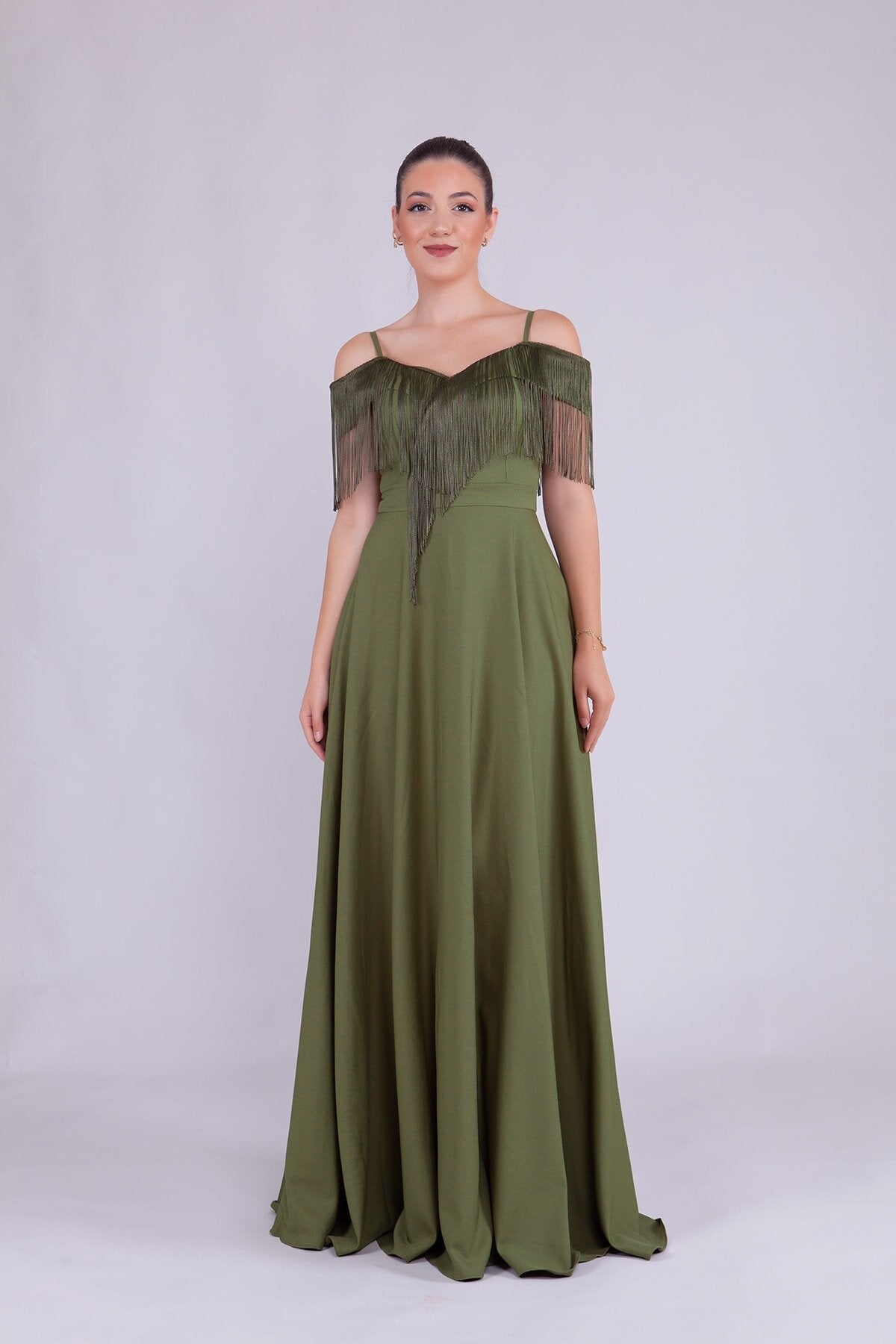 Long Strappy Boat Neck Tassel Detail Evening Dress - Khaki