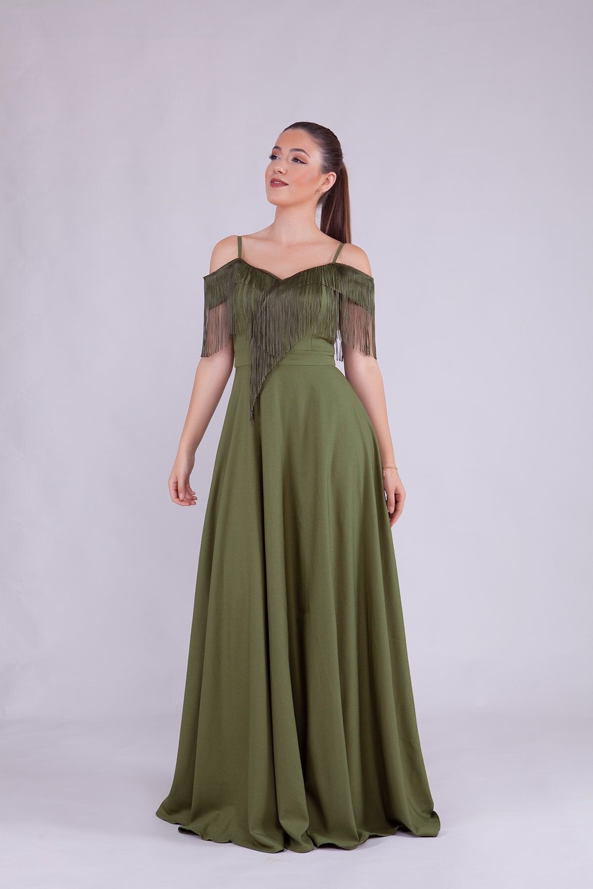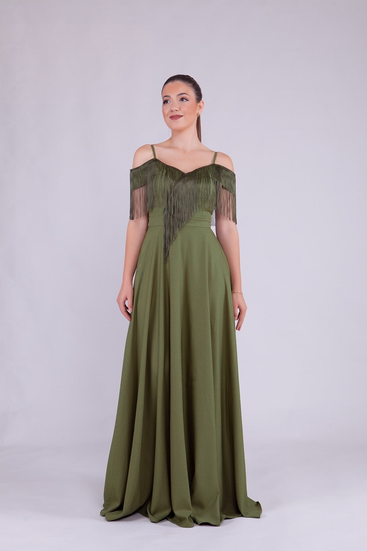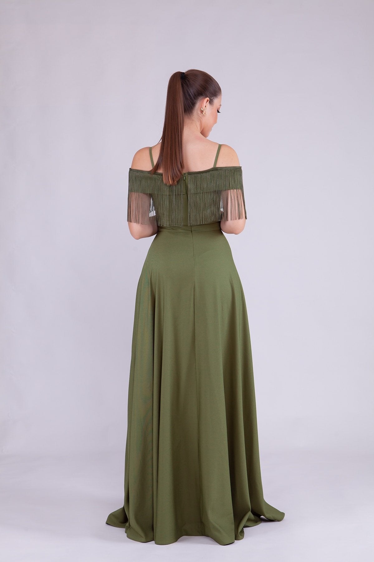 Long Strappy Boat Neck Tassel Detail Evening Dress - Khaki
