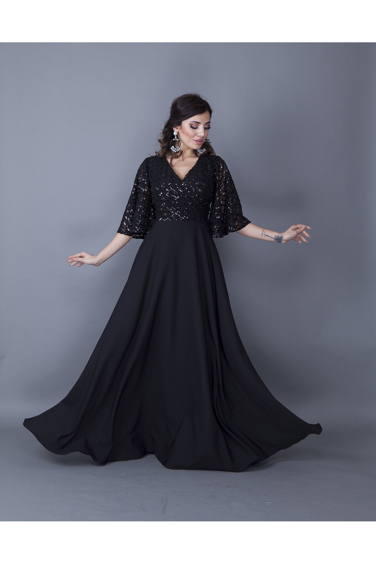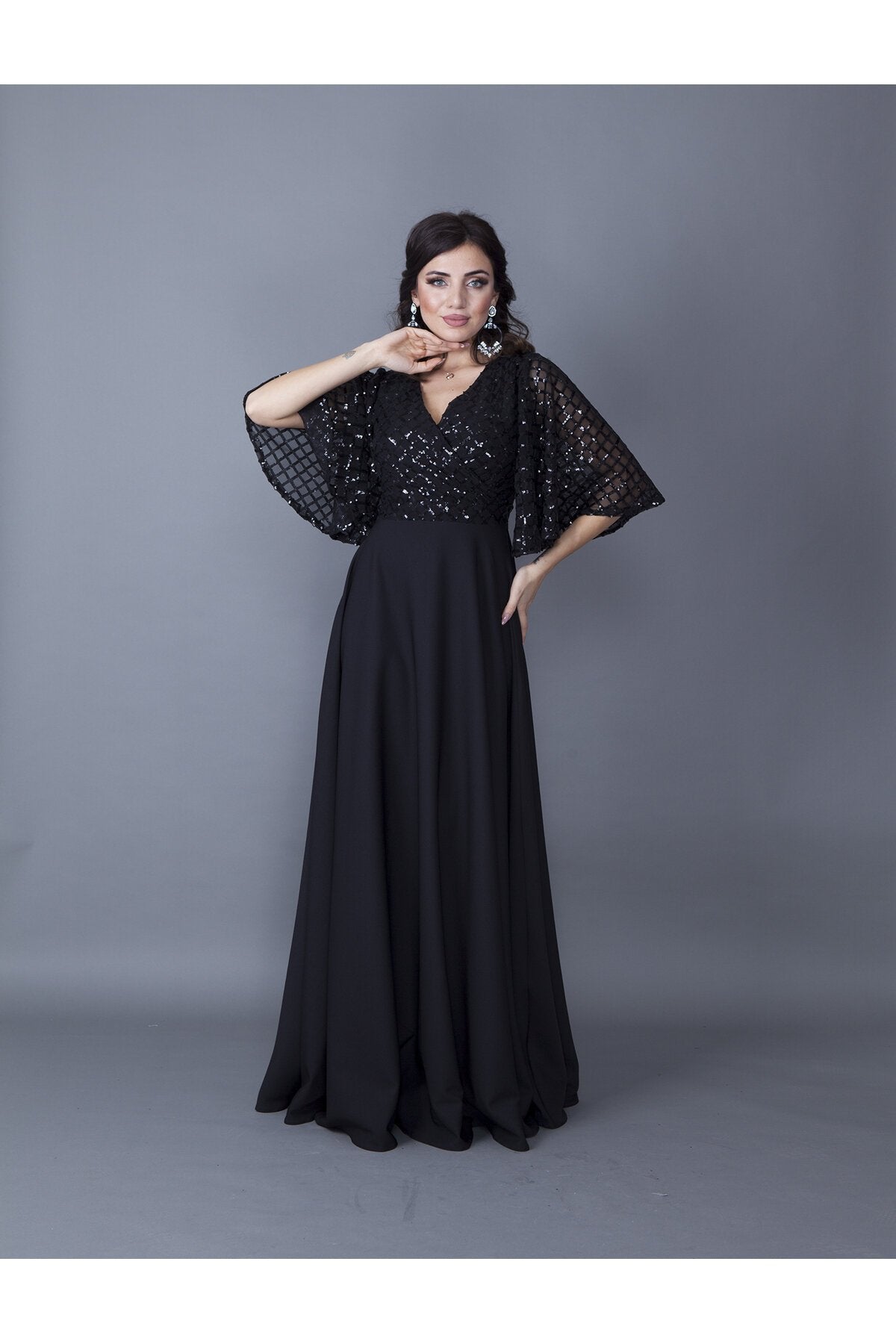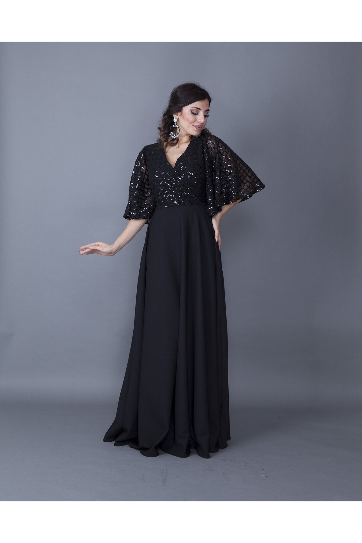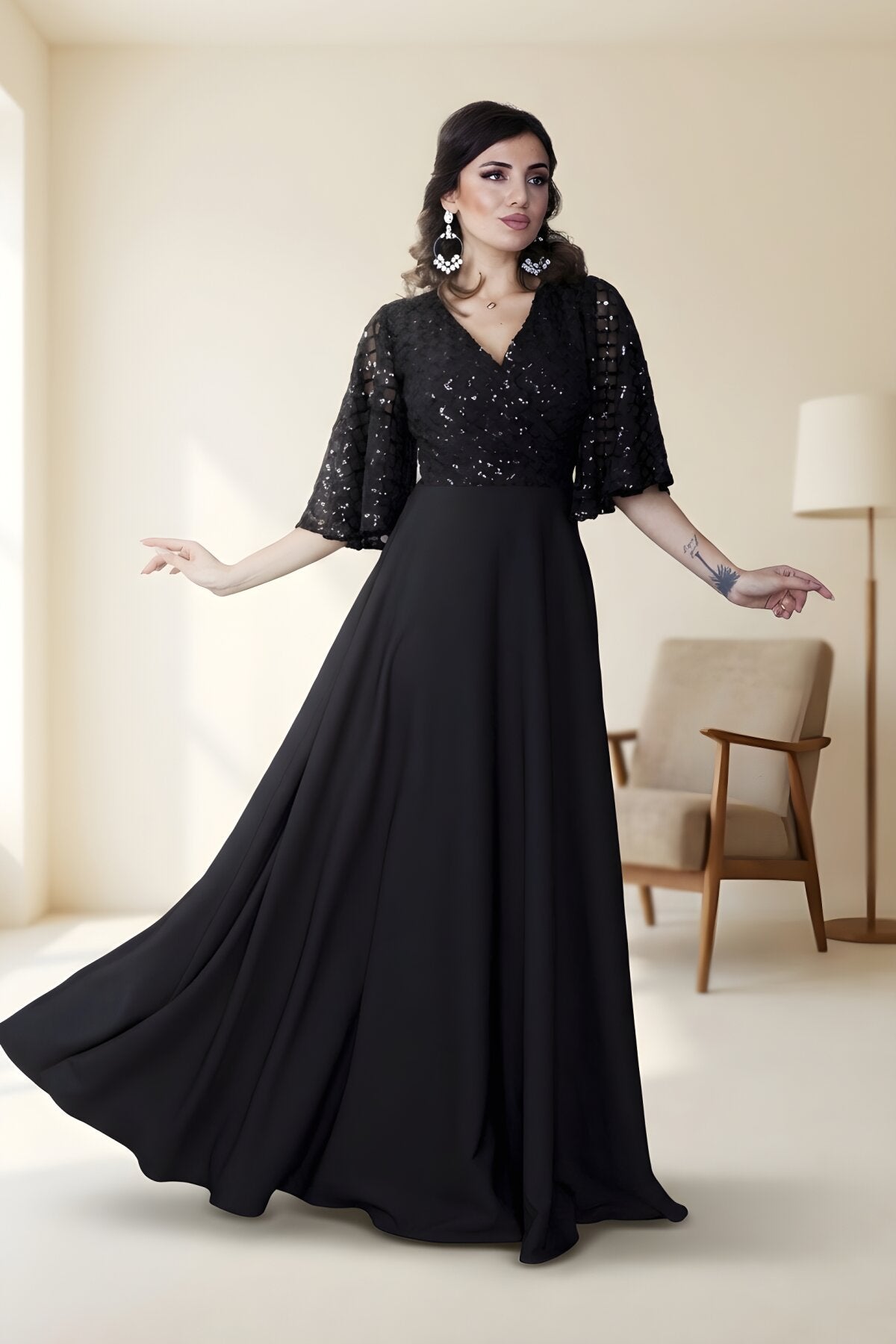 Long Surplice Neck Batwing Sleeve Sequin Evening Dress - Black