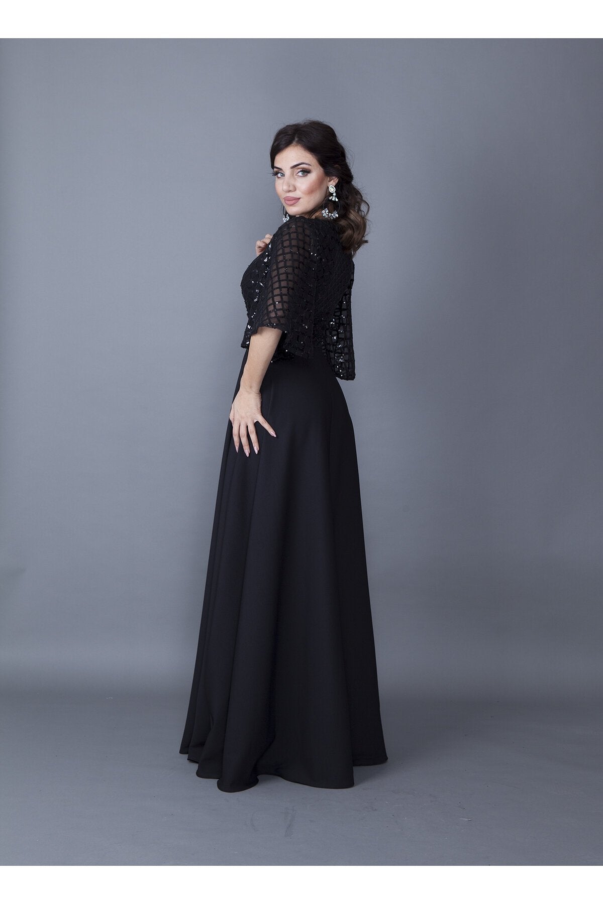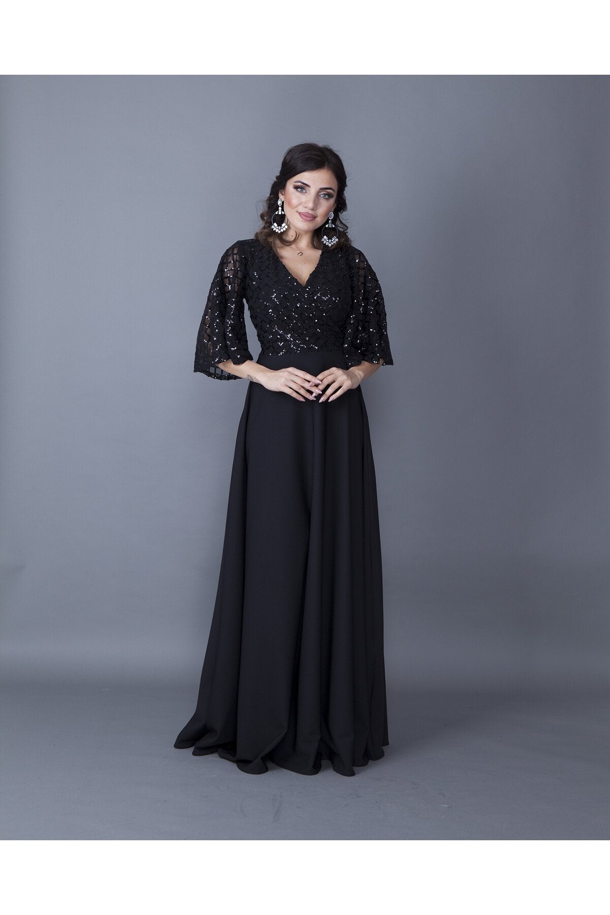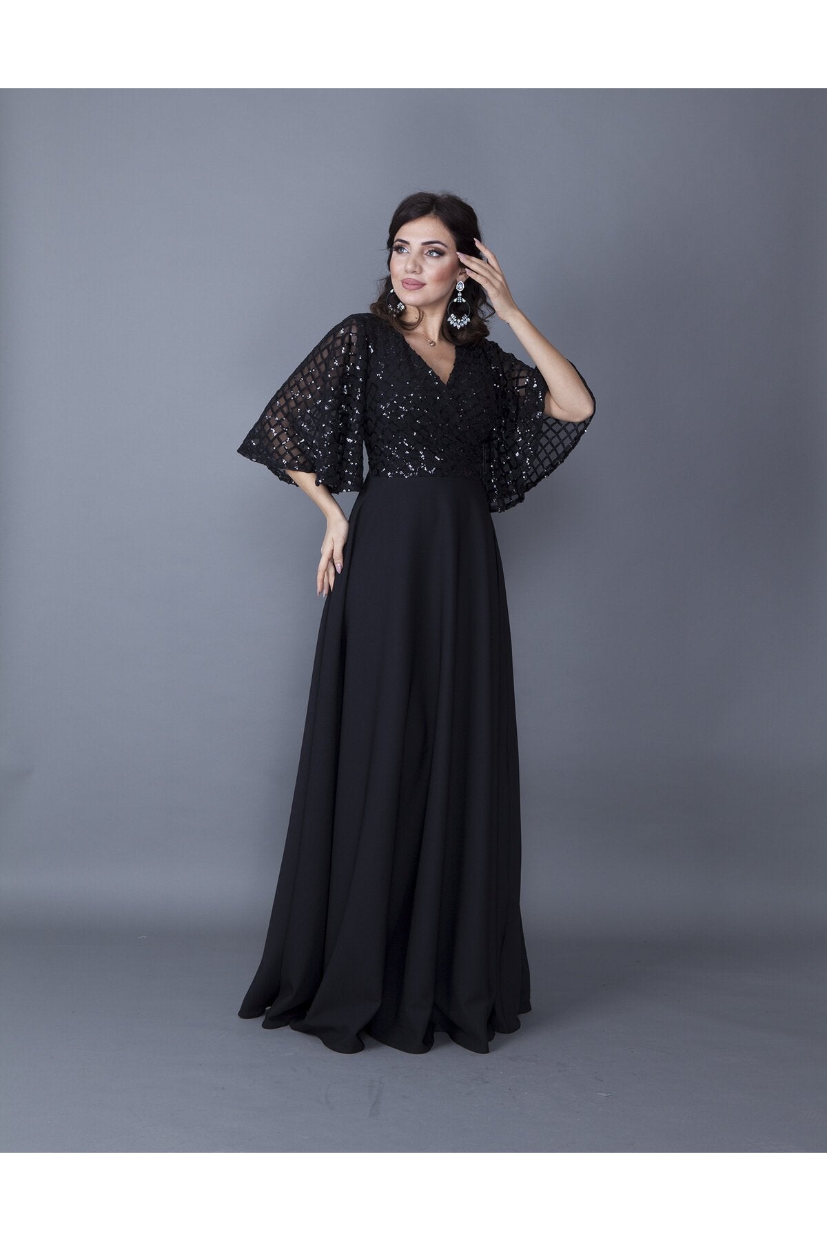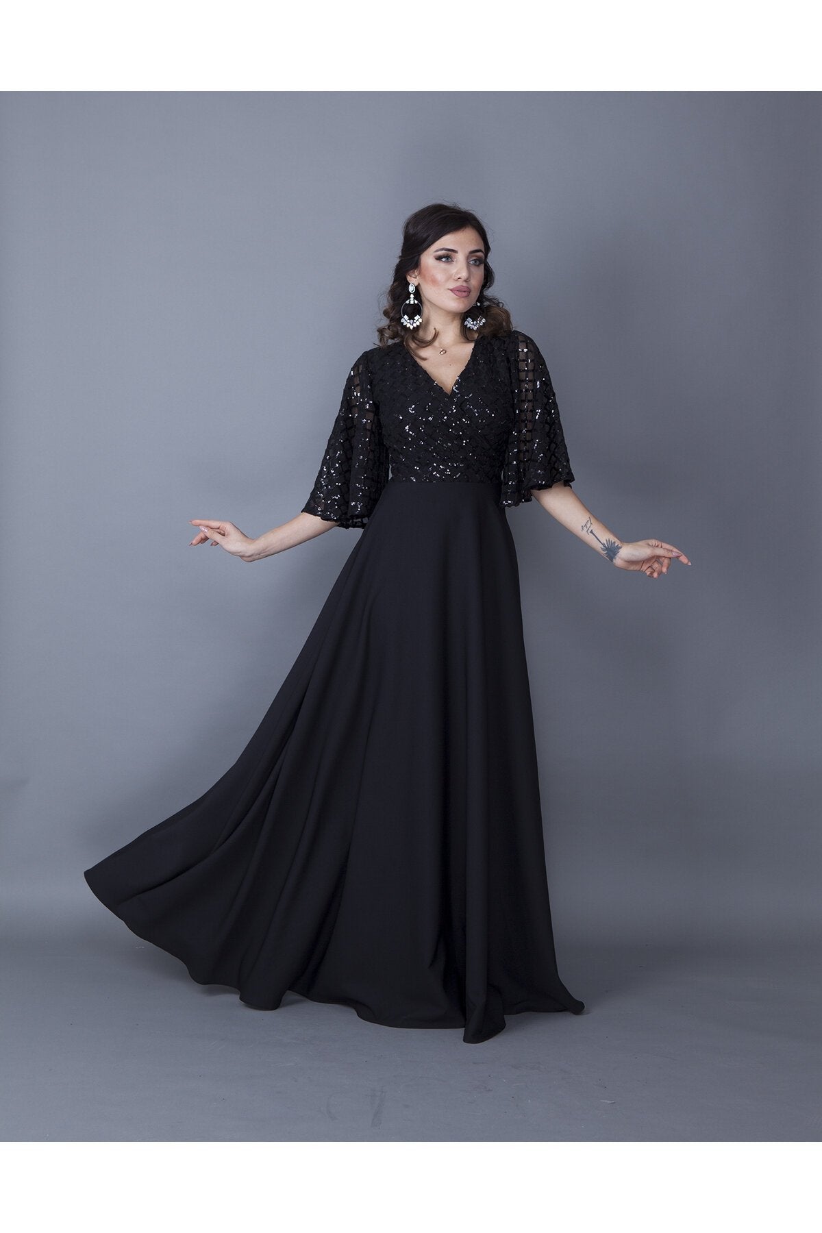 Long Surplice Neck Batwing Sleeve Sequin Evening Dress - Black