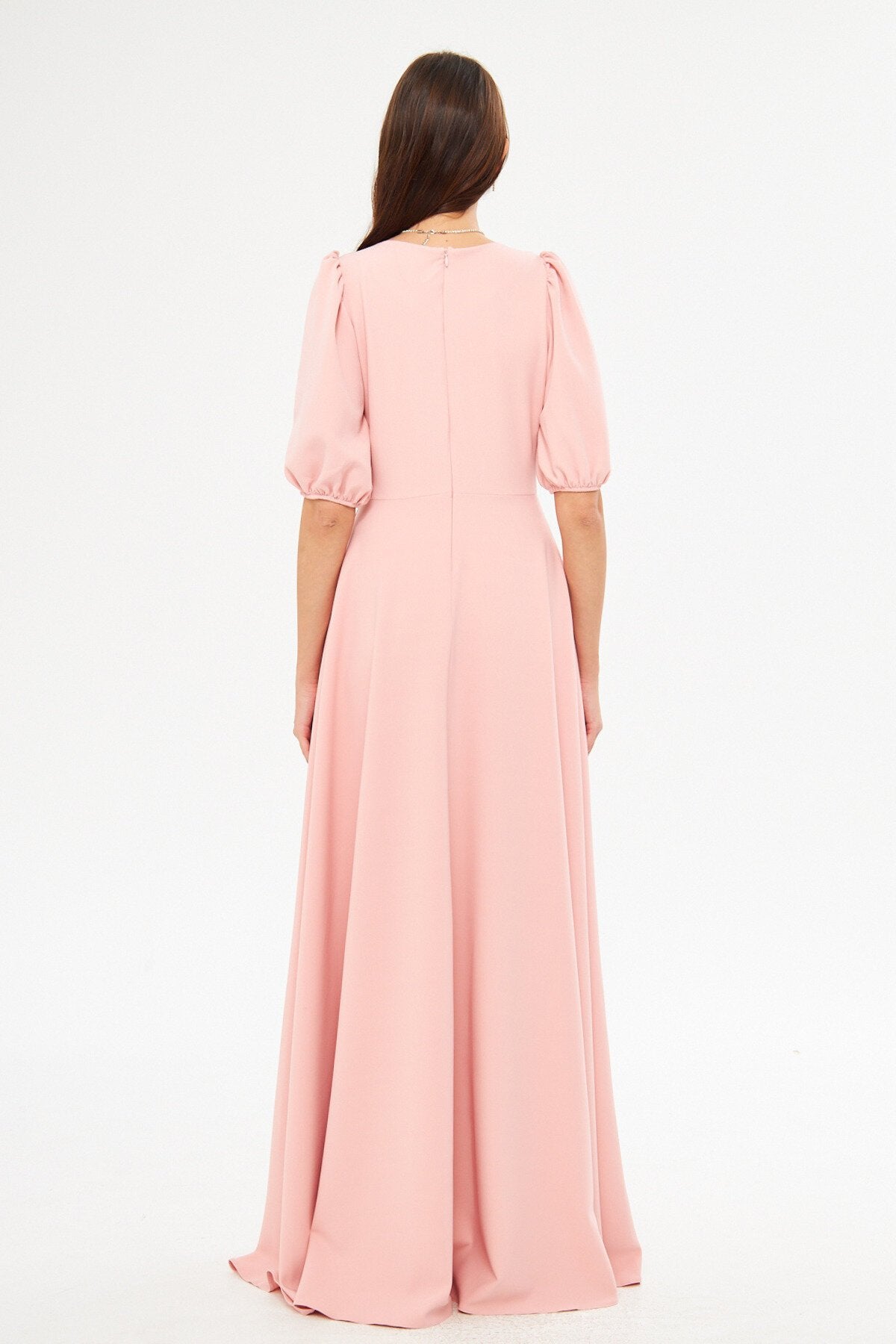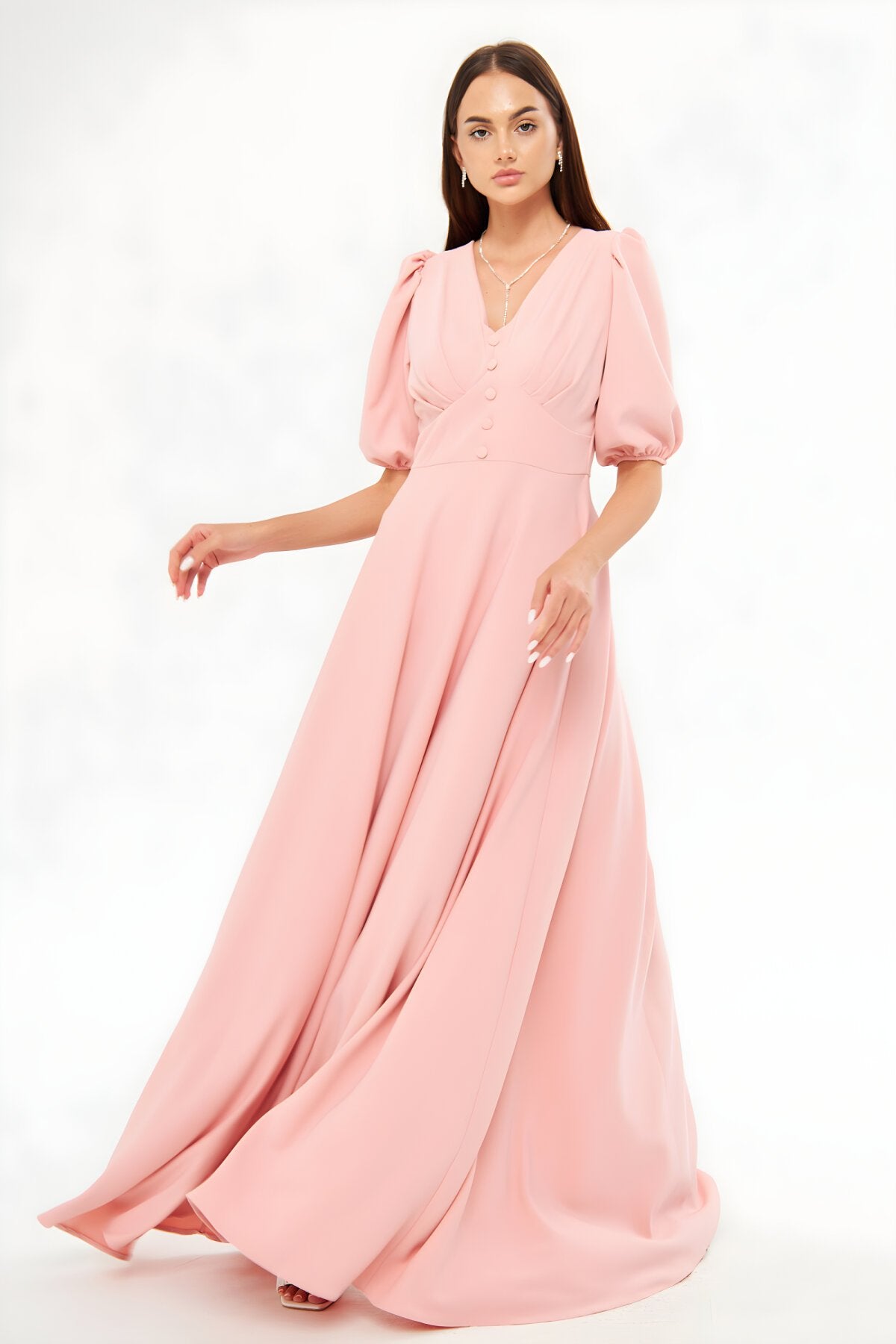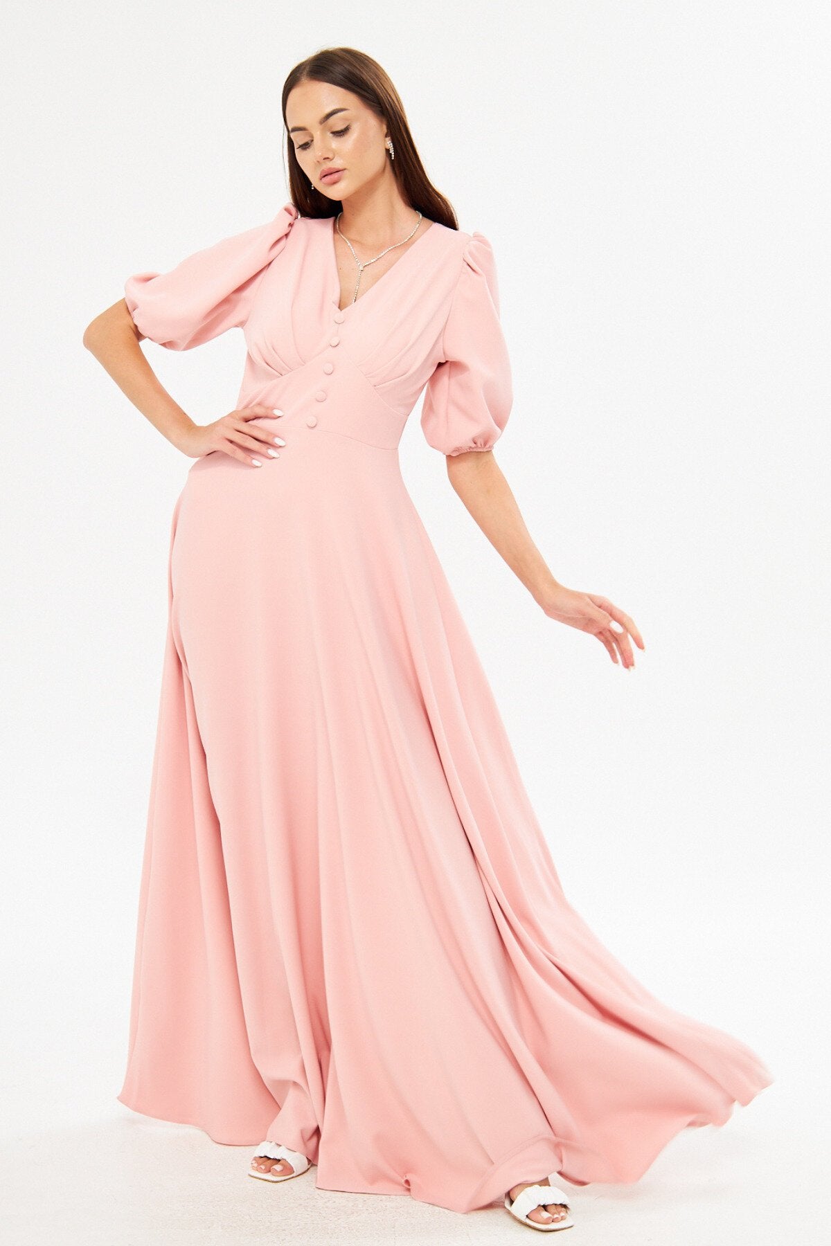 Long V-Neck Balloon Sleeve Pleated Belted Evening Dress - Powder