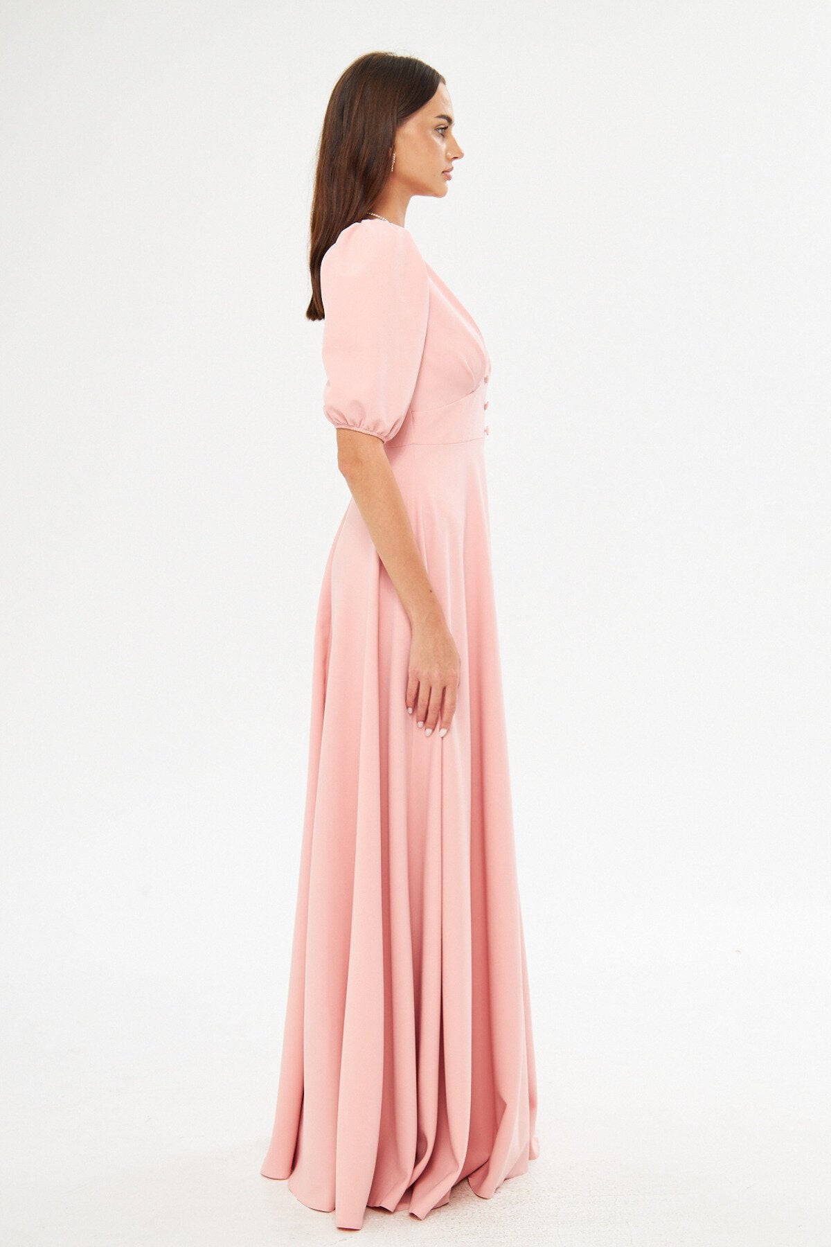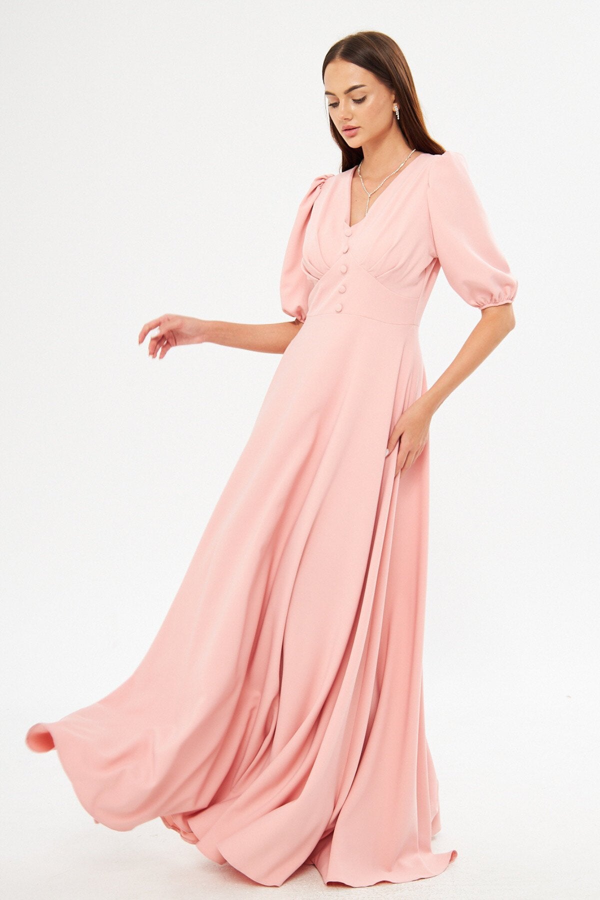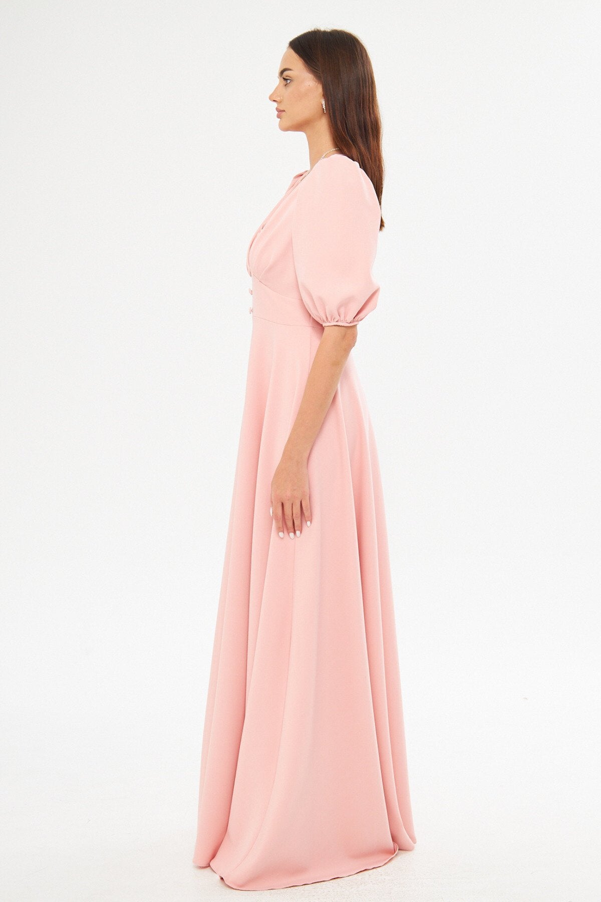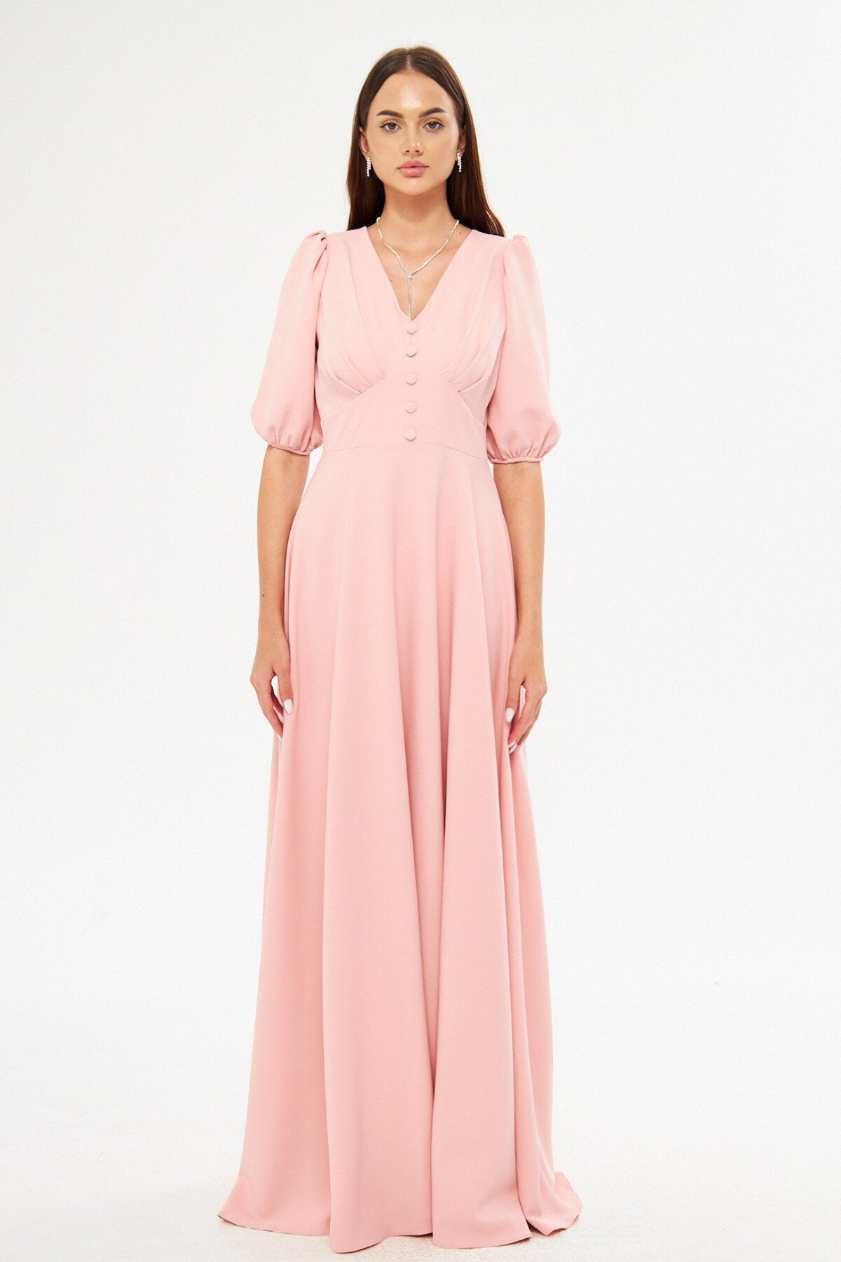 Long V-Neck Balloon Sleeve Pleated Belted Evening Dress - Powder