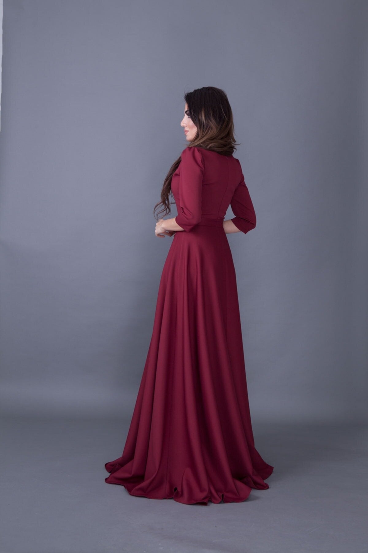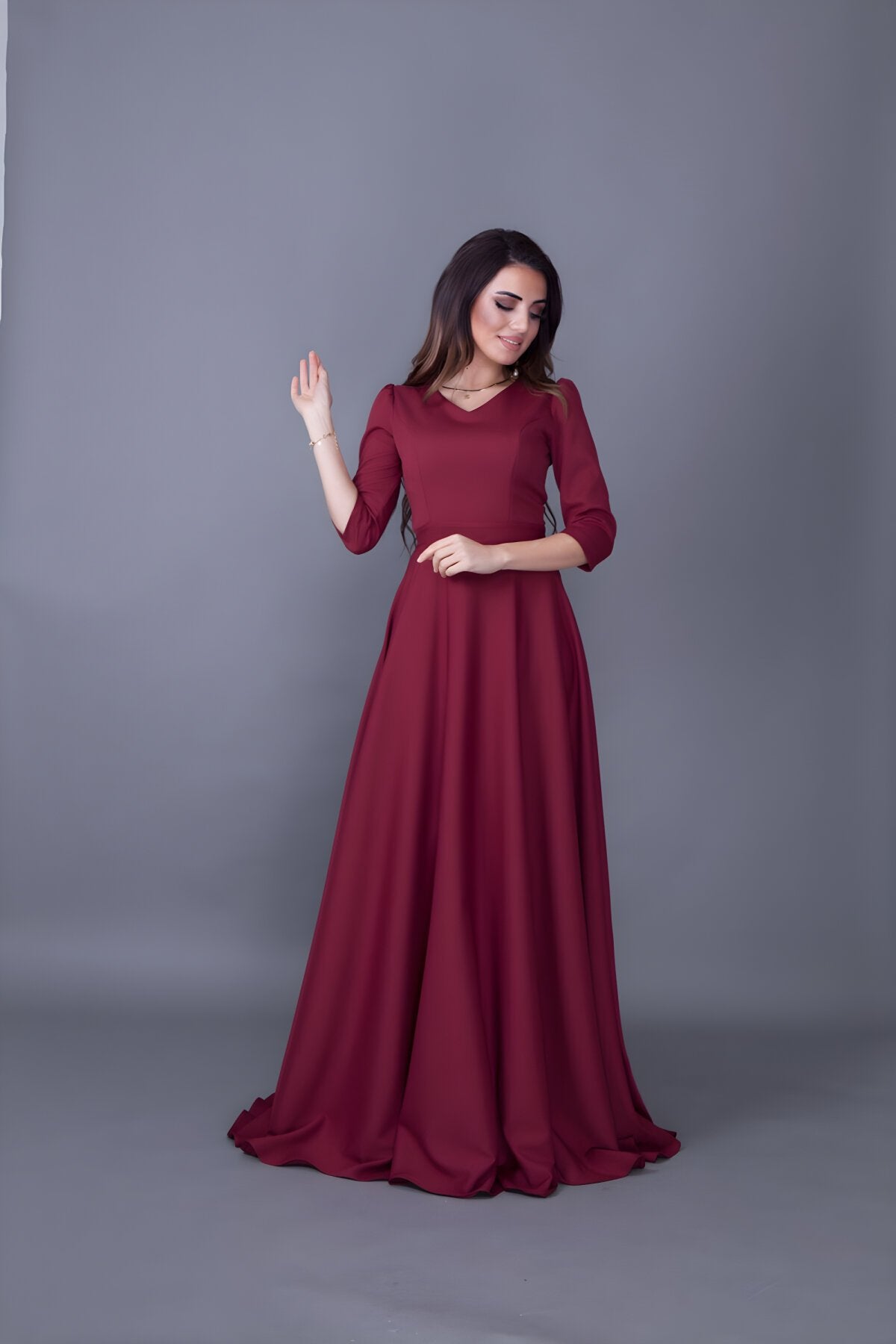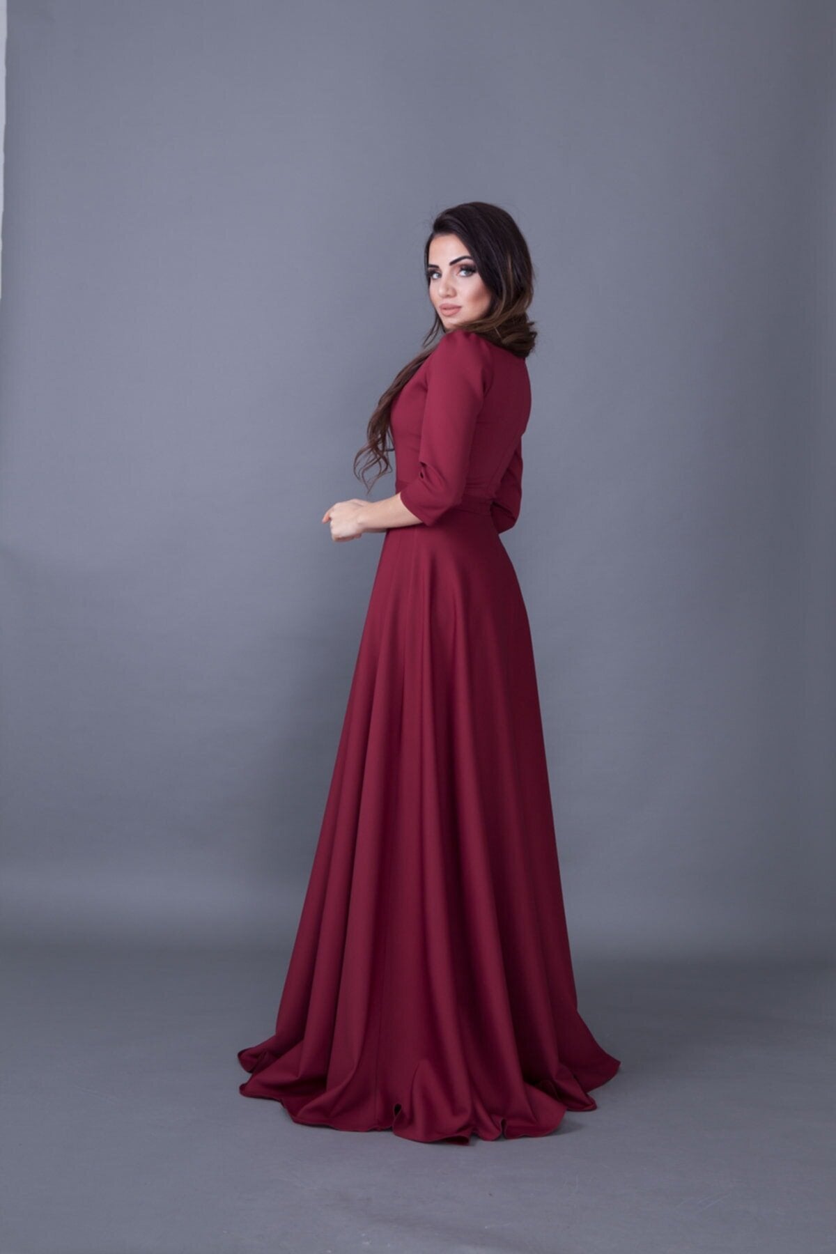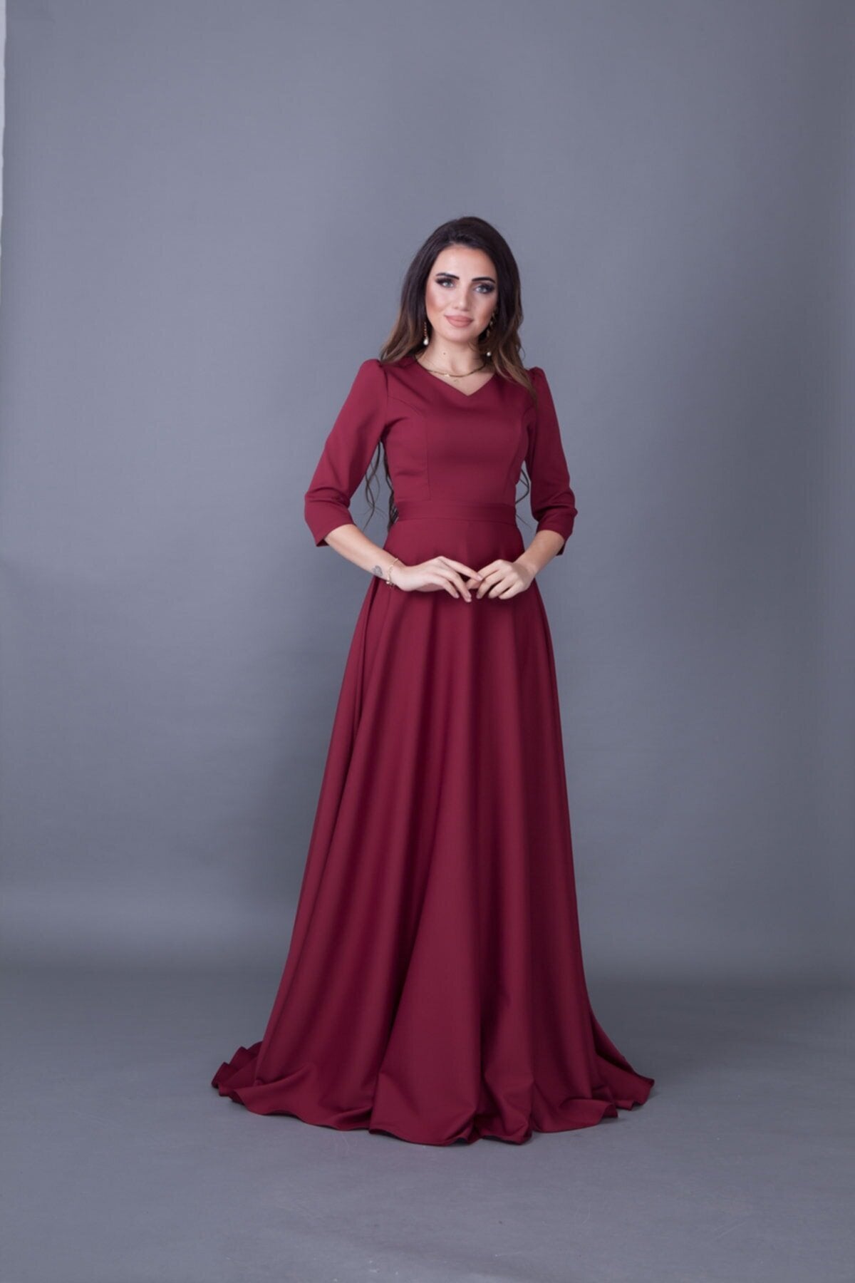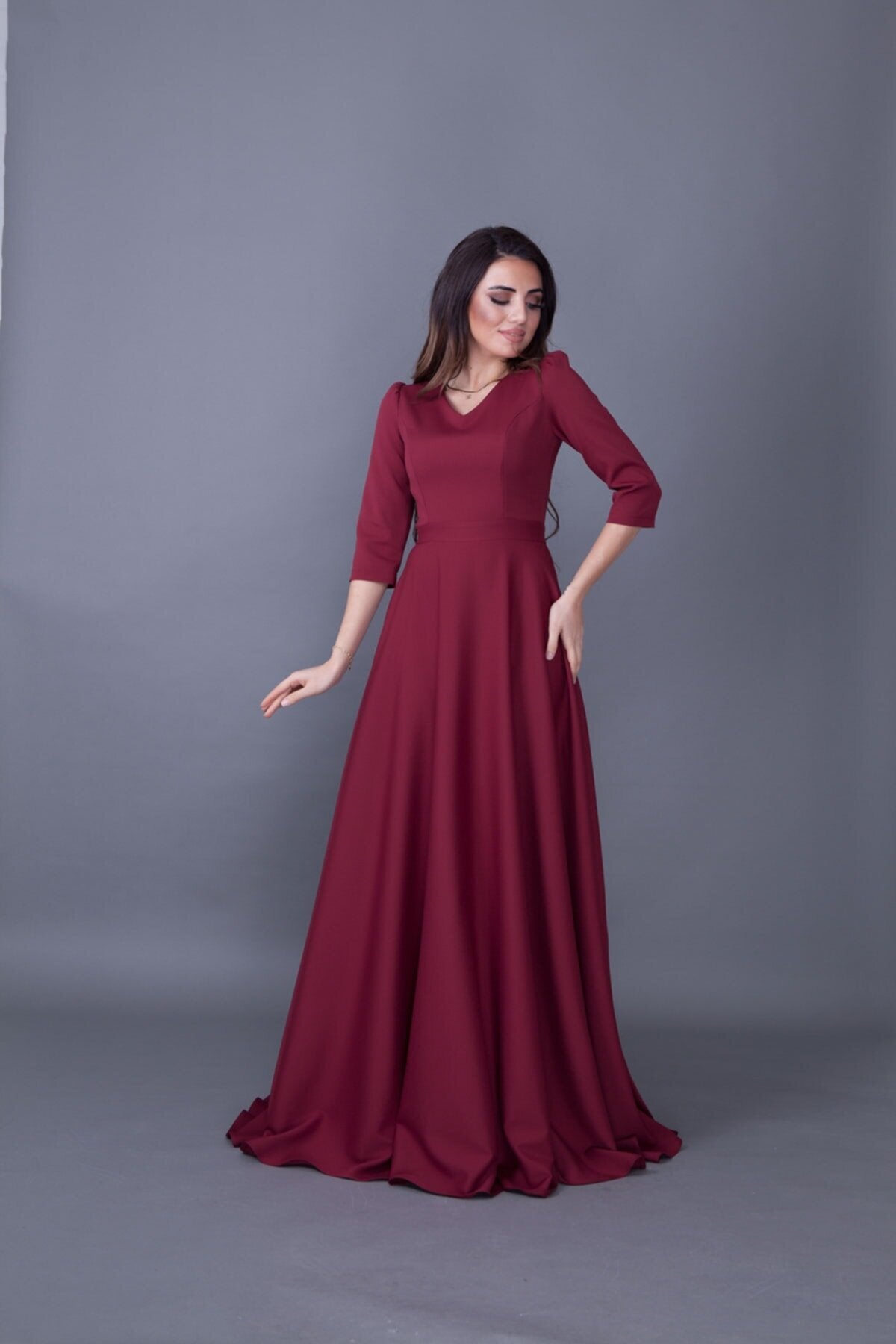 Long V-Neck Evening Dress - Burgundy