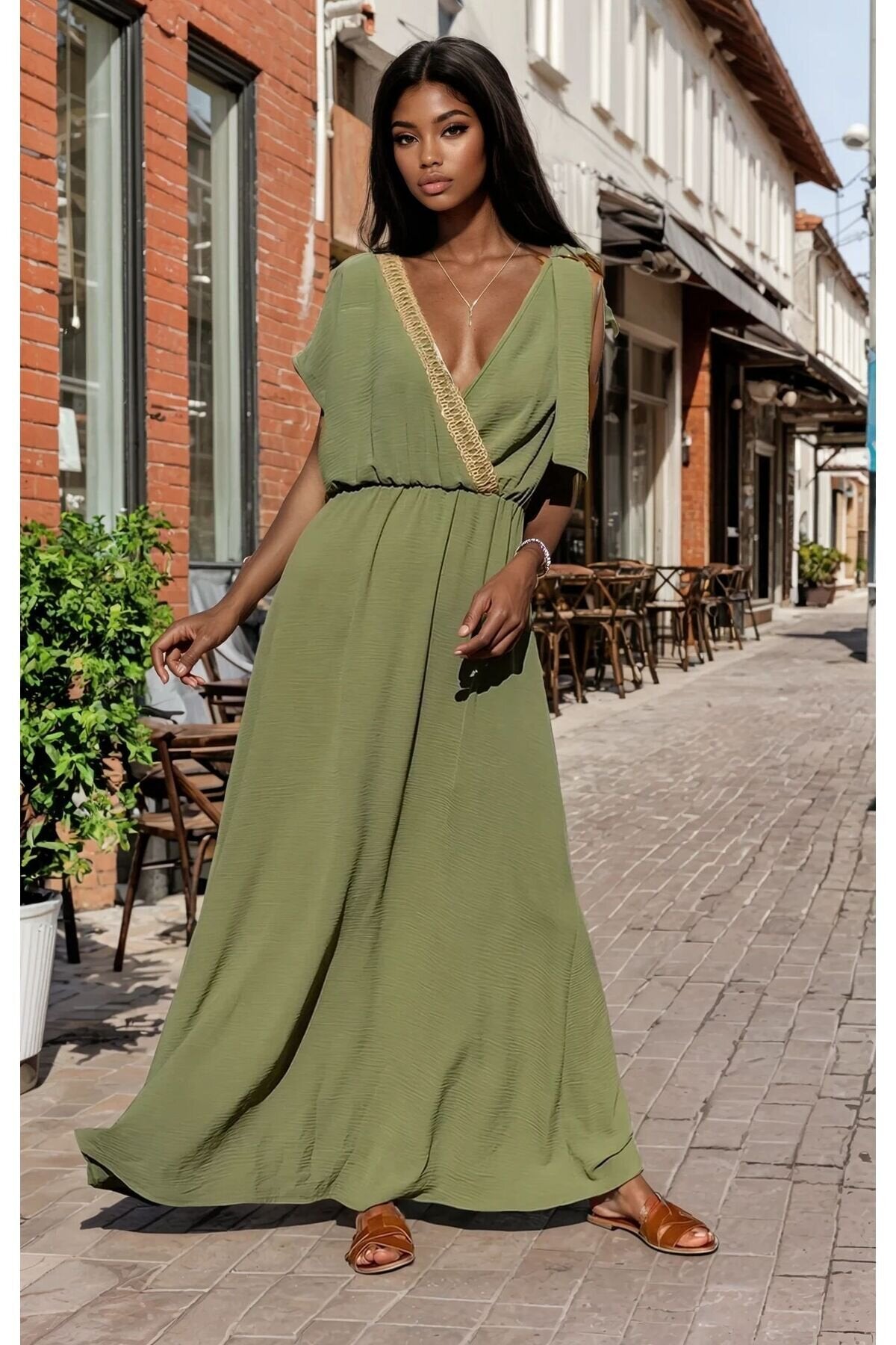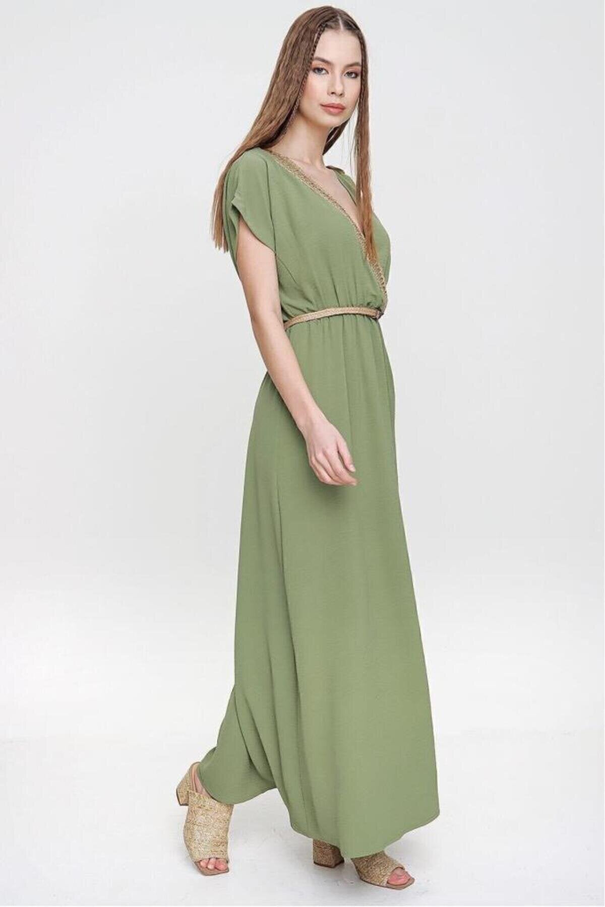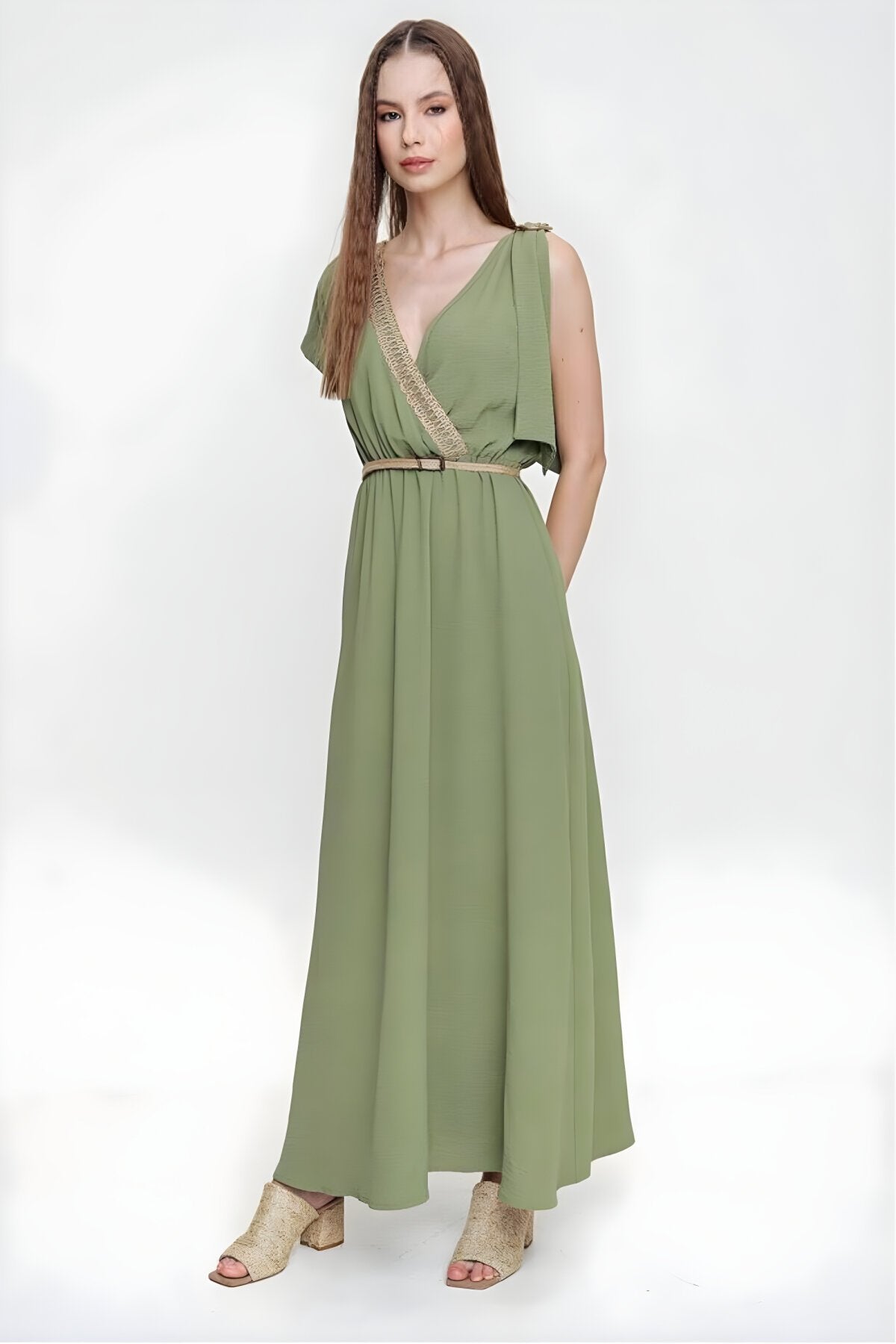Long Wrap Backless Buckle-Shoulder Dress - Khaki