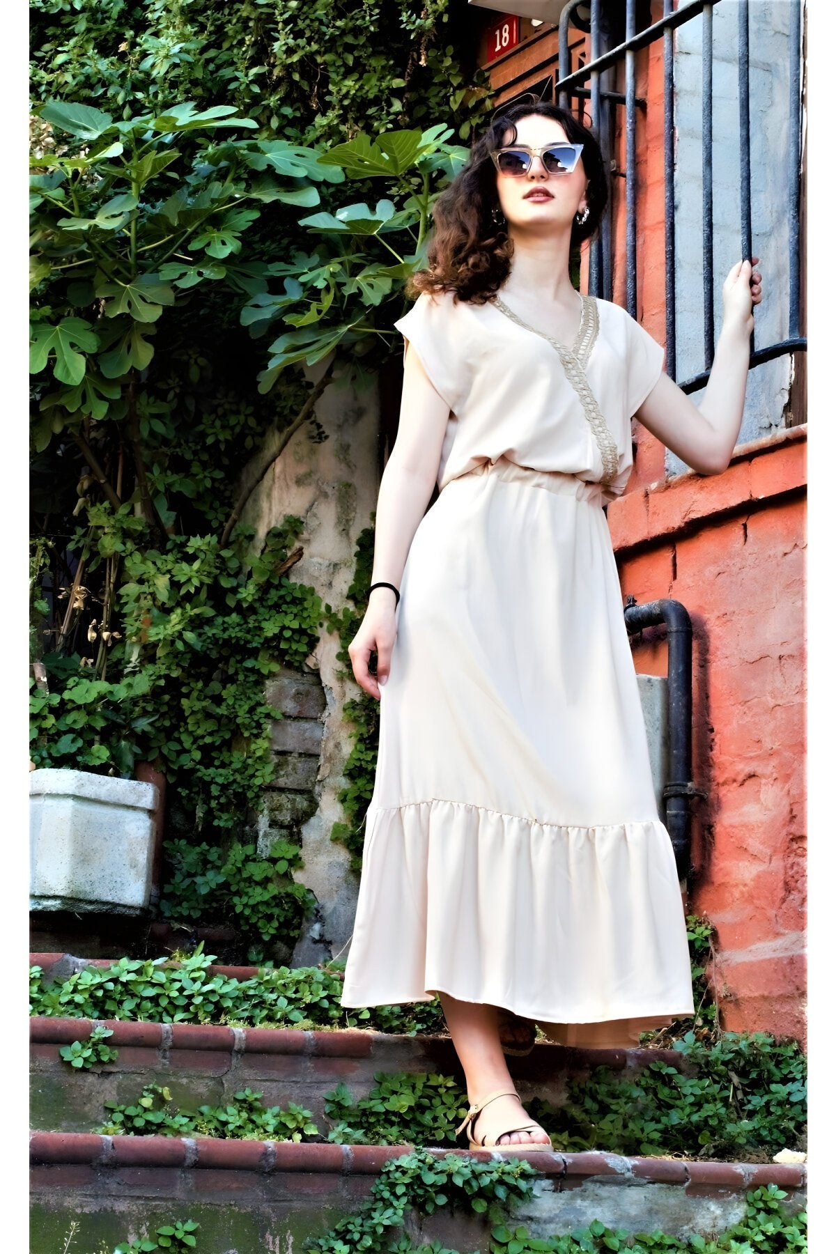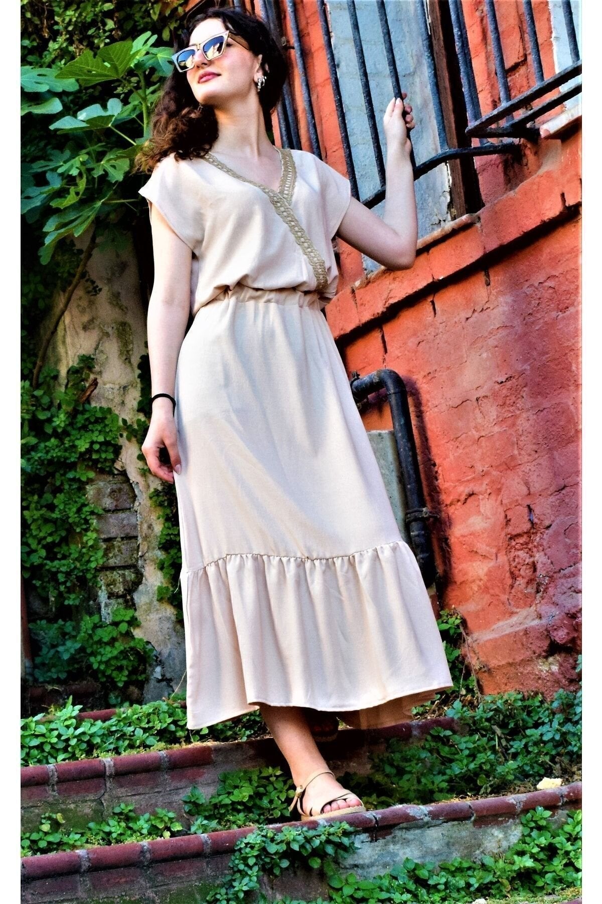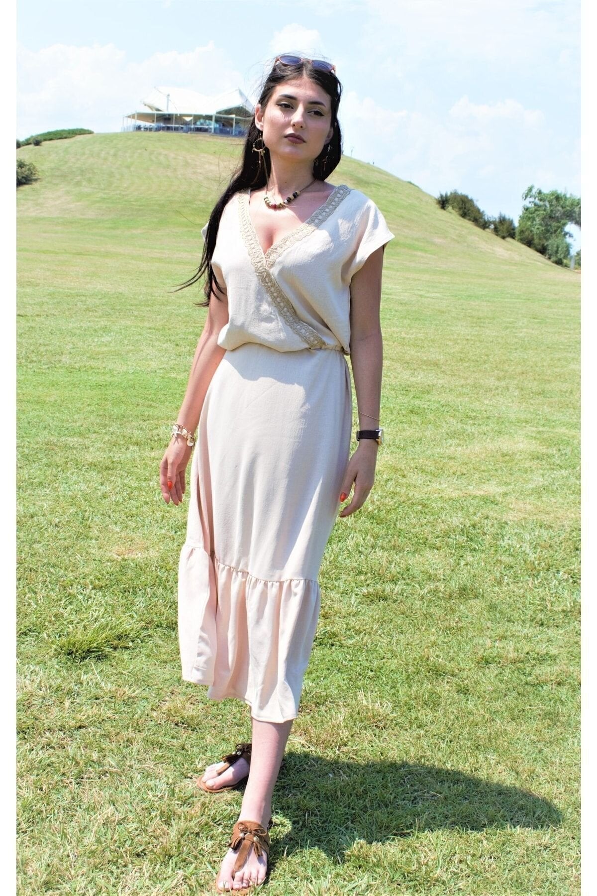 Long Wrap Neck Woven Ruffled Dress - Cream