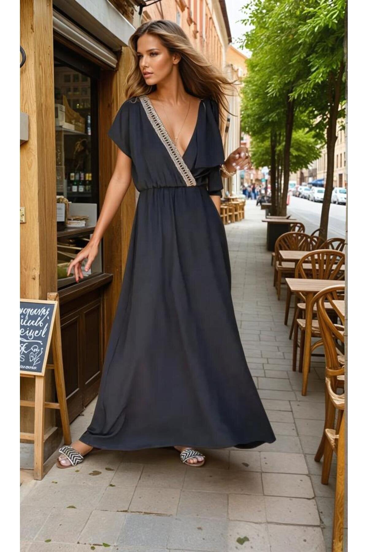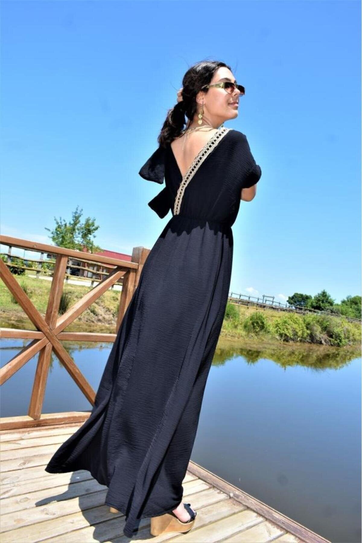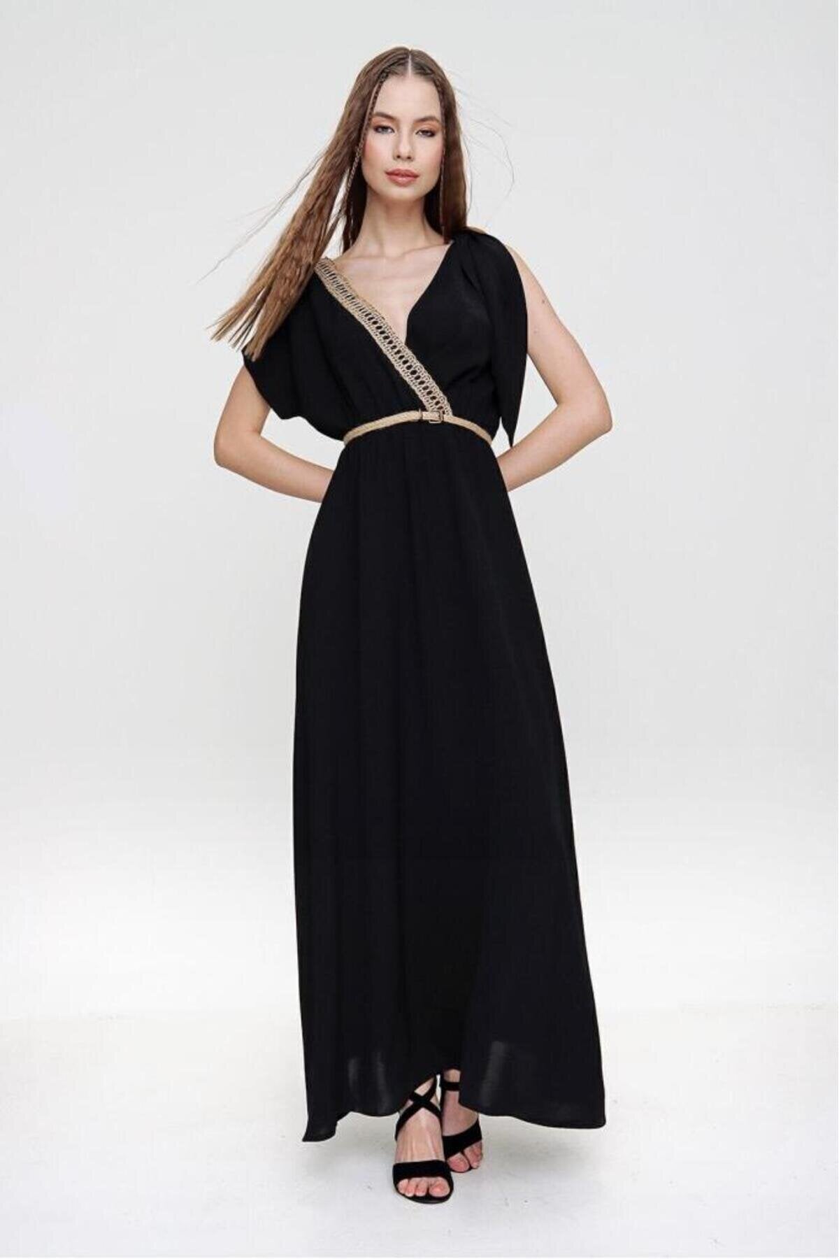 Long Wrap Woven Buckled Shoulder Dress - Black
