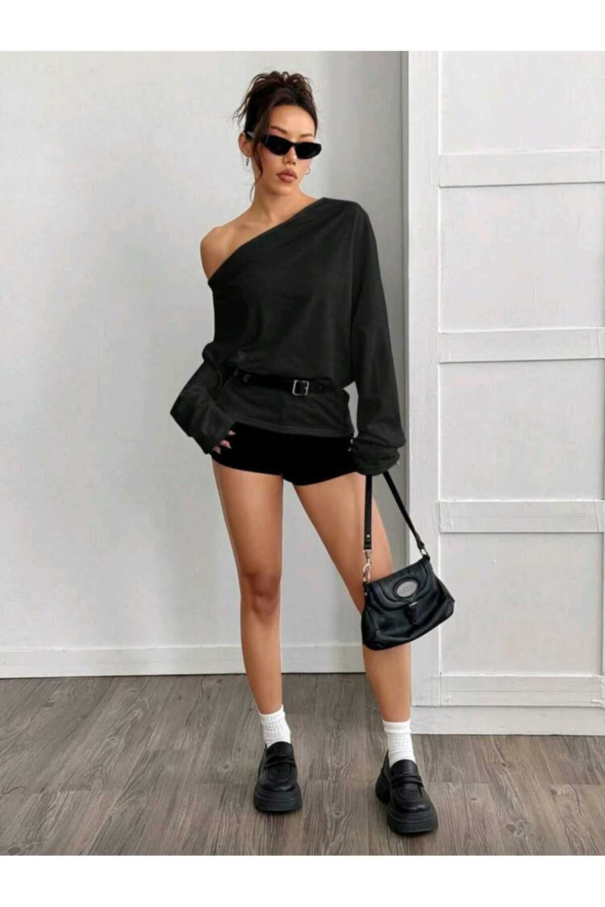 Loose Fit Wide Two-Ply Asymmetrical Boat Neck Sweatshirt - Black