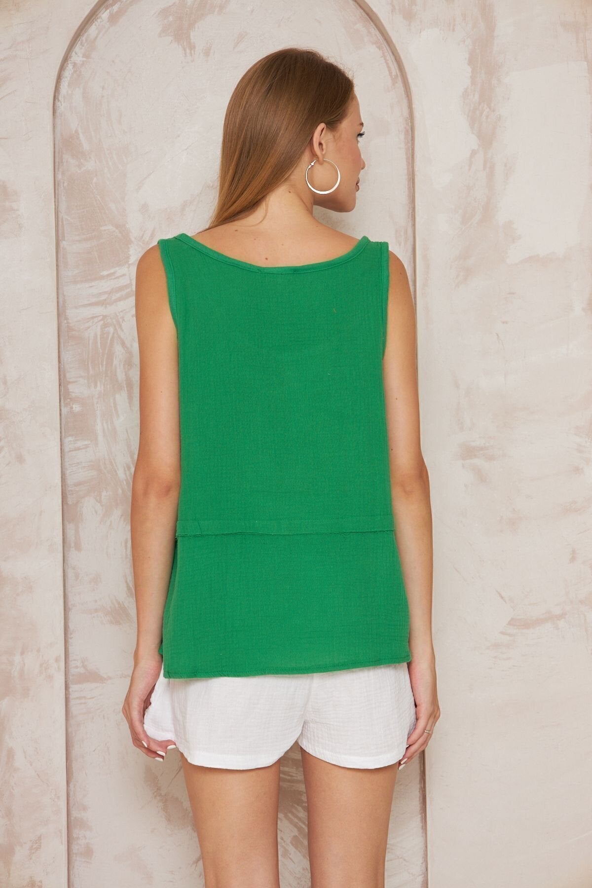 Loose Strappy Tiered Muslin Blouse Raw Seam Detail - Benetton Green