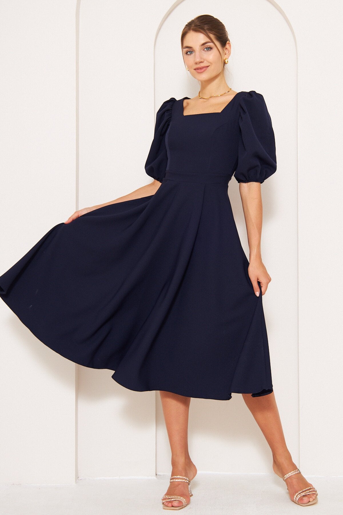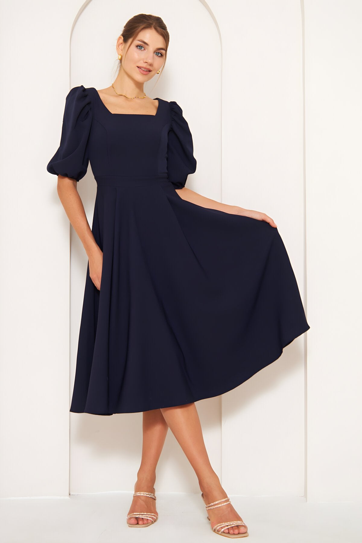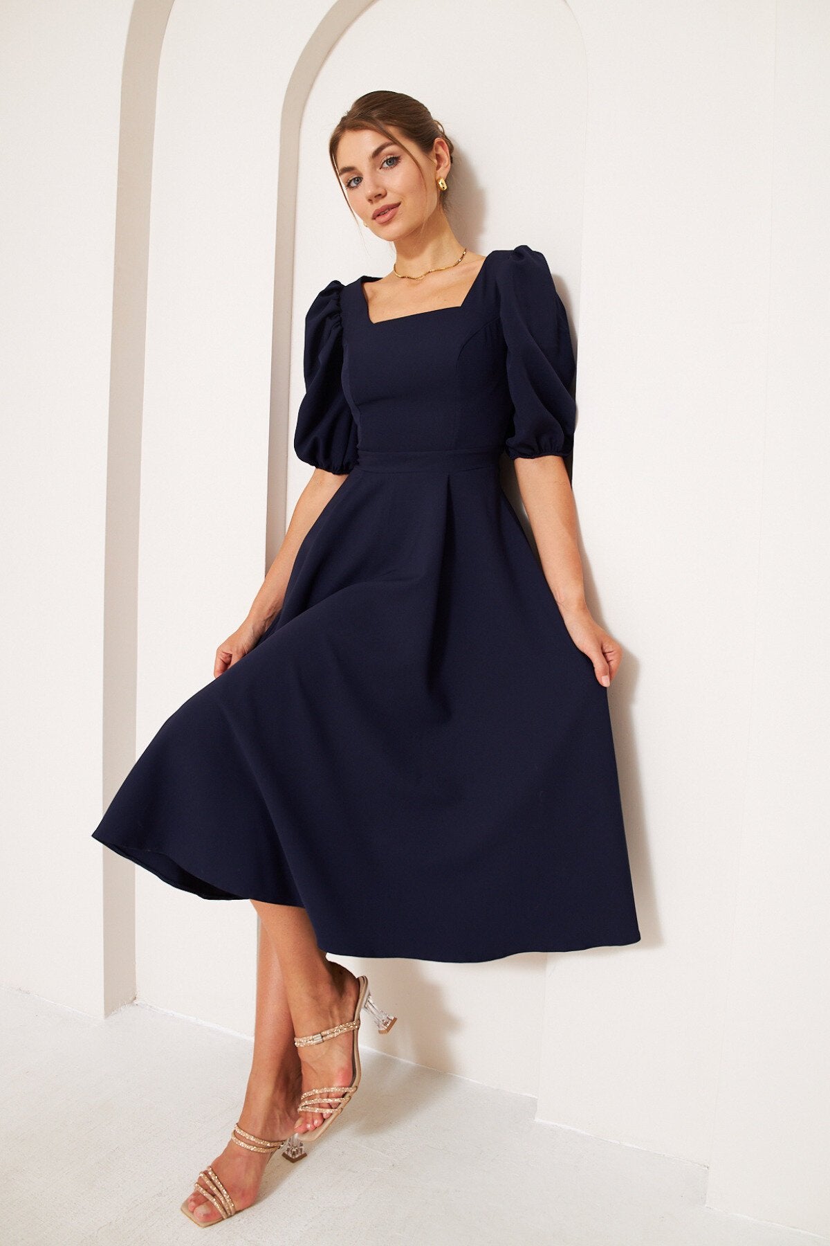 Midi Balloon Sleeve Elasticated Square Neck Dress - Navy Blue