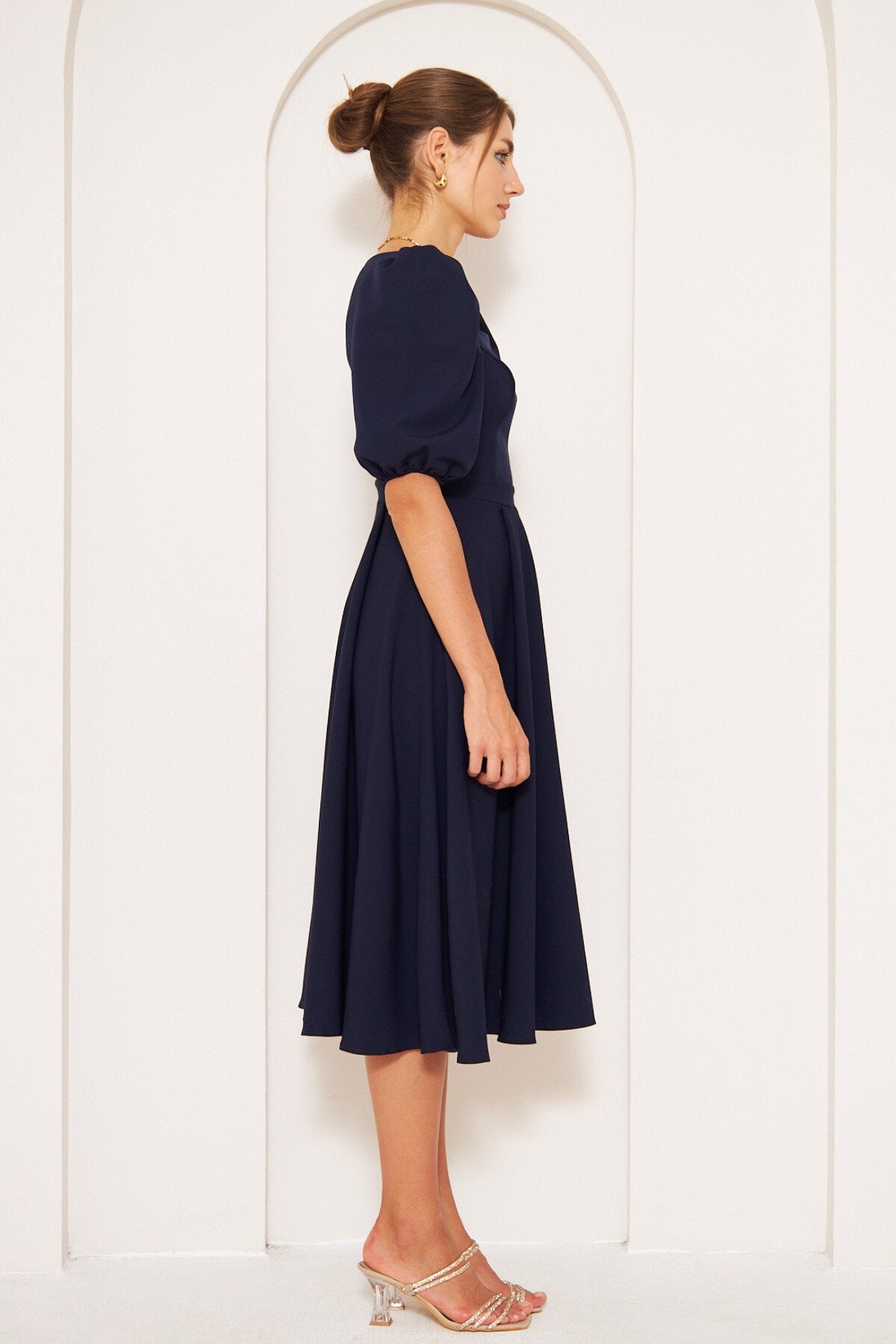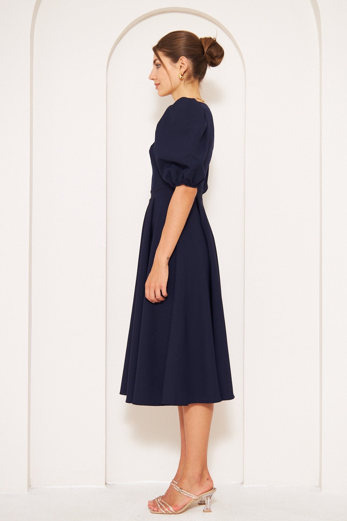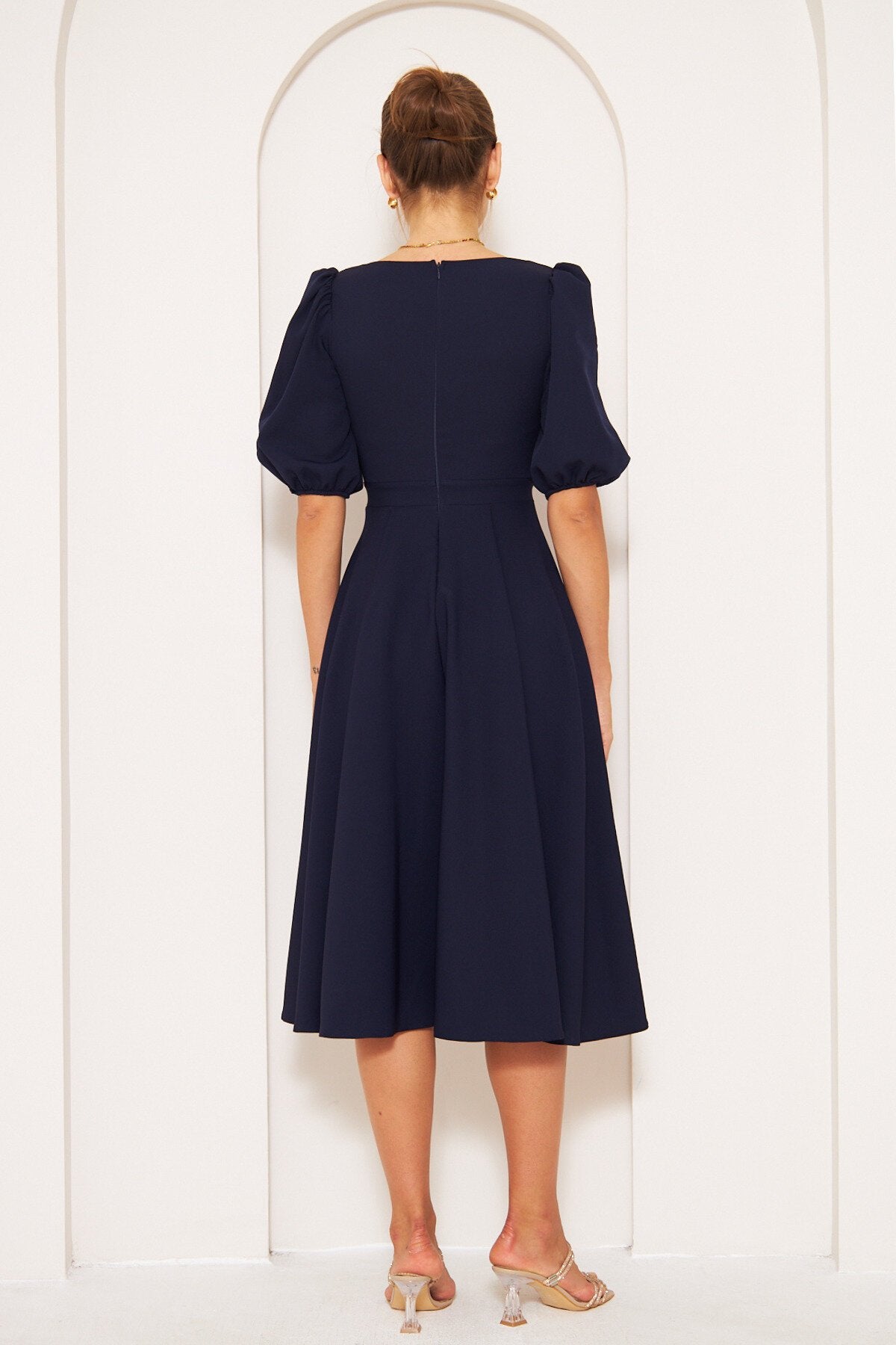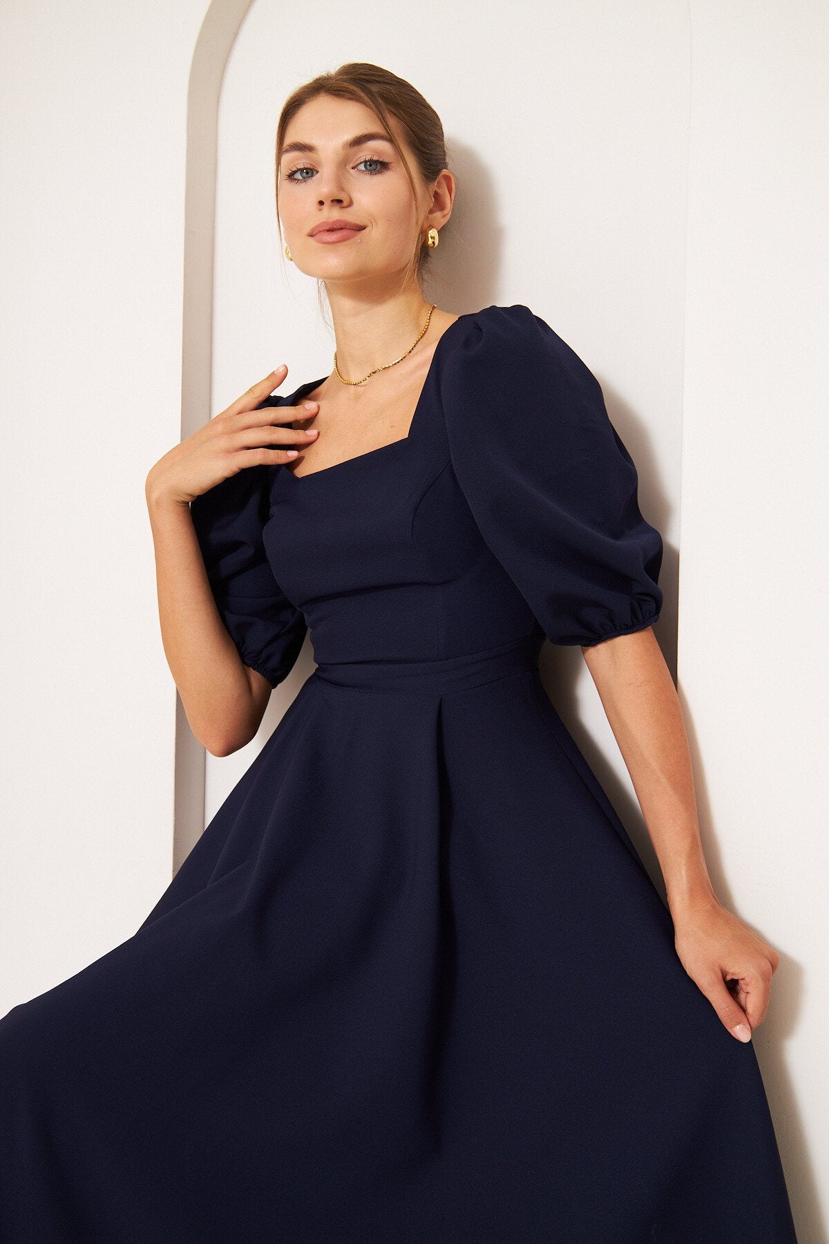 Midi Balloon Sleeve Elasticated Square Neck Dress - Navy Blue