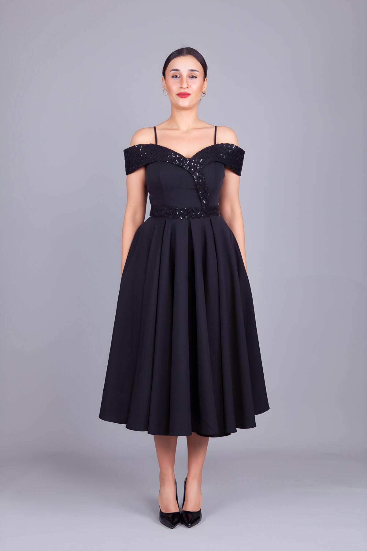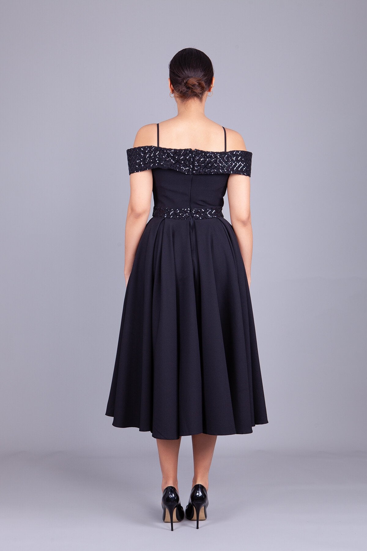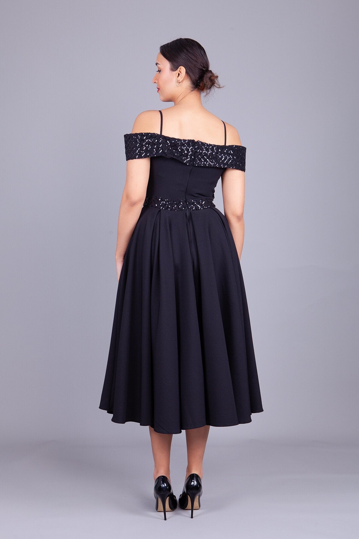 Midi Flared Checkered Sequin Detailed Evening Dress - Black
