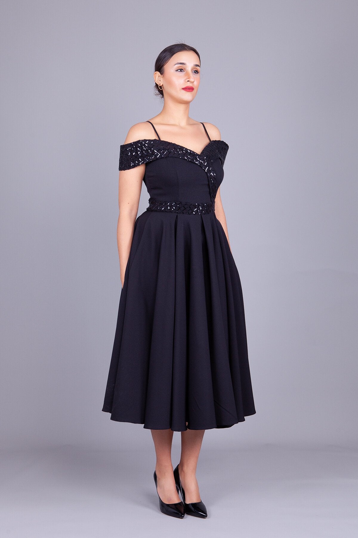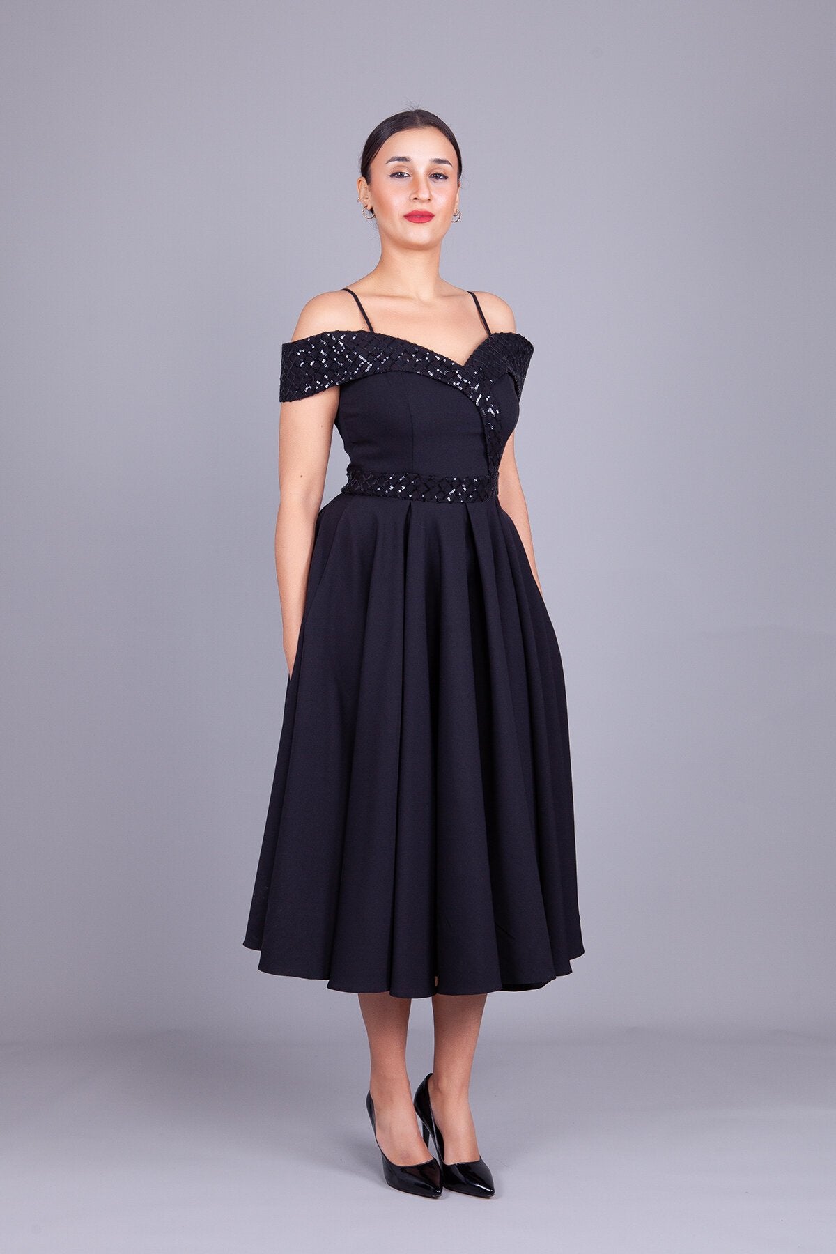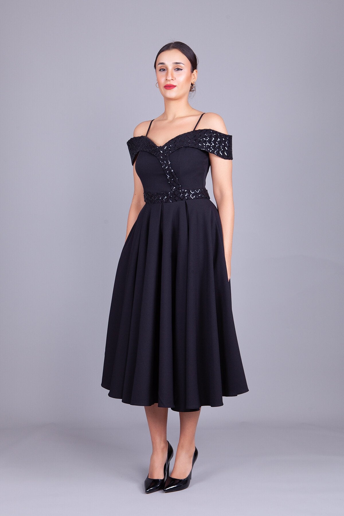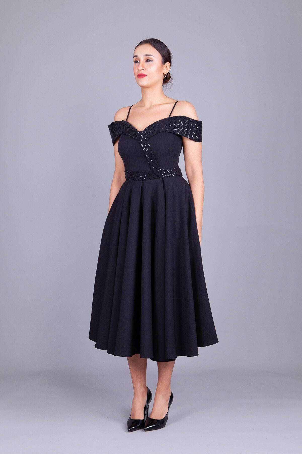Midi Flared Checkered Sequin Detailed Evening Dress - Black