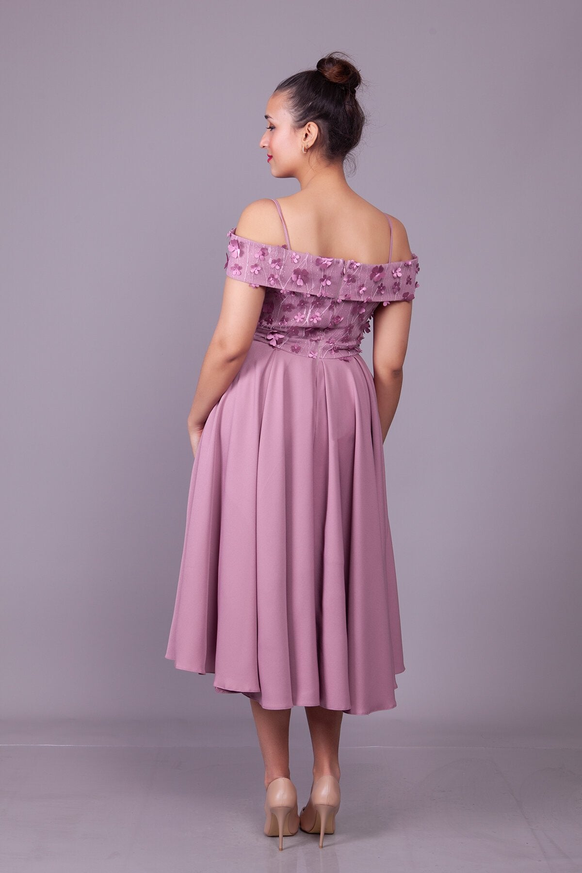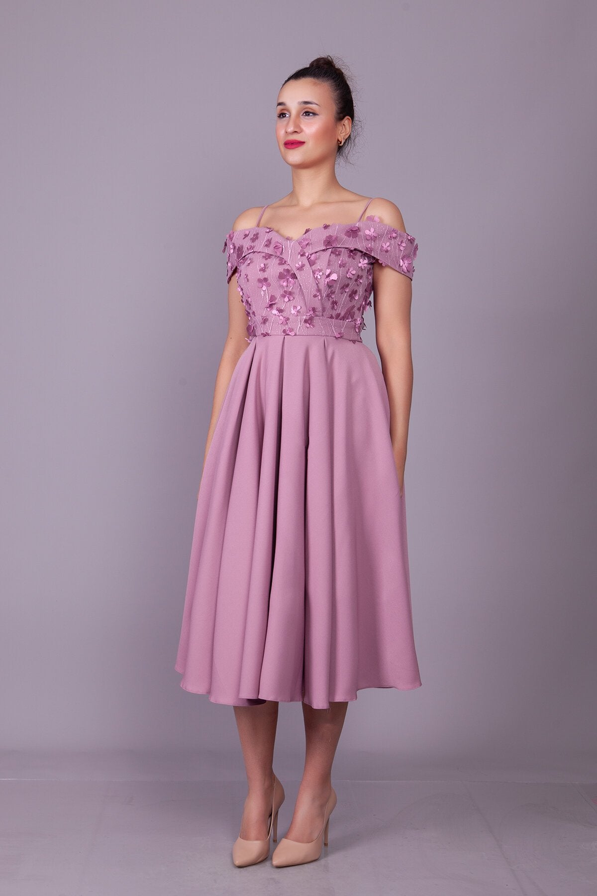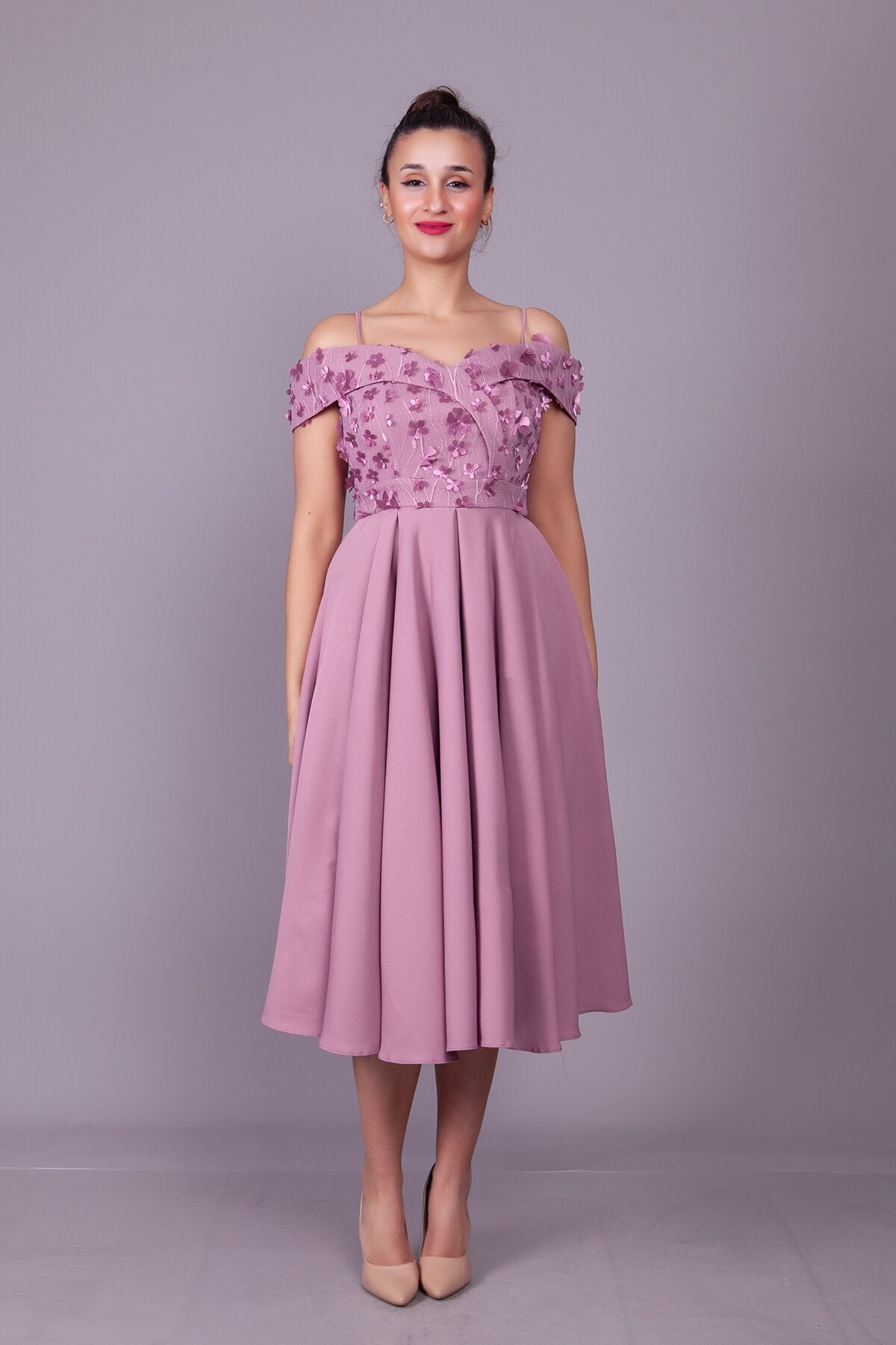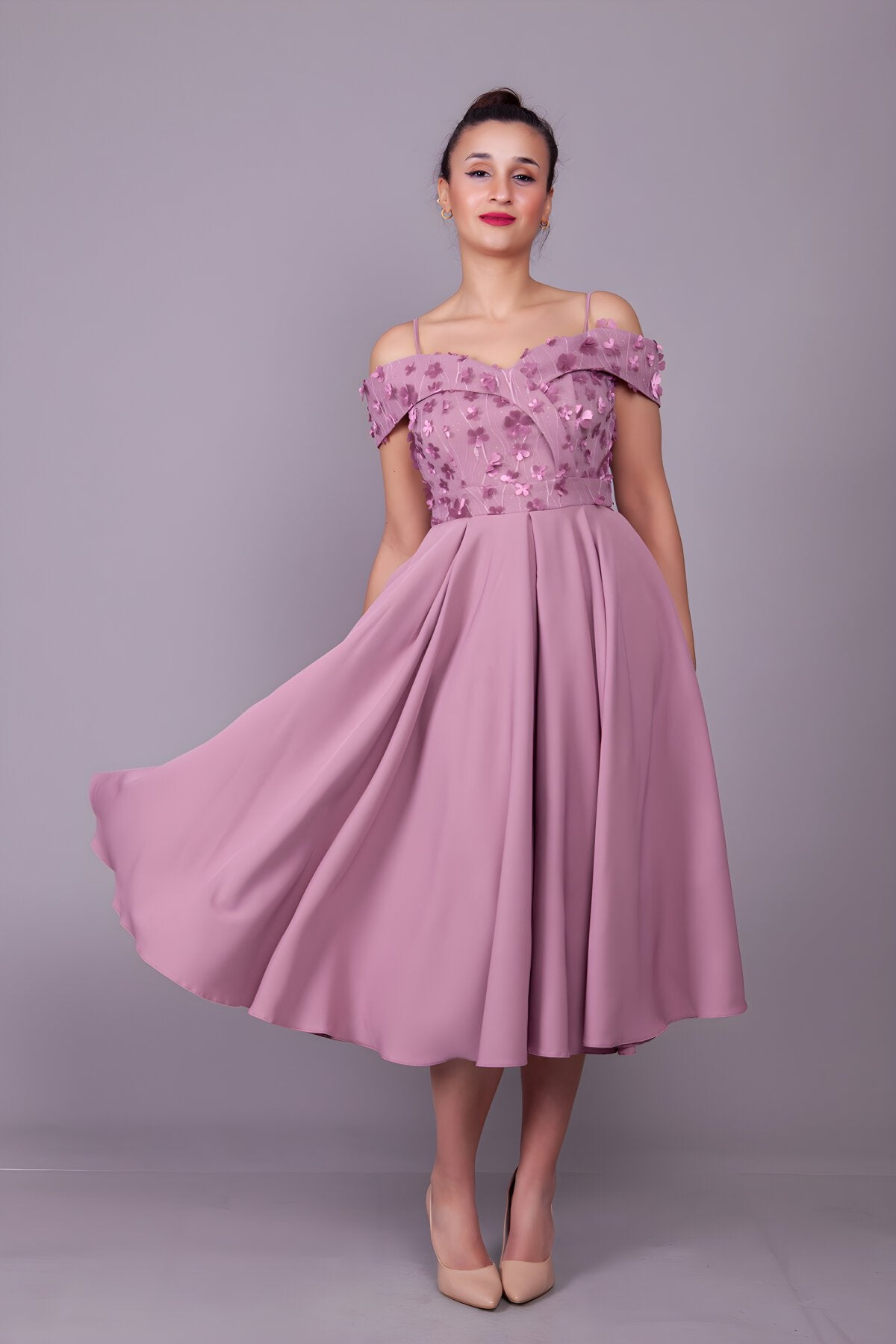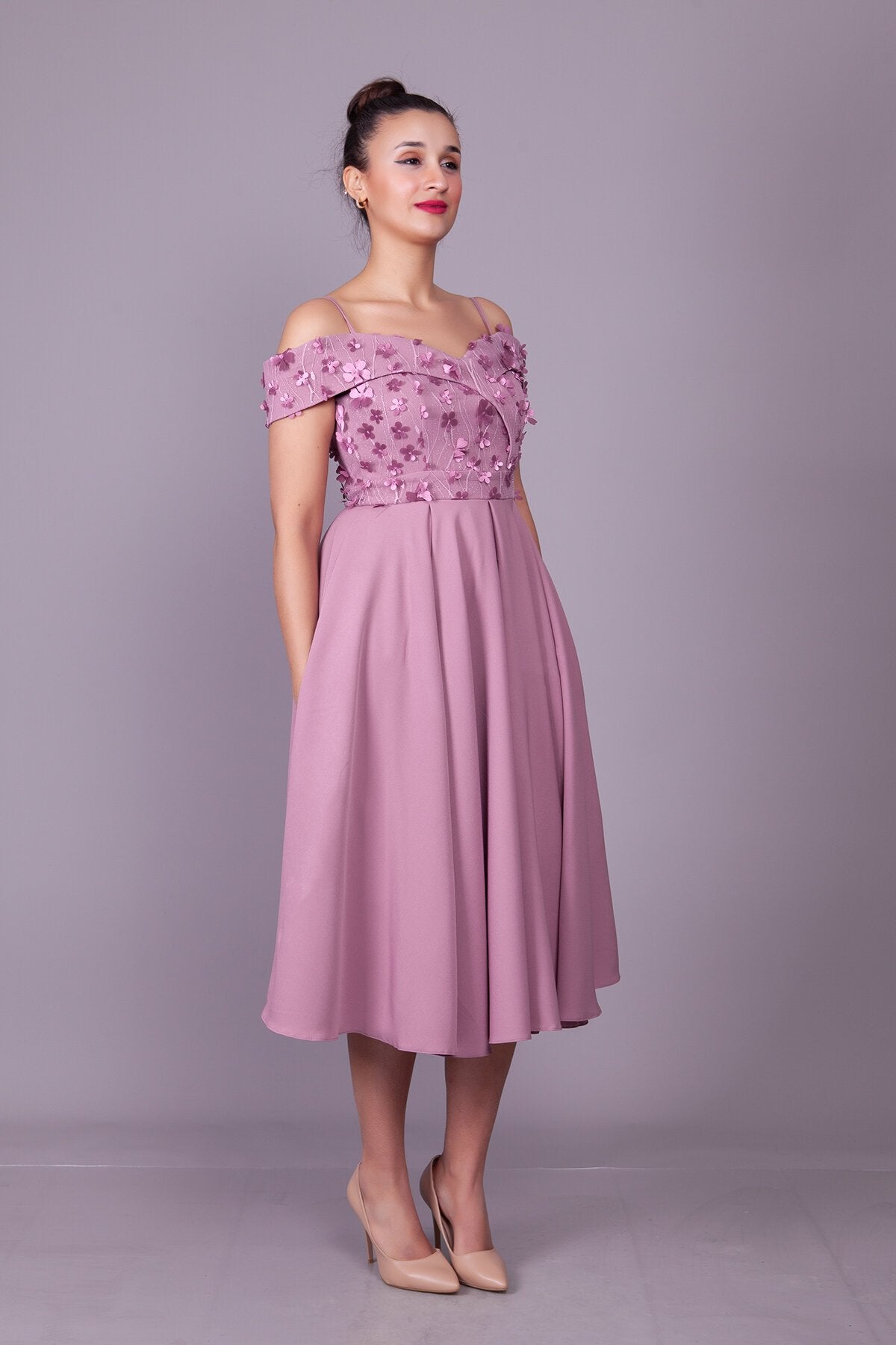 Midi Flared Floral Strappy Off-Shoulder Tulle Detail Evening Dress - Dark Rose