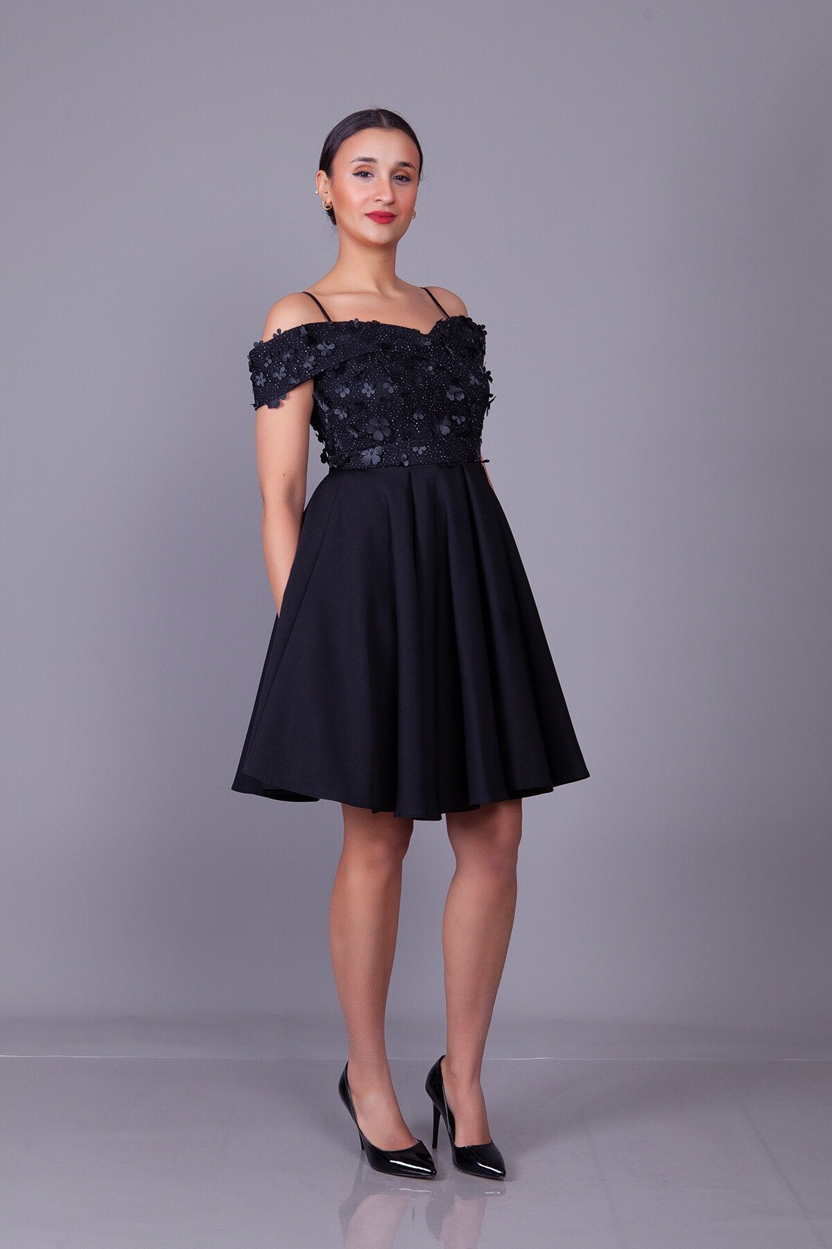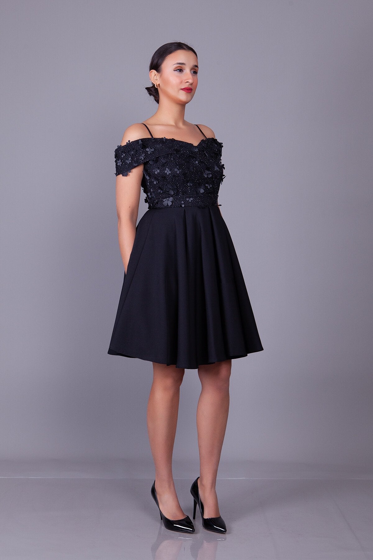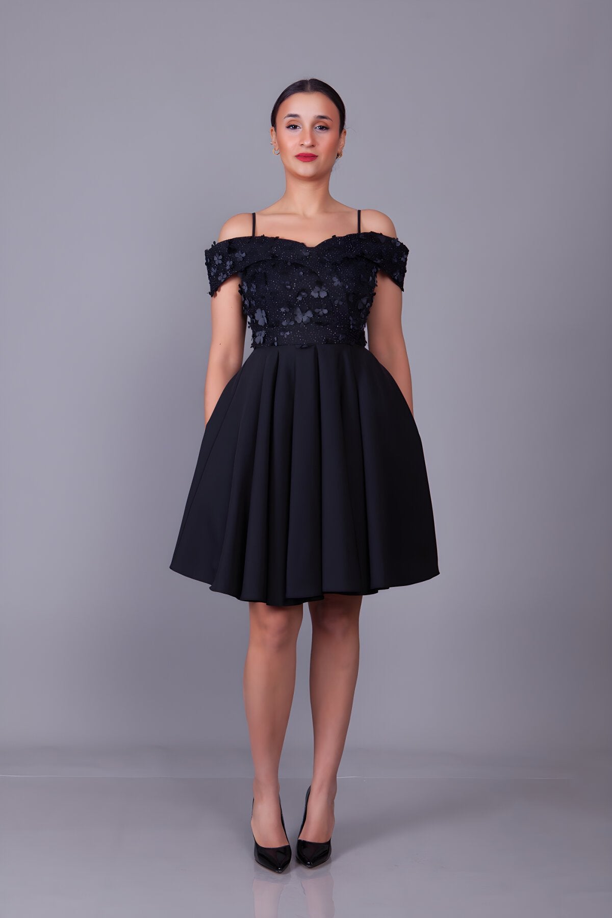 Midi Flared Floral Tulle Detail Evening Dress - Black