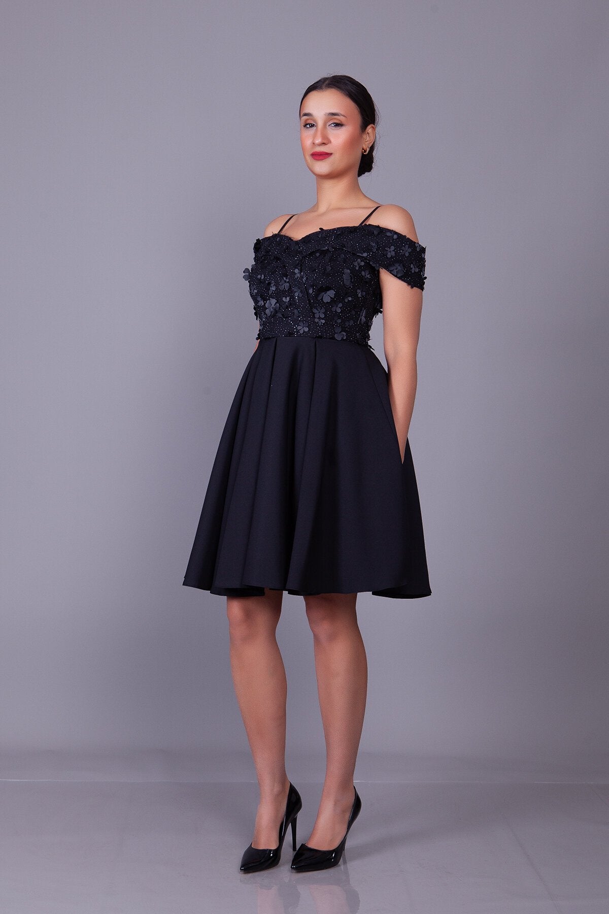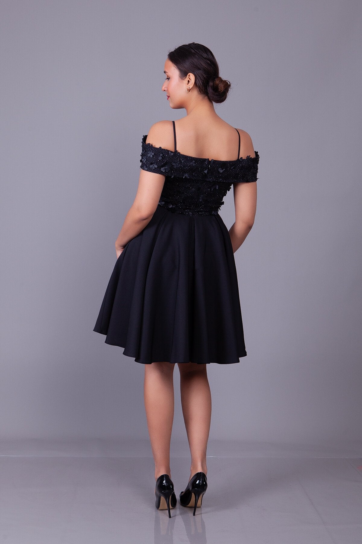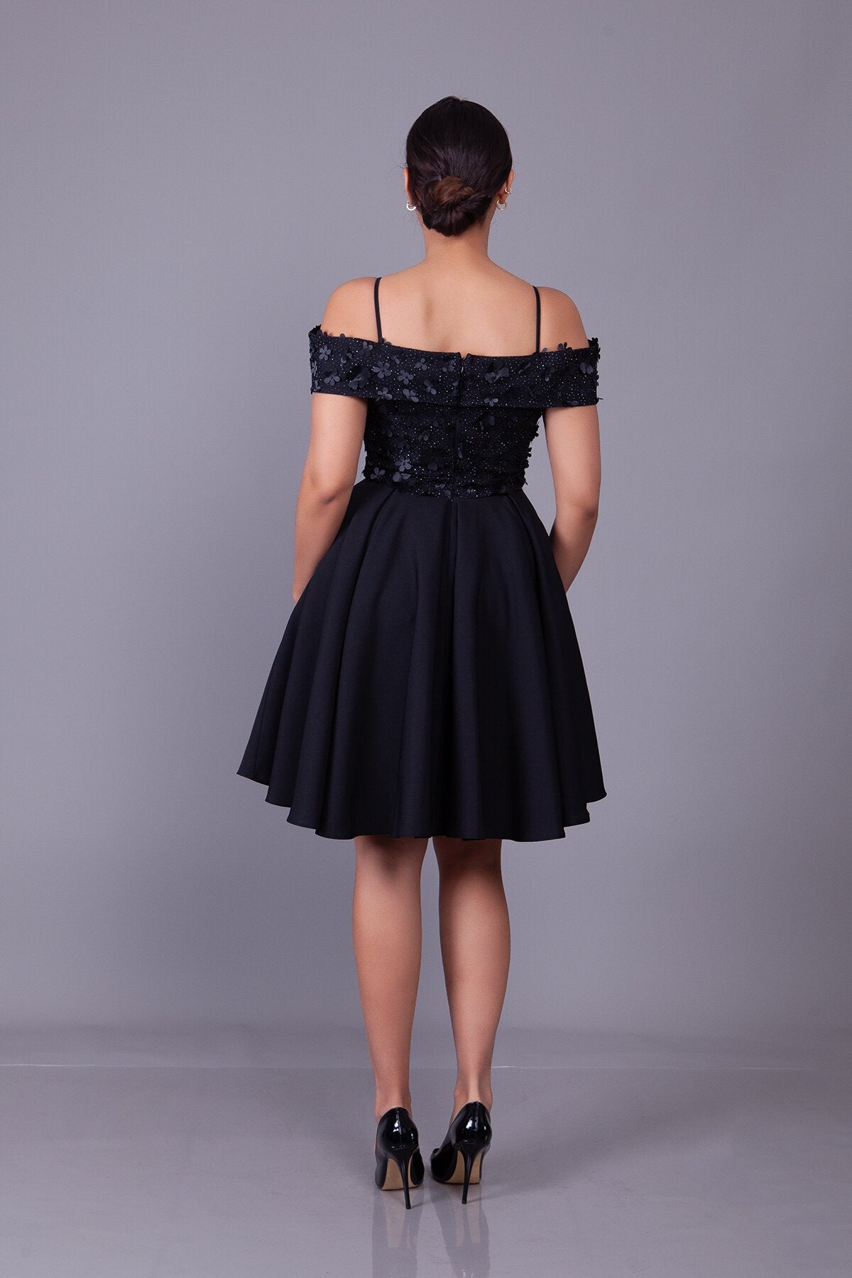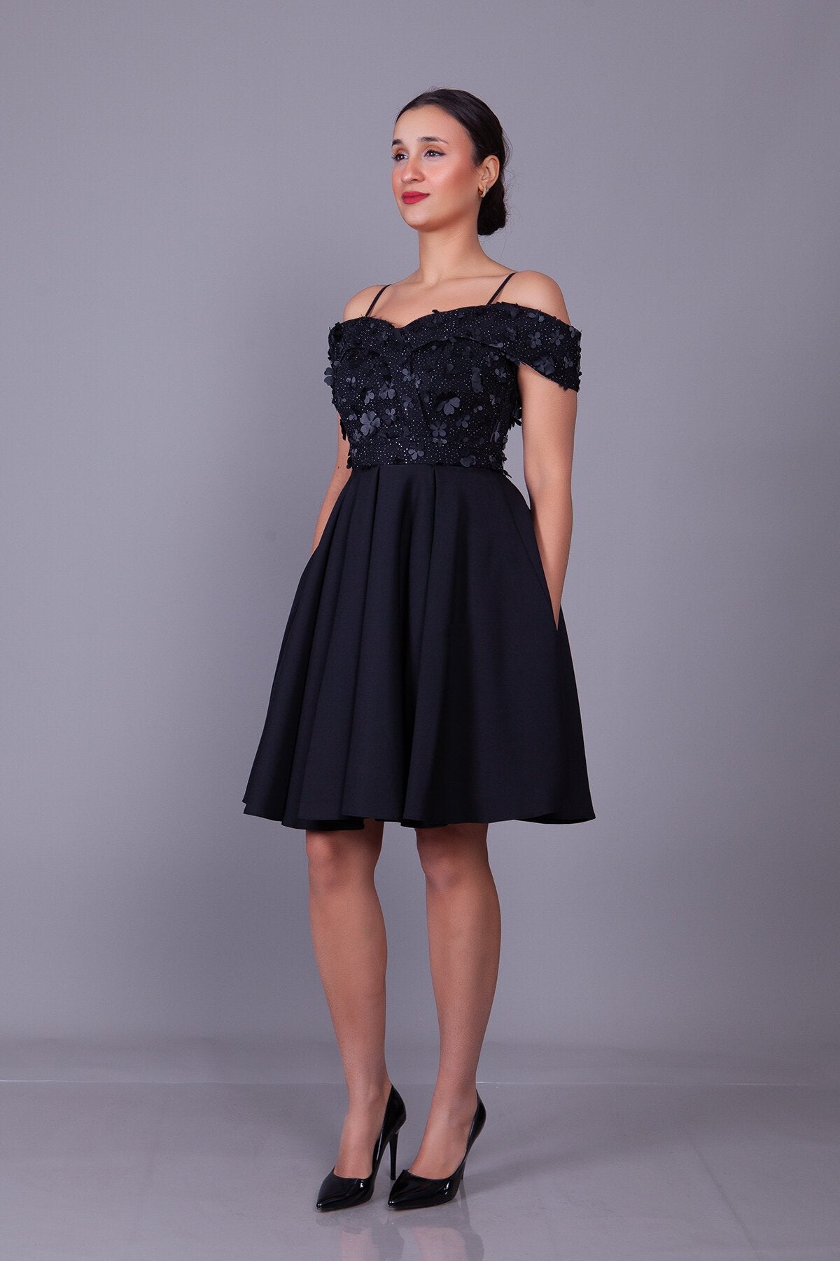 Midi Flared Floral Tulle Detail Evening Dress - Black