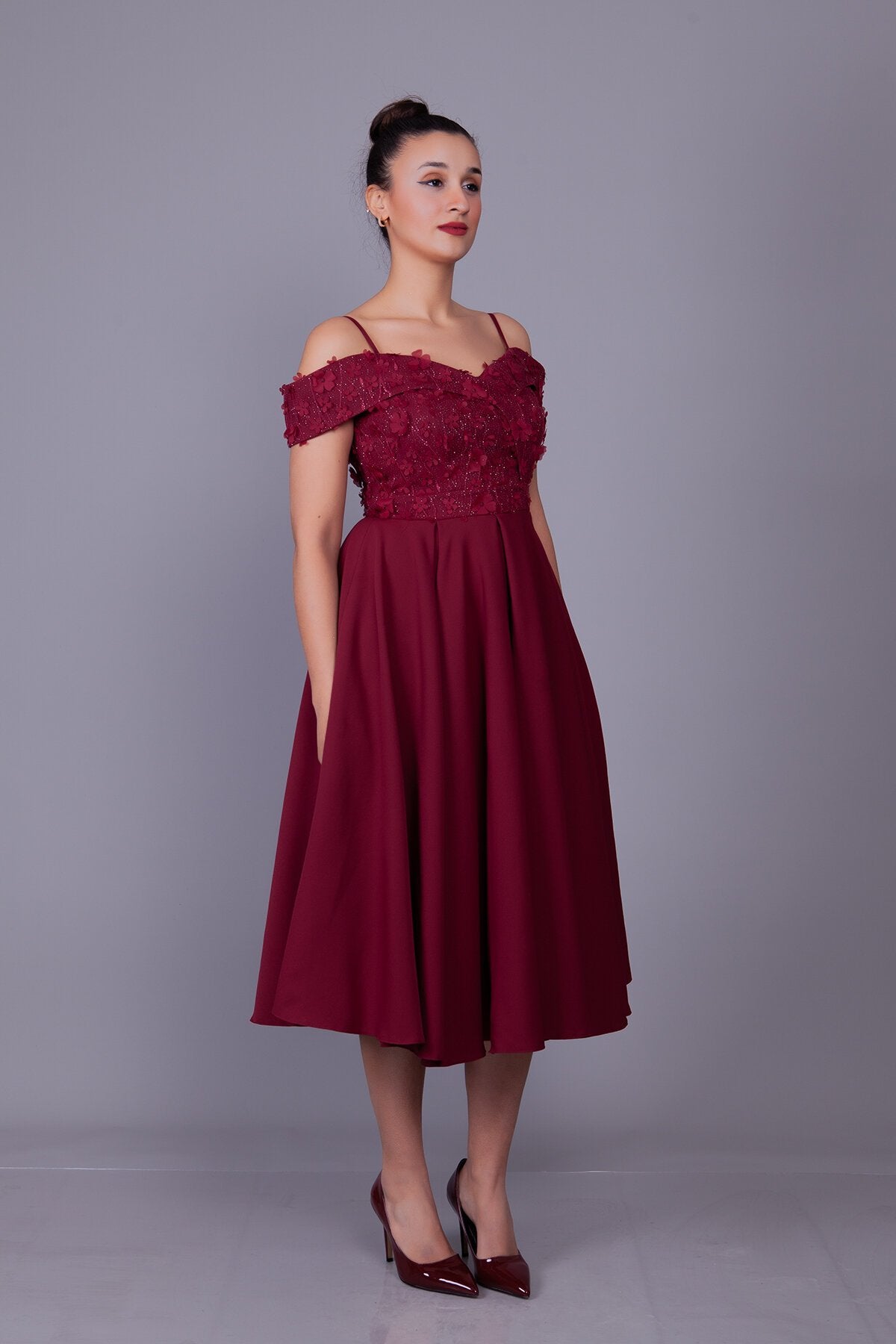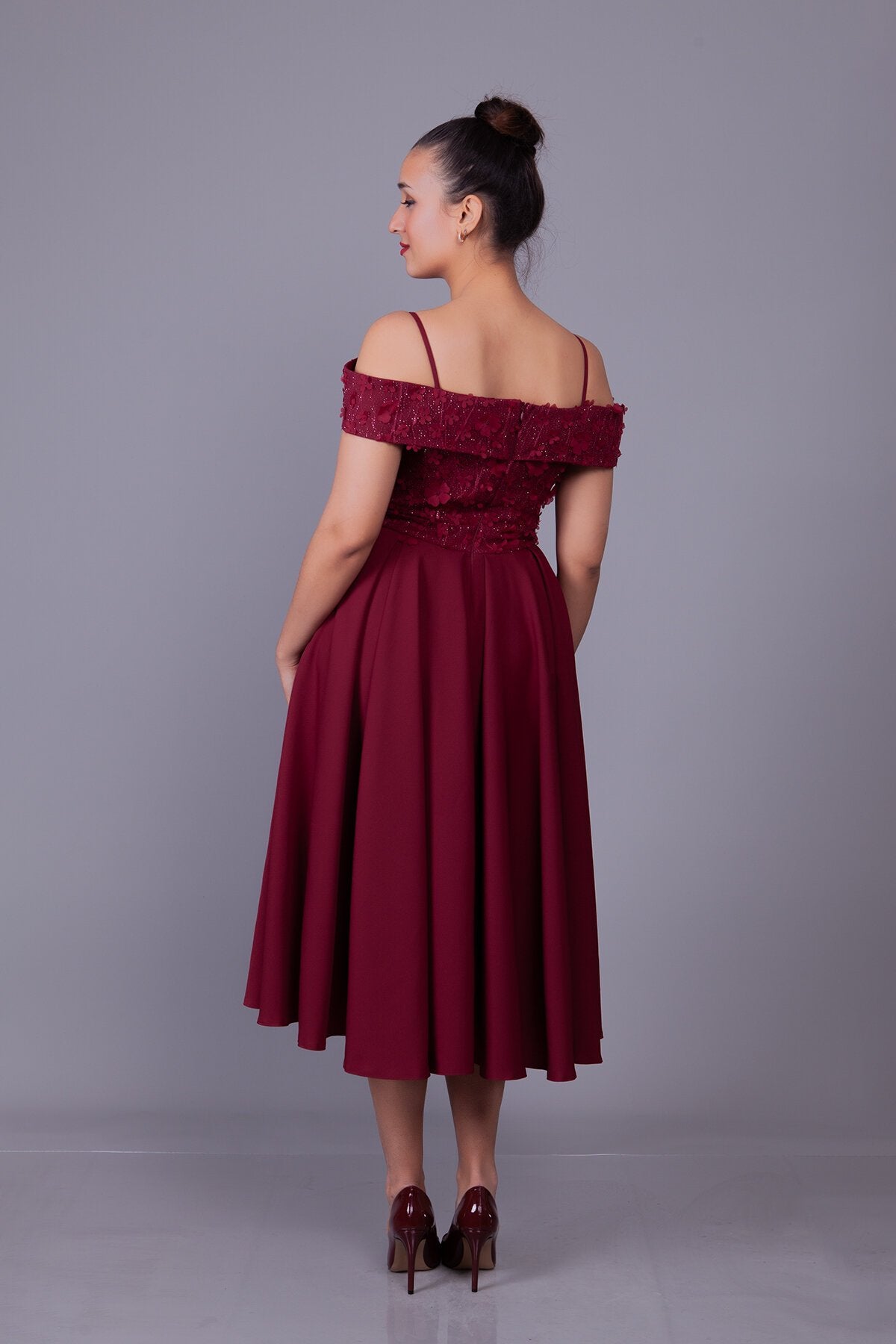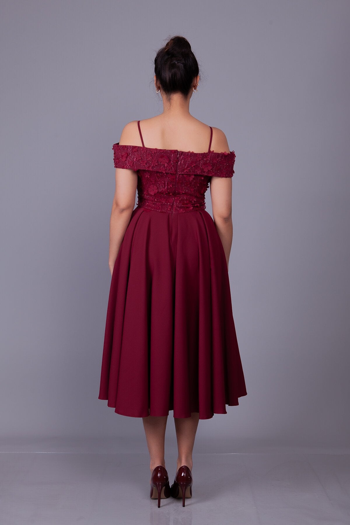 Midi Flared Floral Tulle Evening Dress - Burgundy