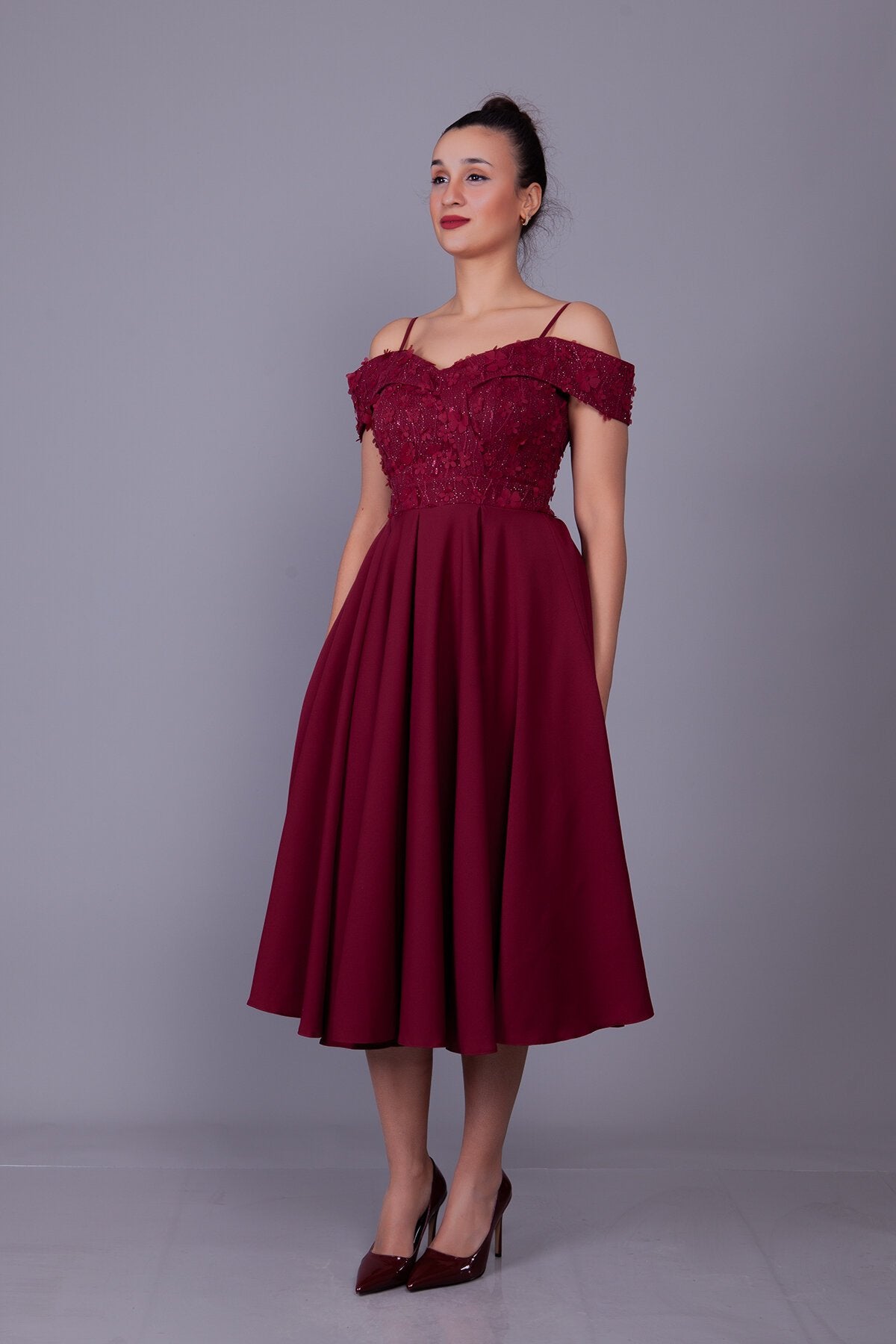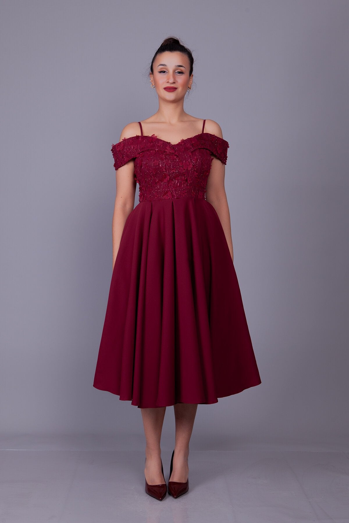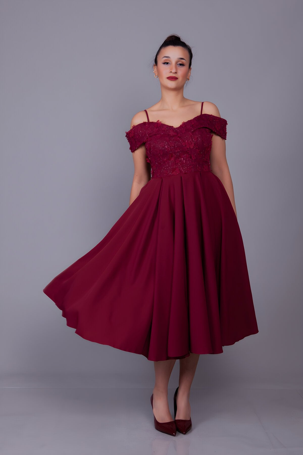 Midi Flared Floral Tulle Evening Dress - Burgundy