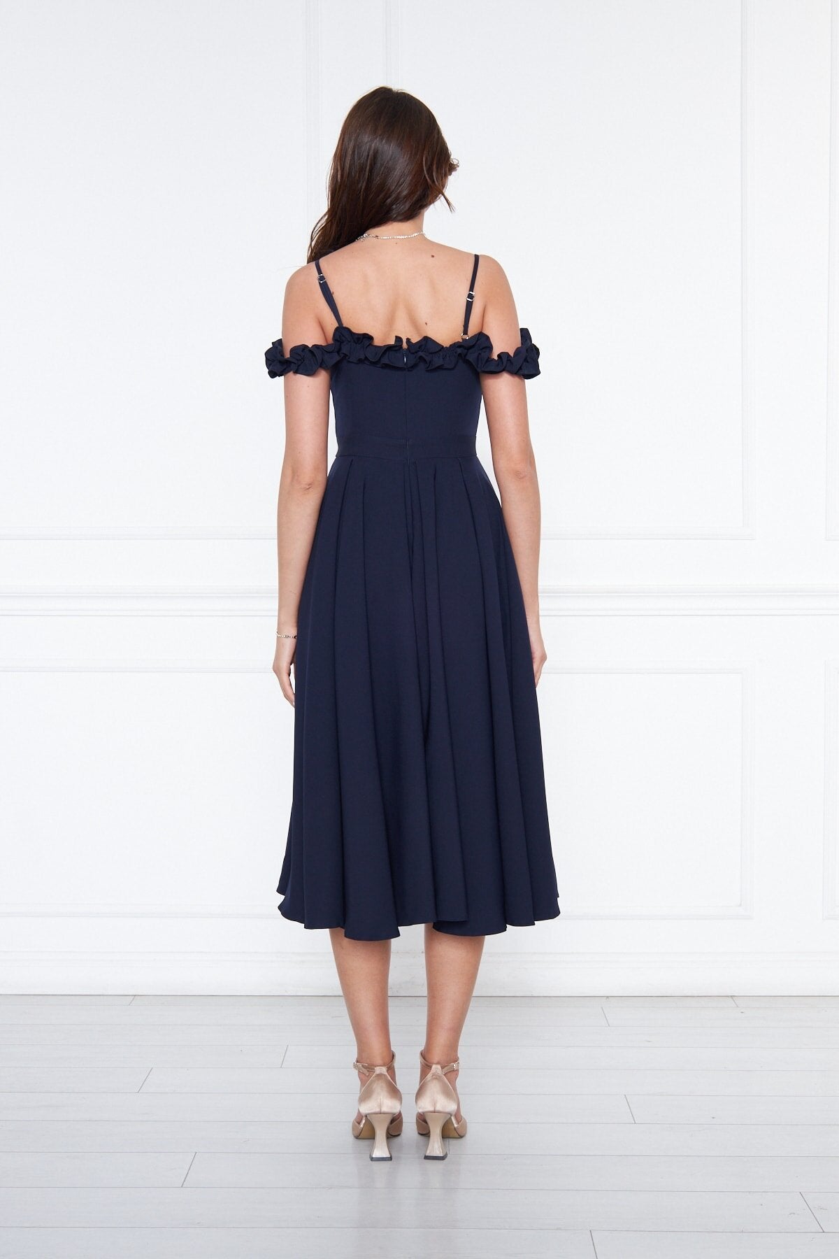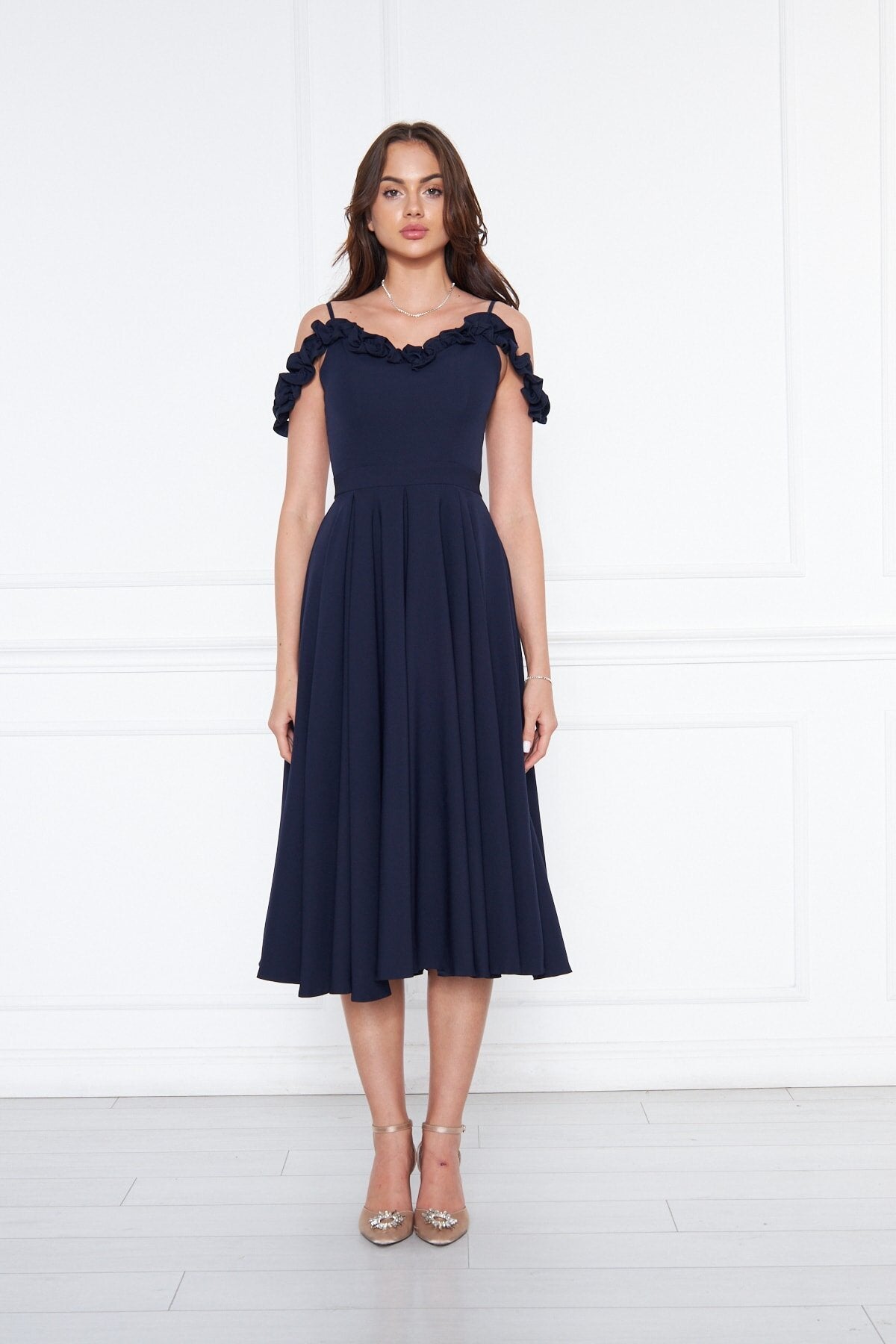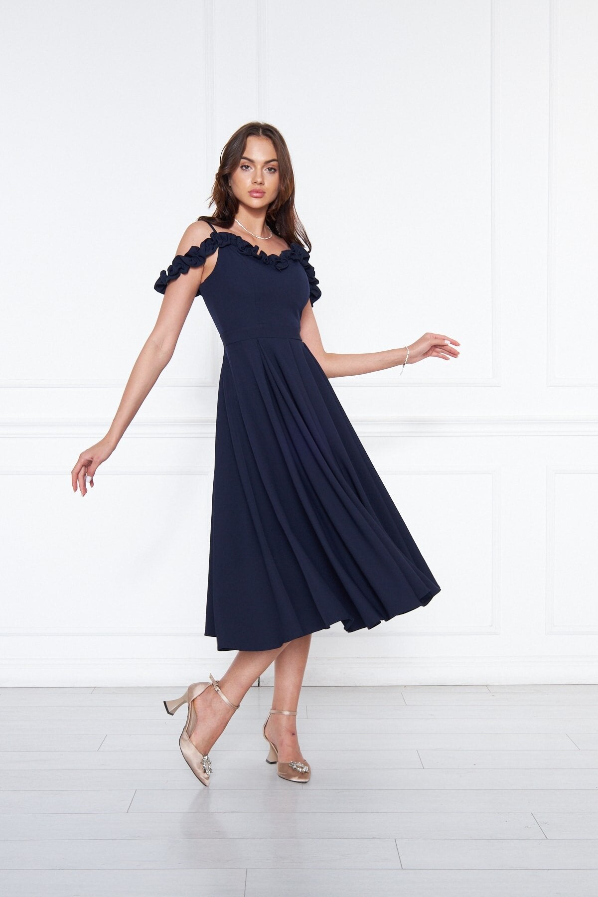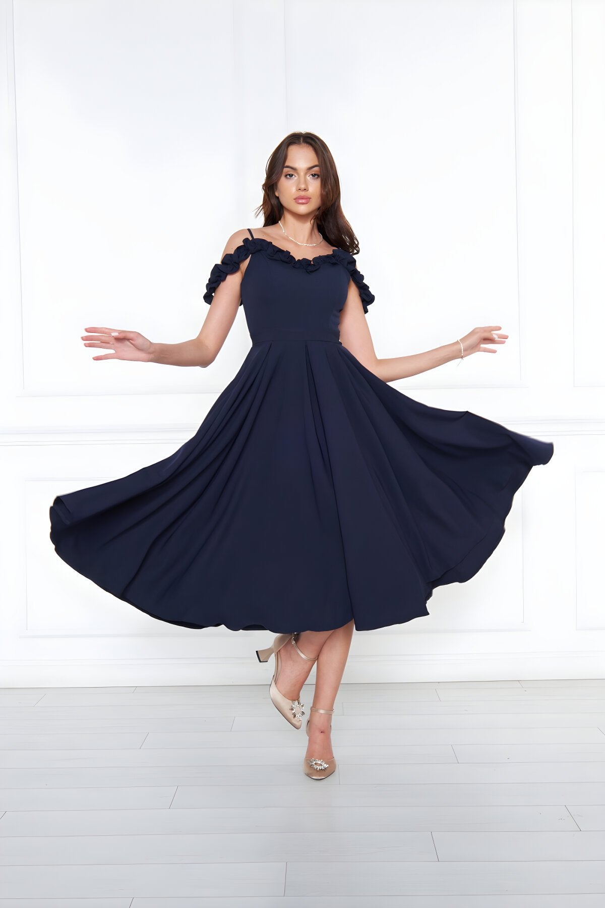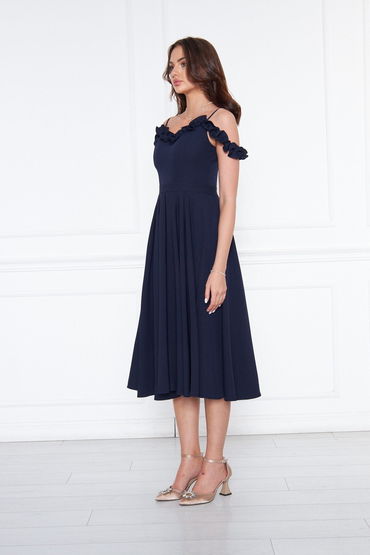 This stunning midi evening dress captures a blend of classic sophistication and modern romance. Its rich navy blue hue and graceful flared silhouette create a look that is both timeless and effortlessly chic, designed to move beautifully with every step you take.