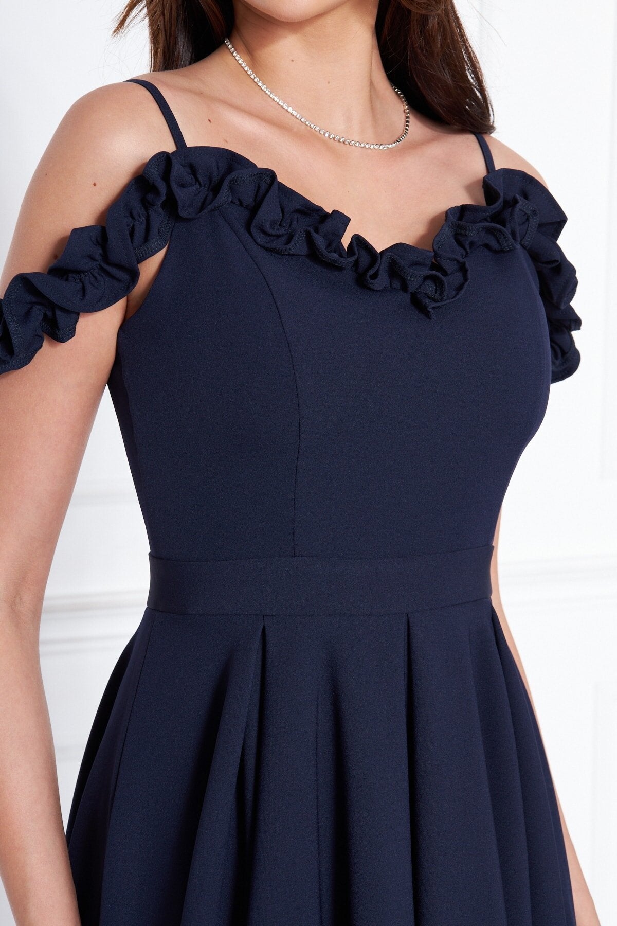 Midi Flared Pleated Strapped Evening Dress - Navy Blue