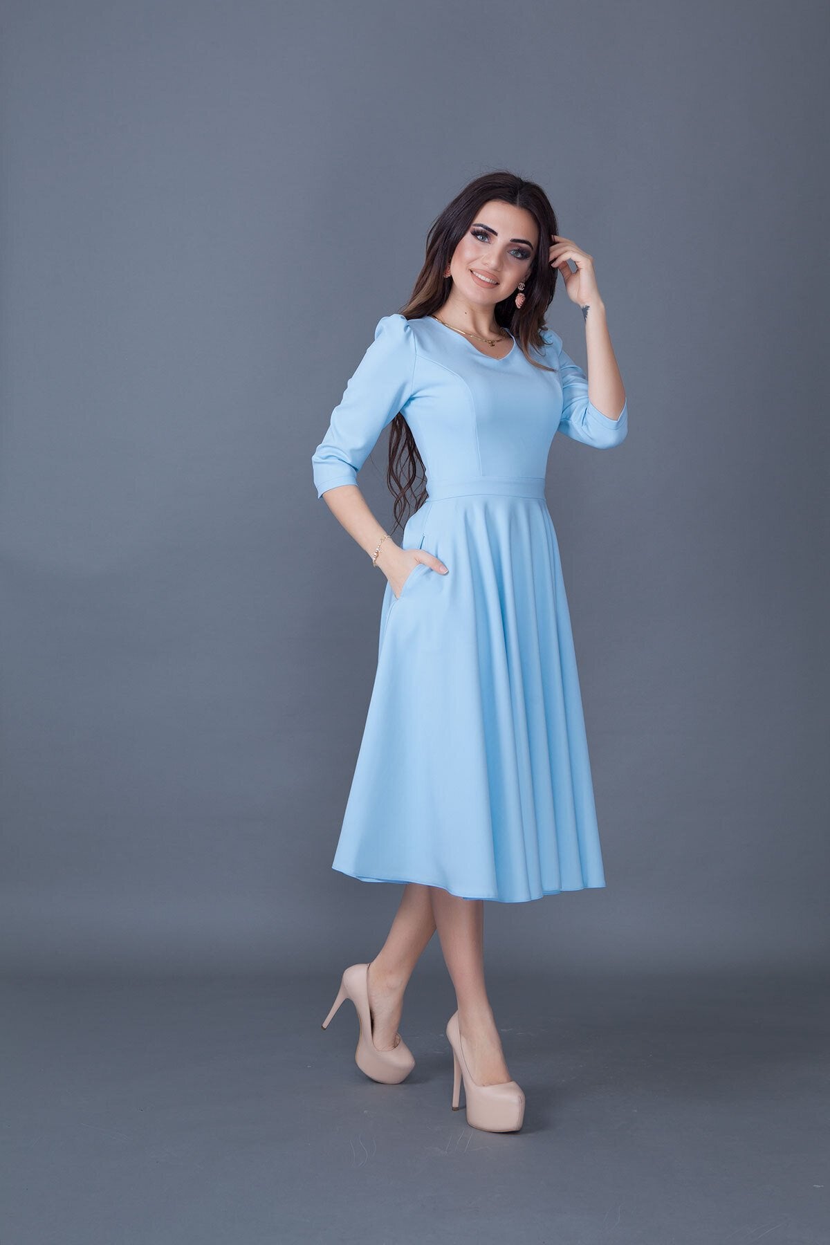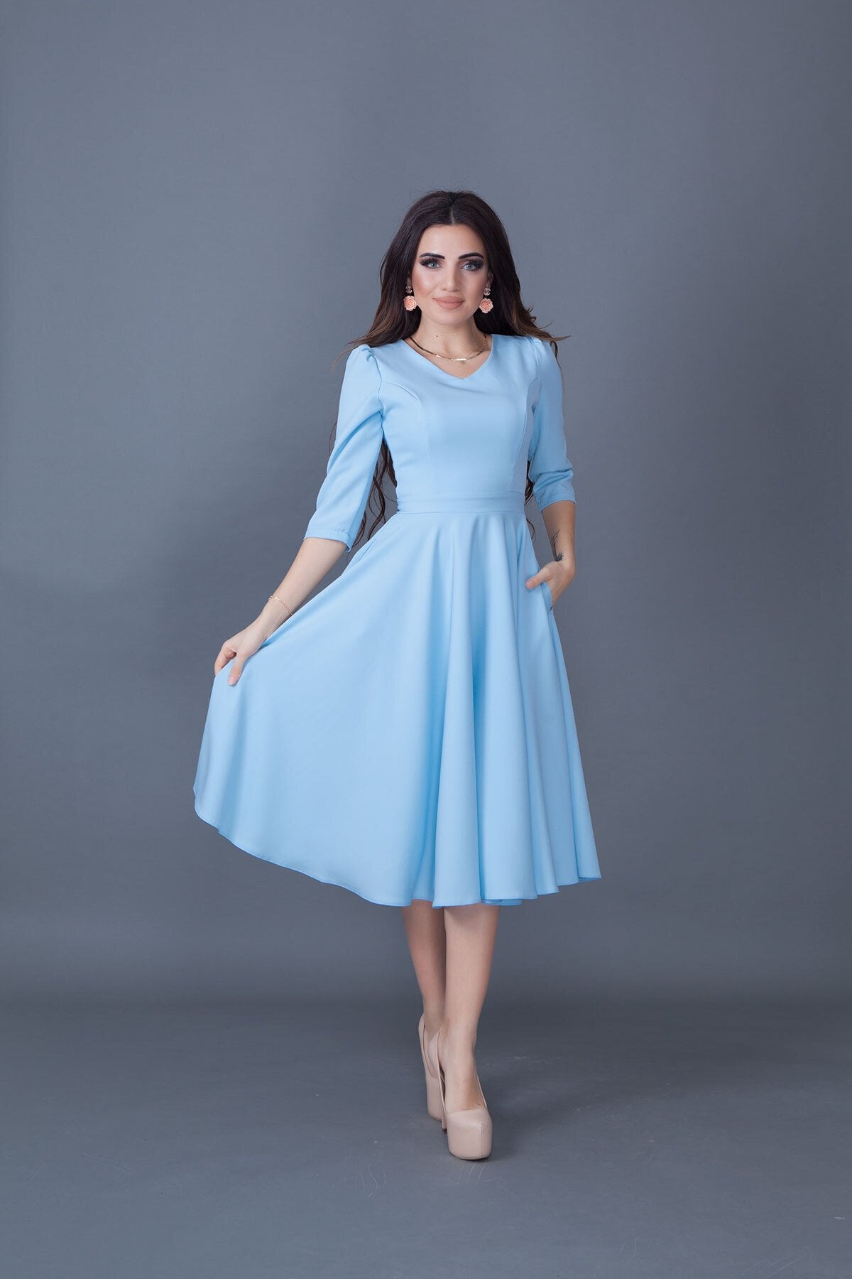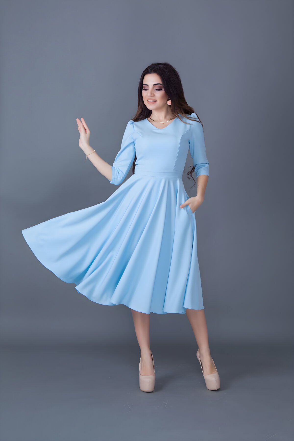 Midi Flared V-Neck Pocket Detail Dress - Blue