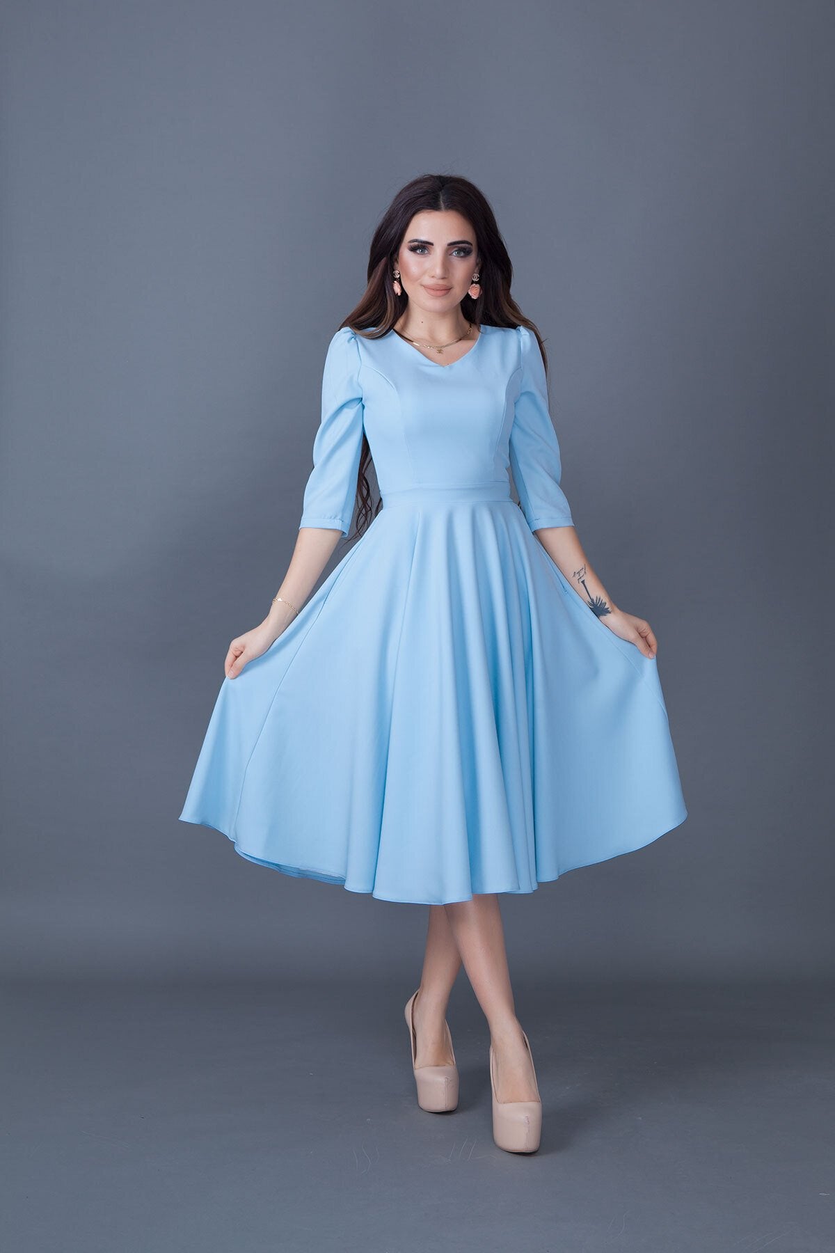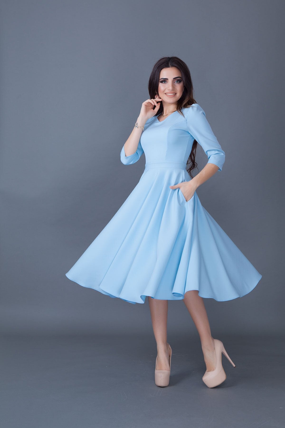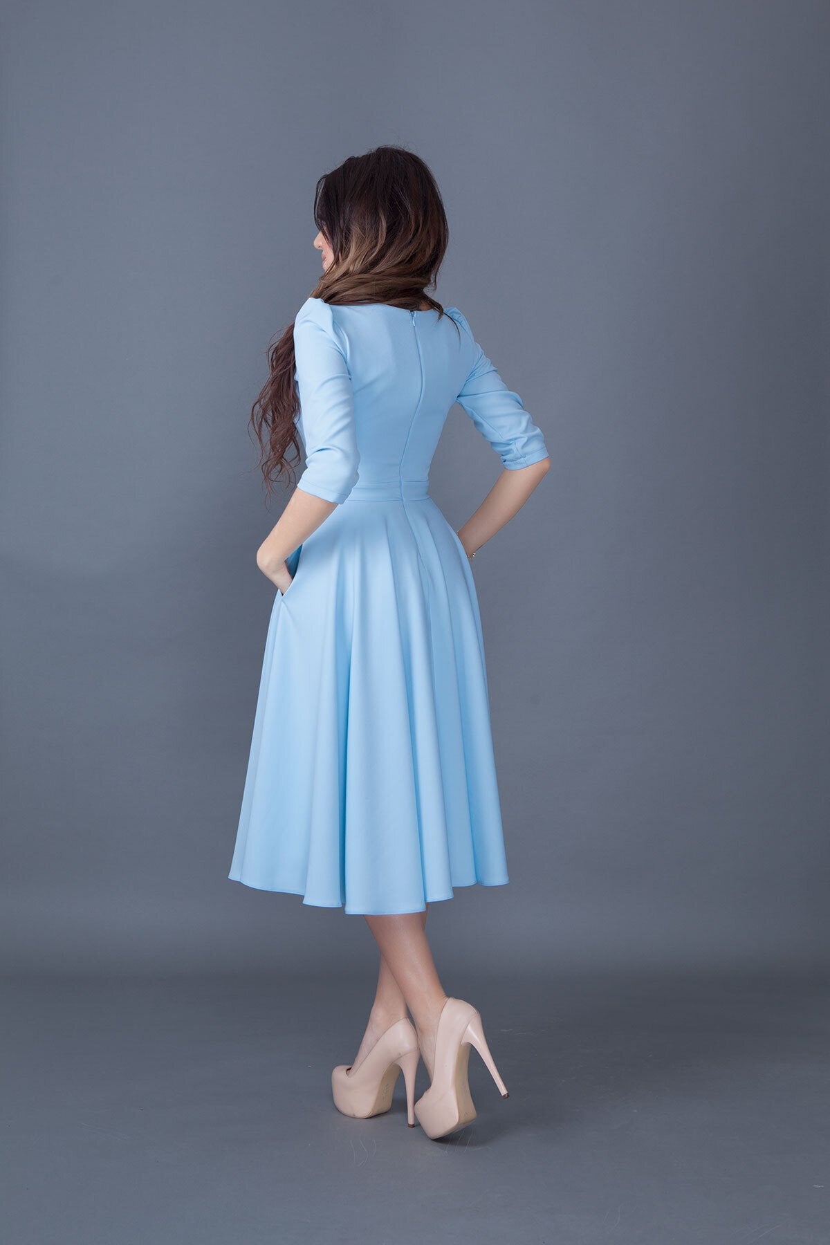 Midi Flared V-Neck Pocket Detail Dress - Blue