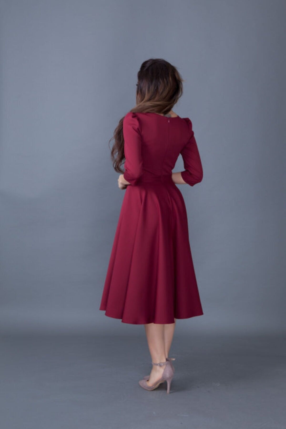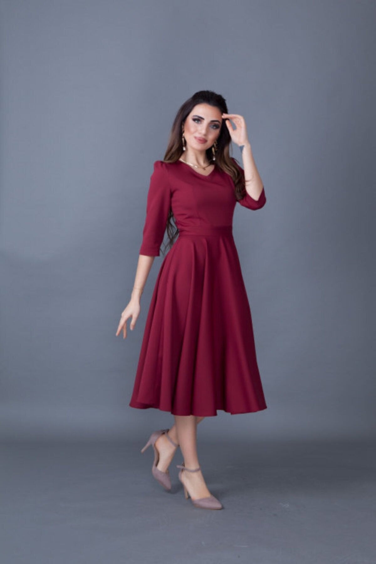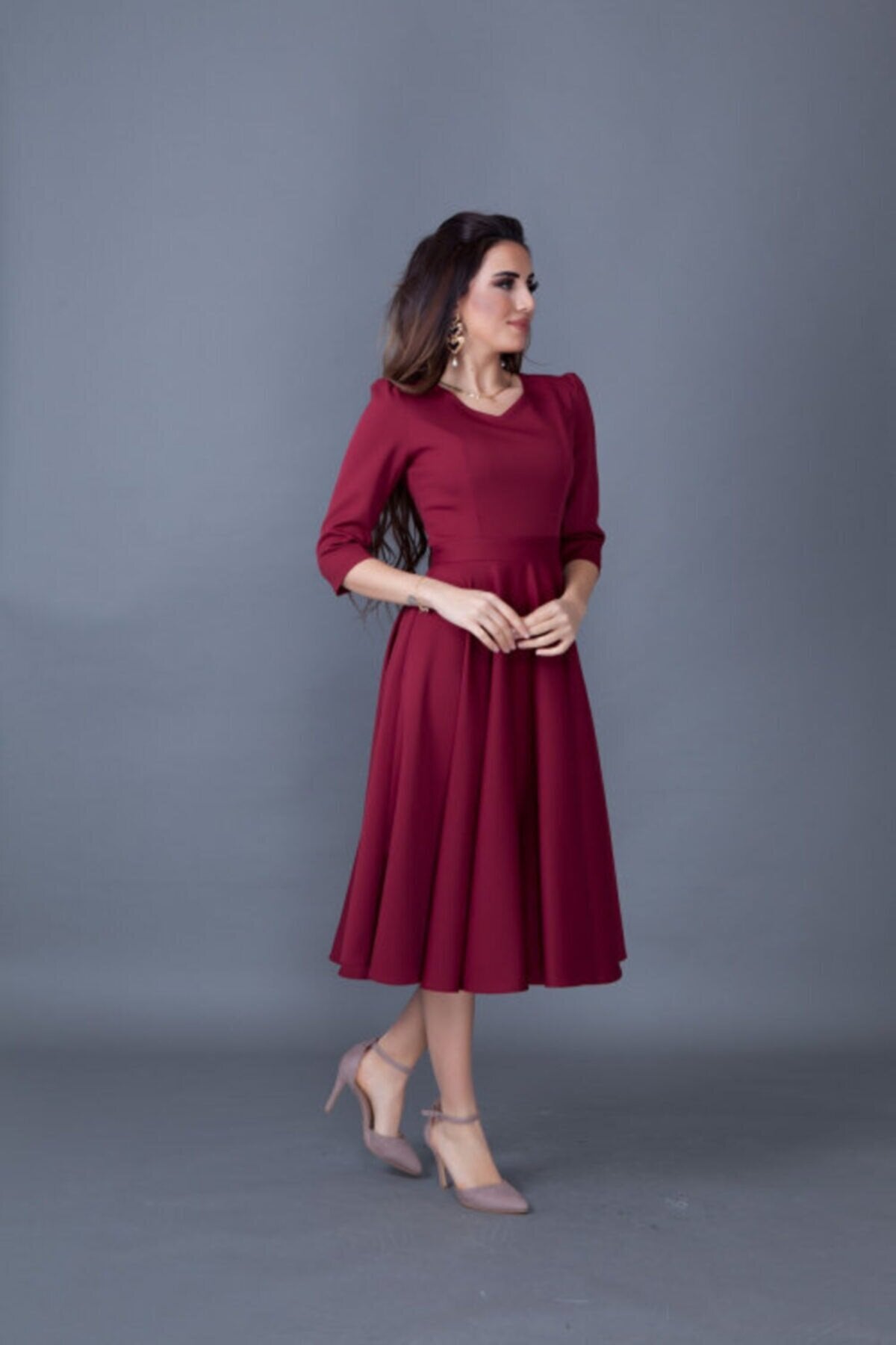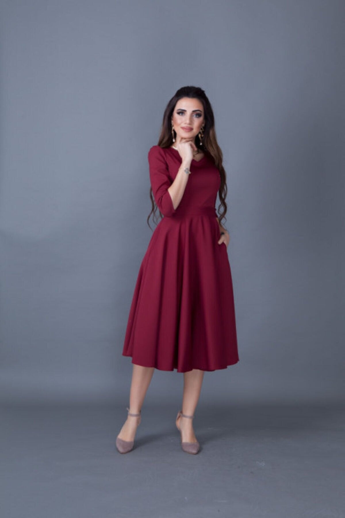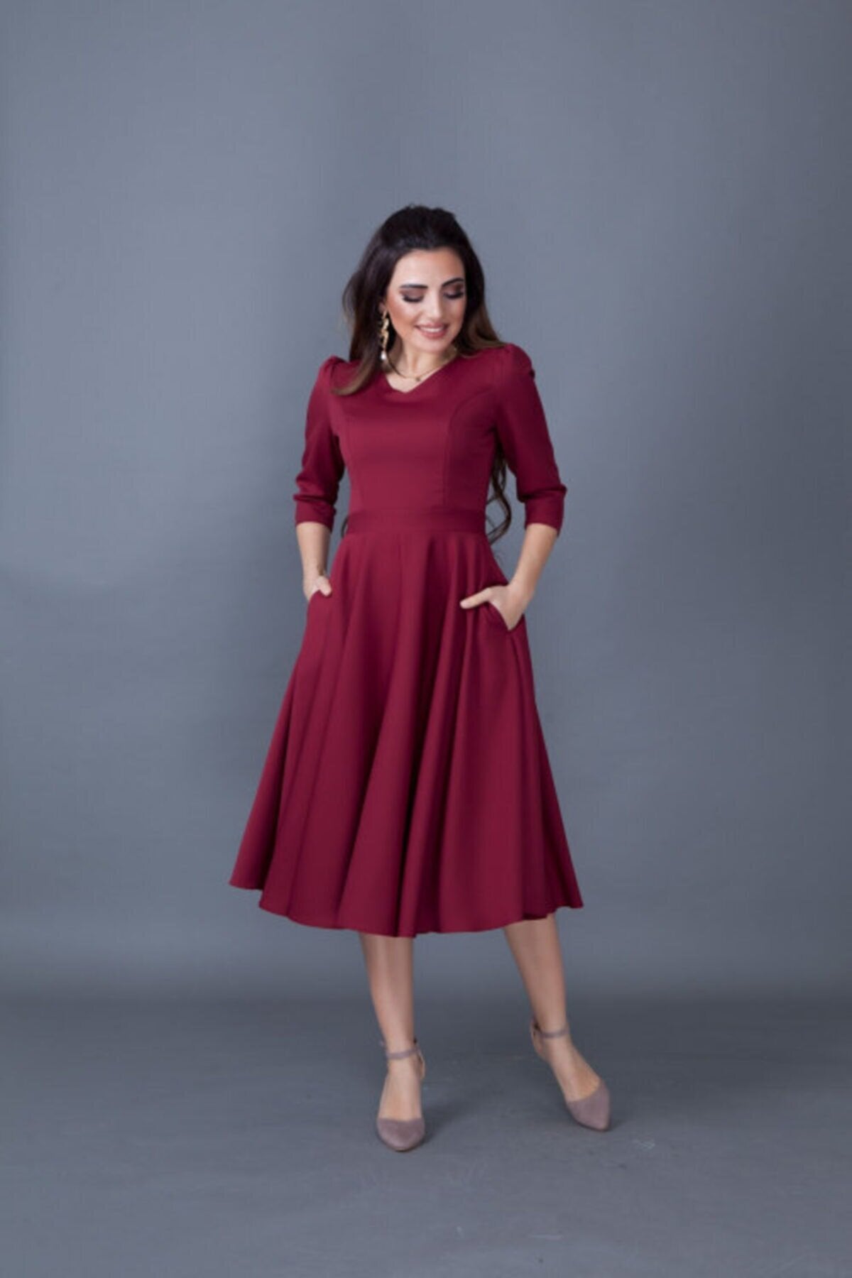 Midi Flared V-Neck Pocket Detail Dress - Burgundy