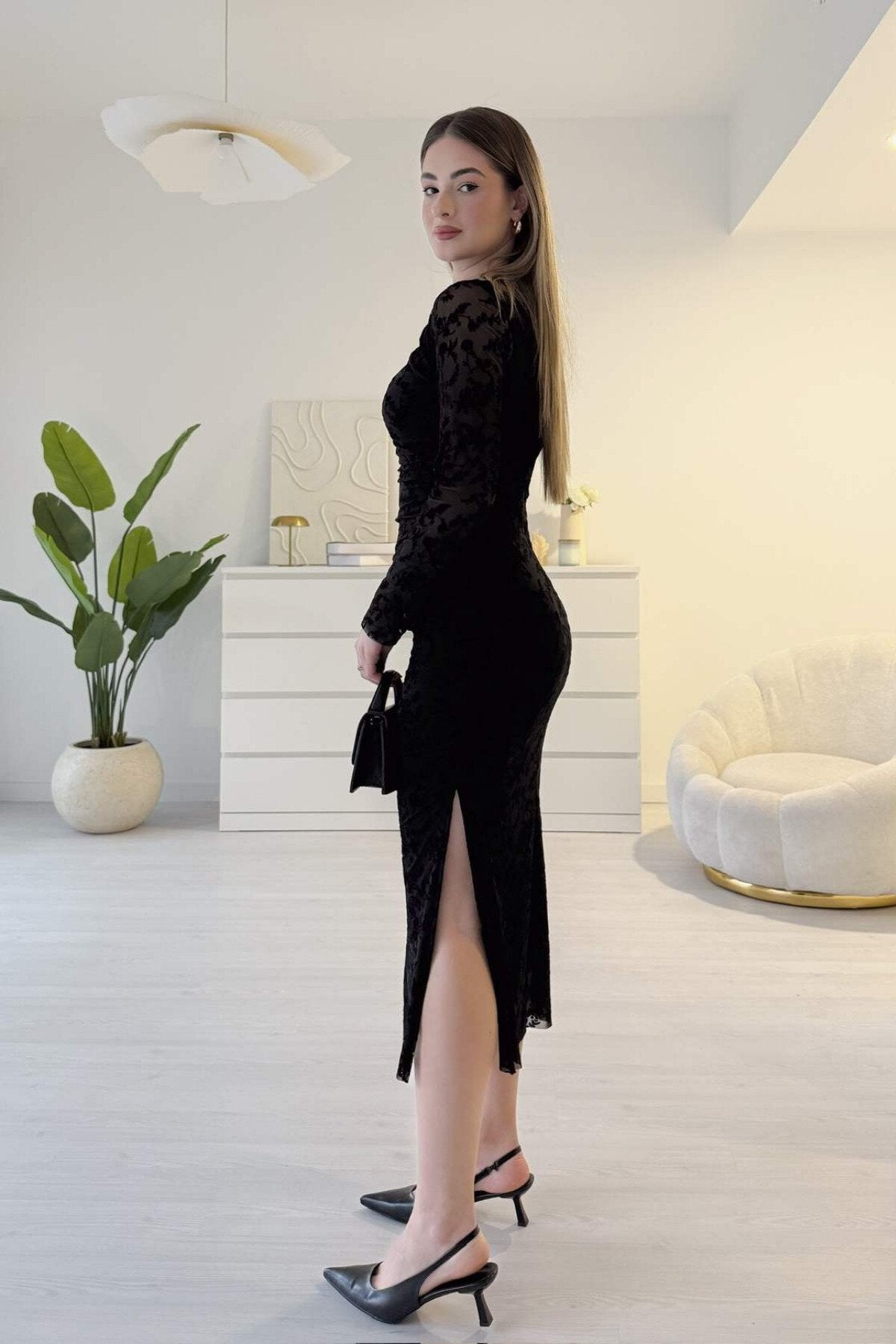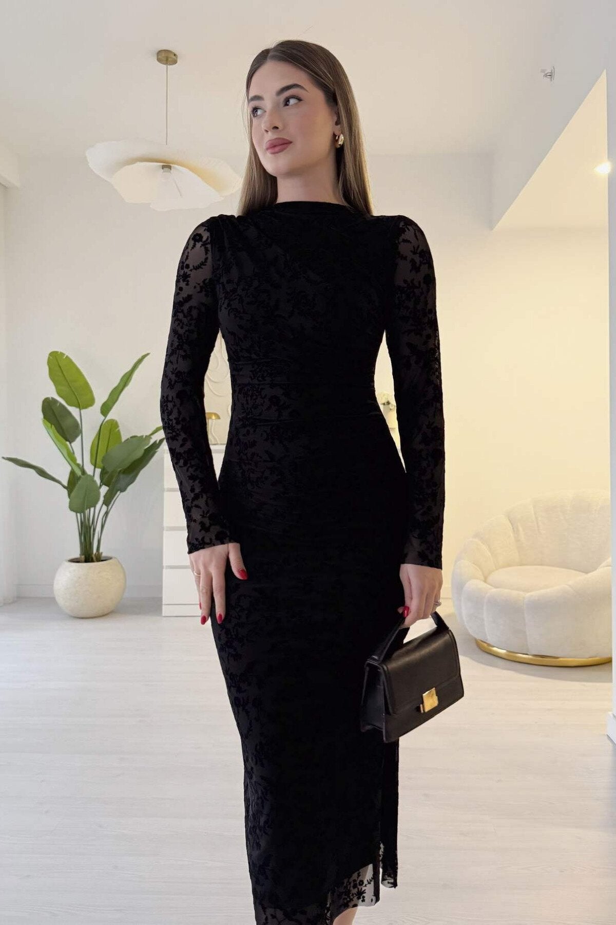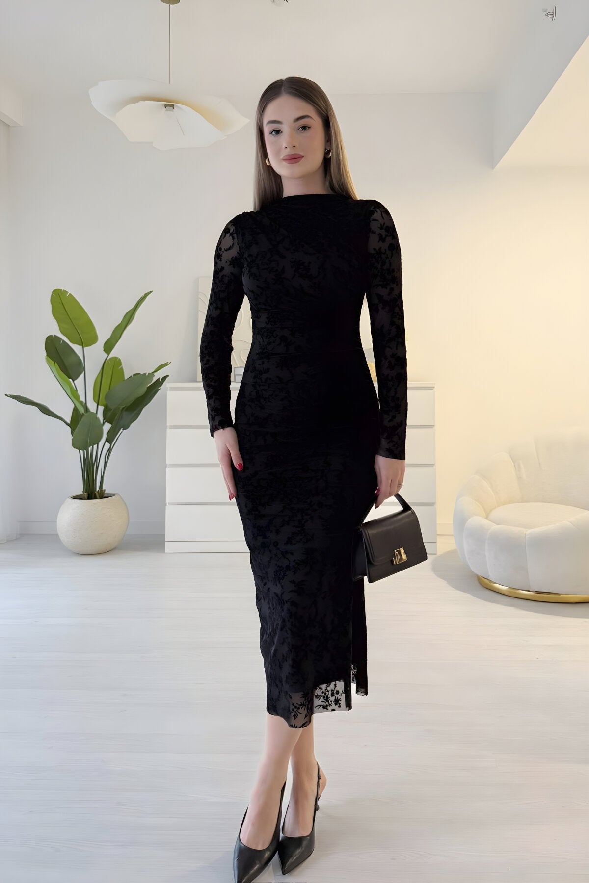 Midi Flocked Print Slit Shoulder Drape Detail Dress - Black