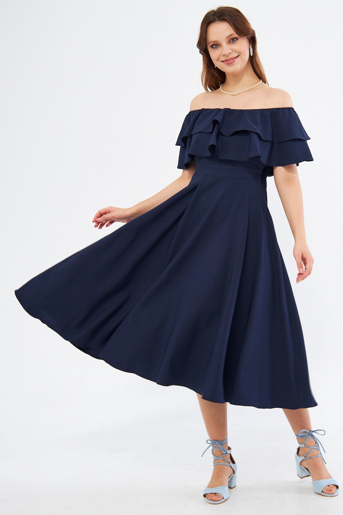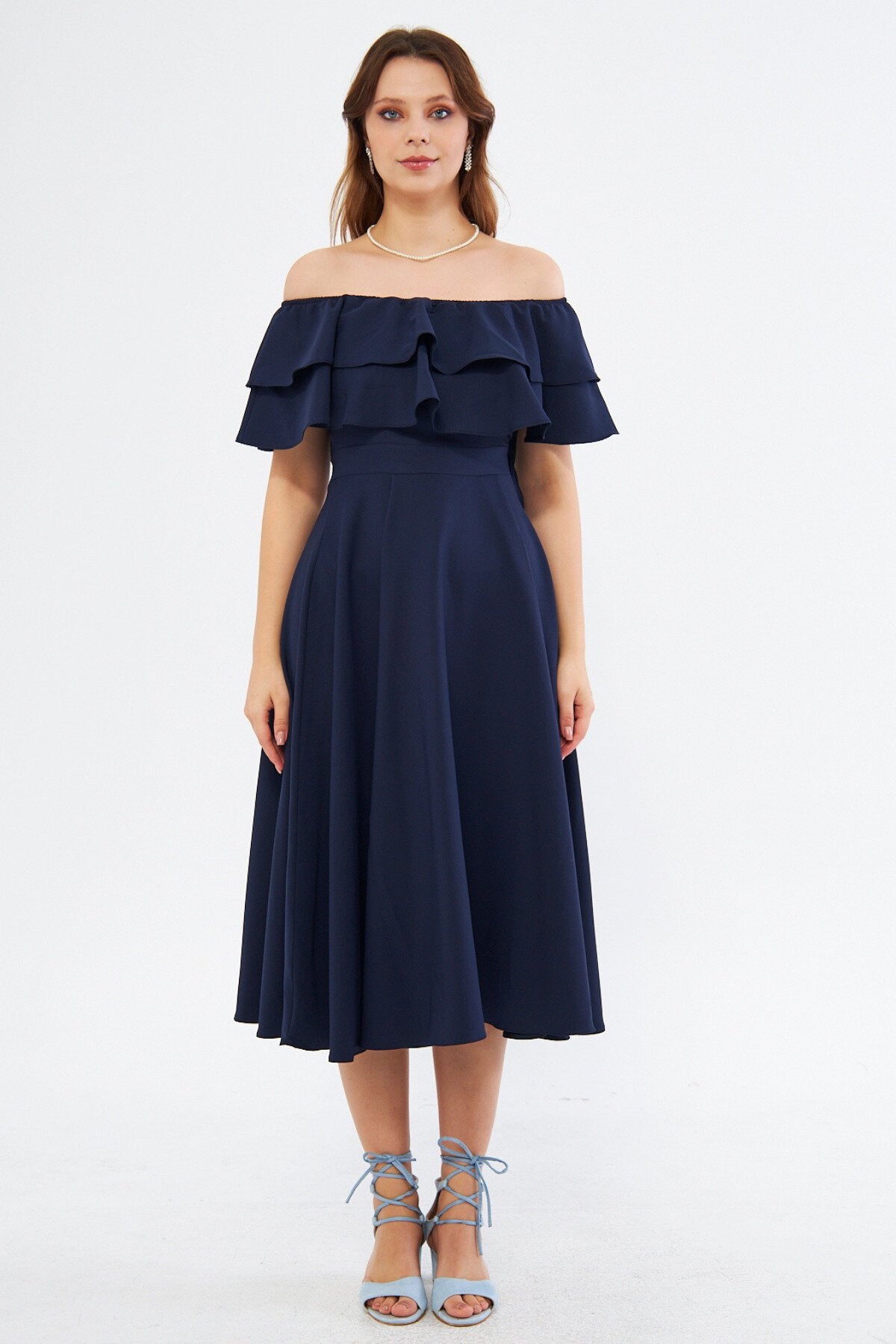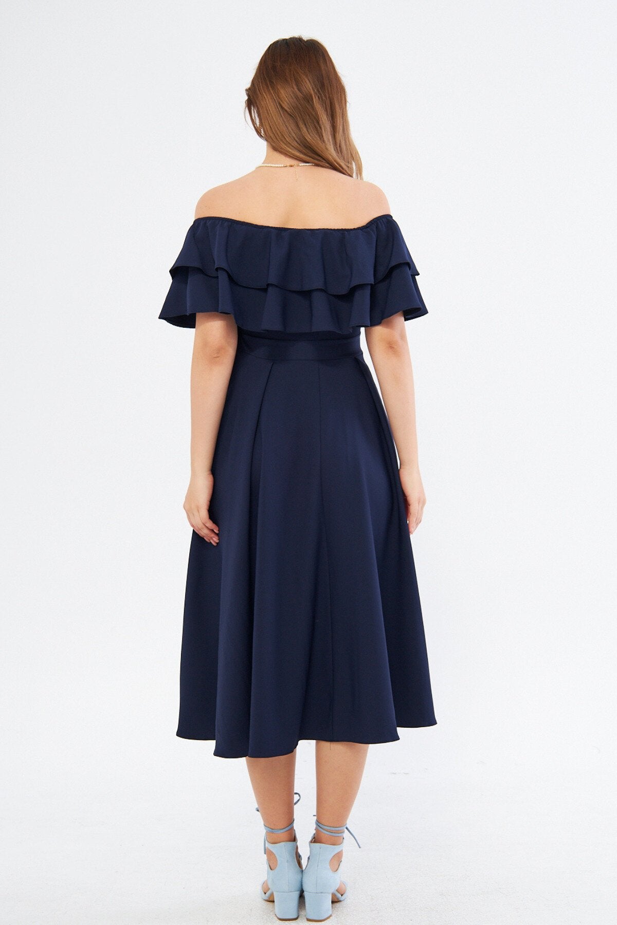 Midi Flowy Off-the-shoulder Ruffle Neck Evening Dress - Navy Blue