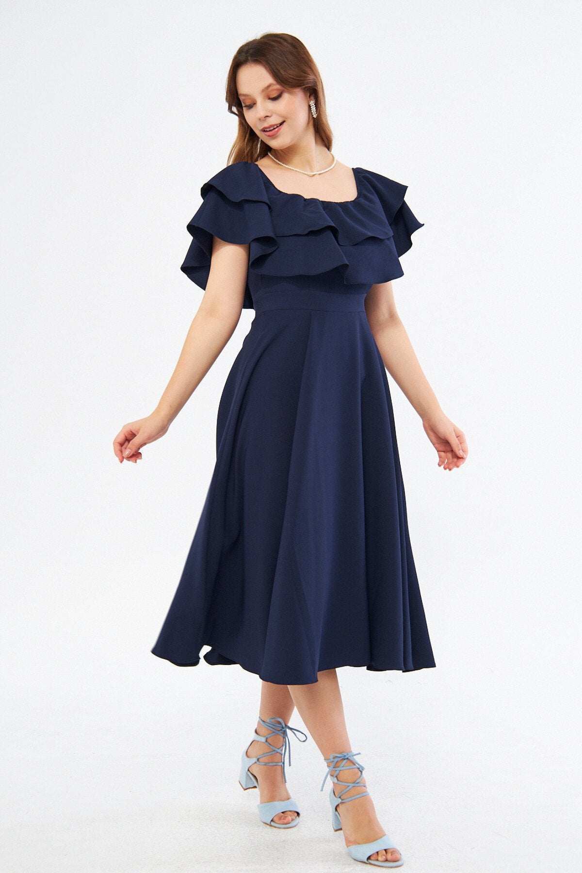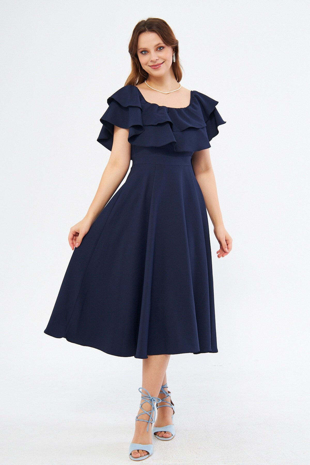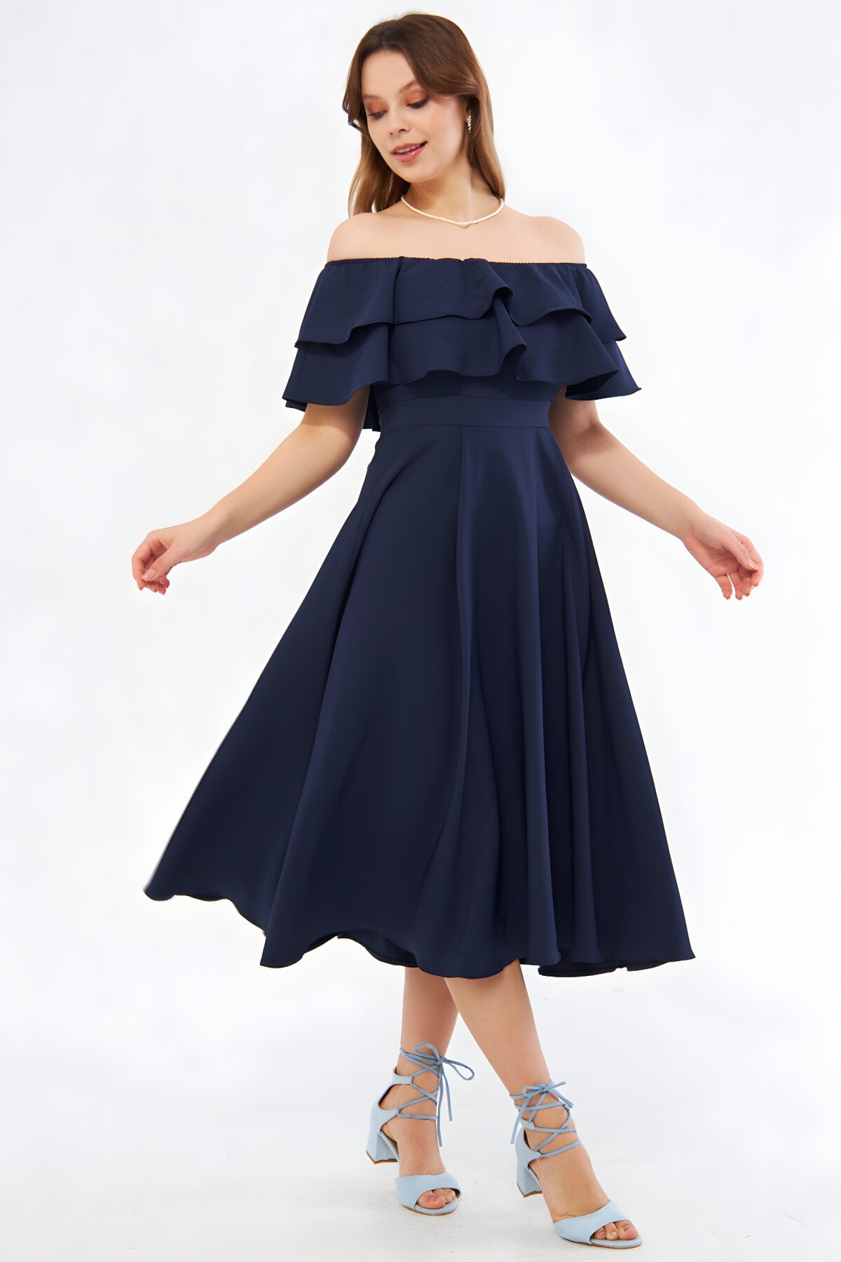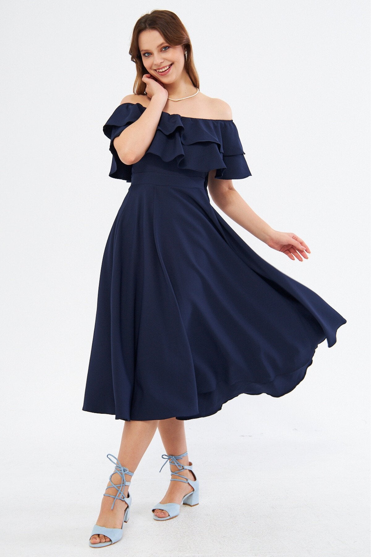 Midi Flowy Off-the-shoulder Ruffle Neck Evening Dress - Navy Blue