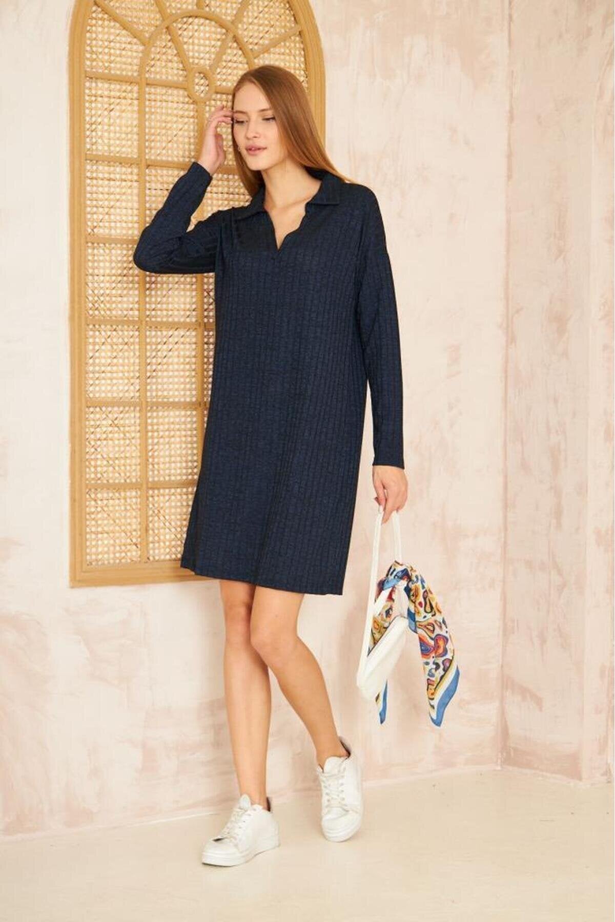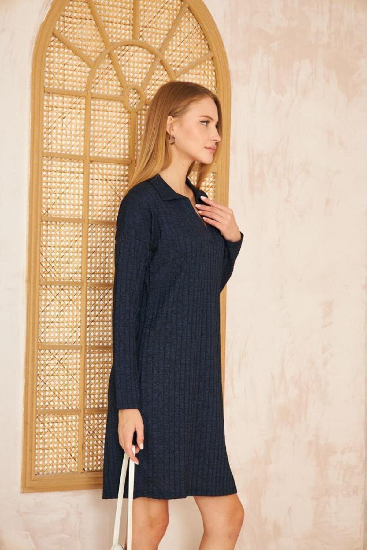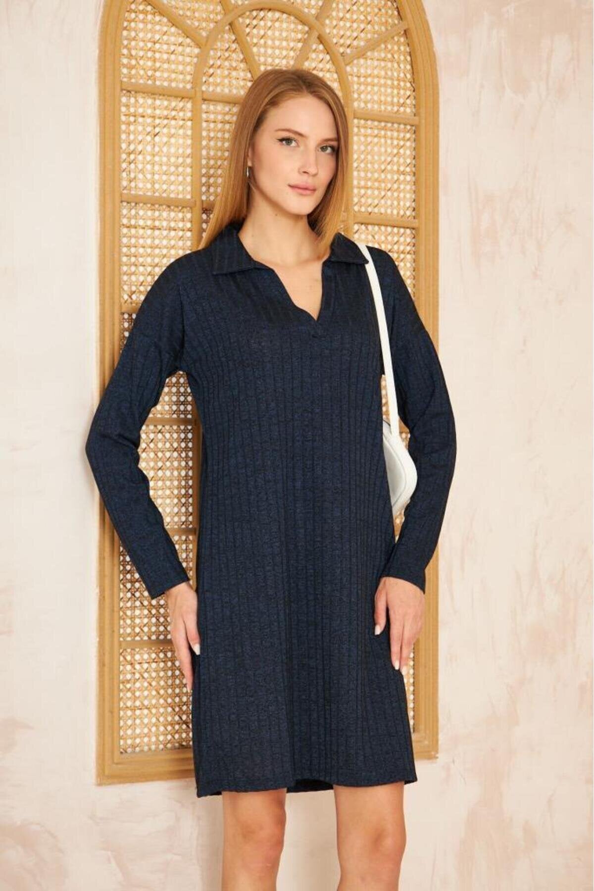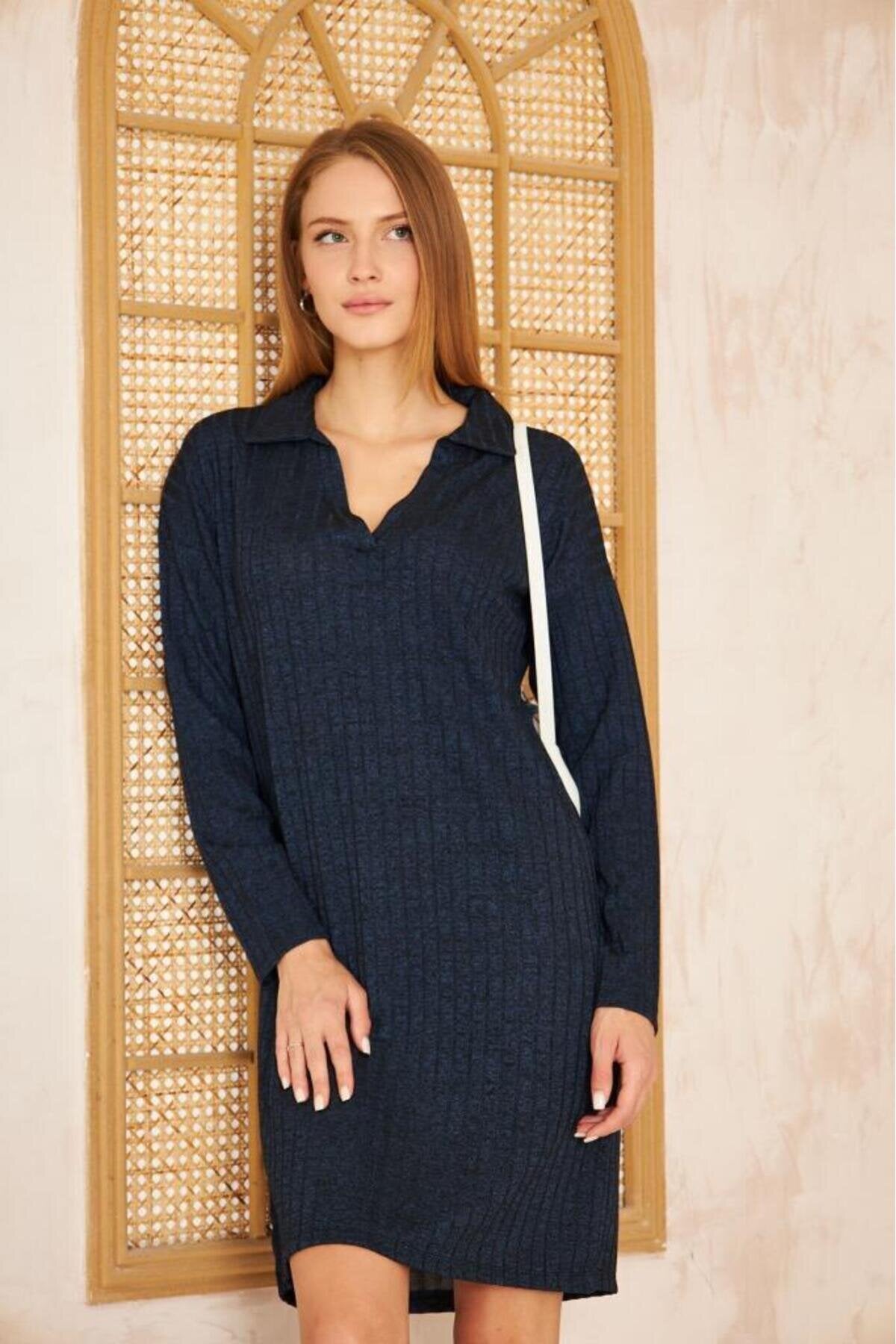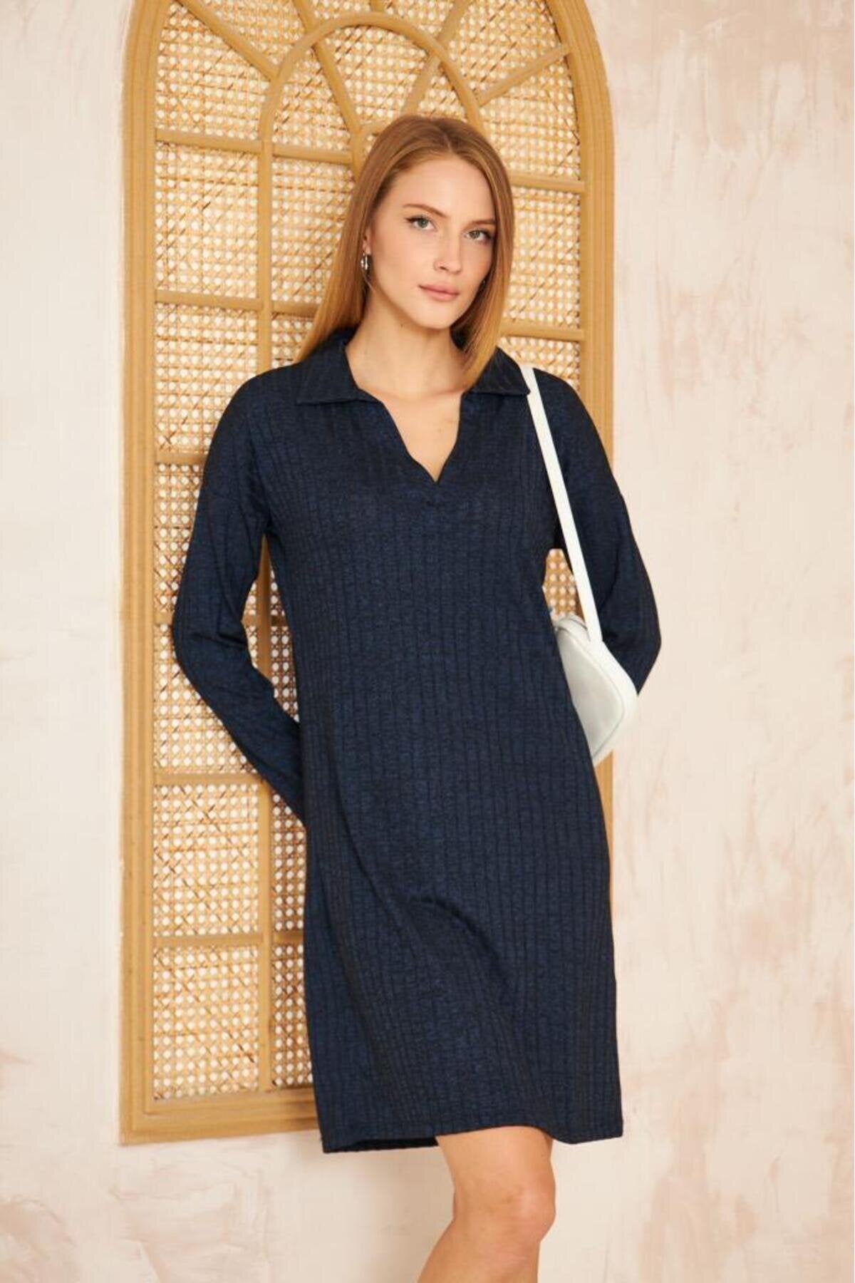Midi Long Sleeve Ribbed Knit Dress - Navy Blue